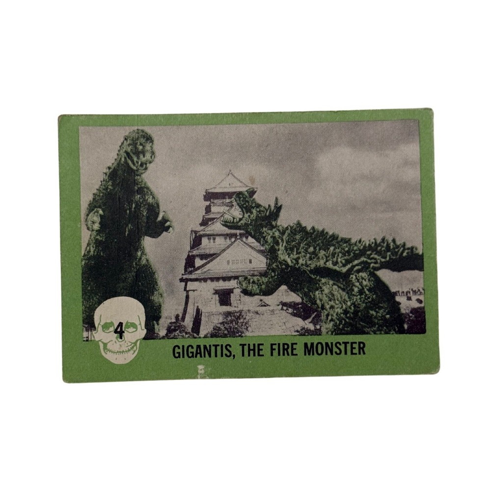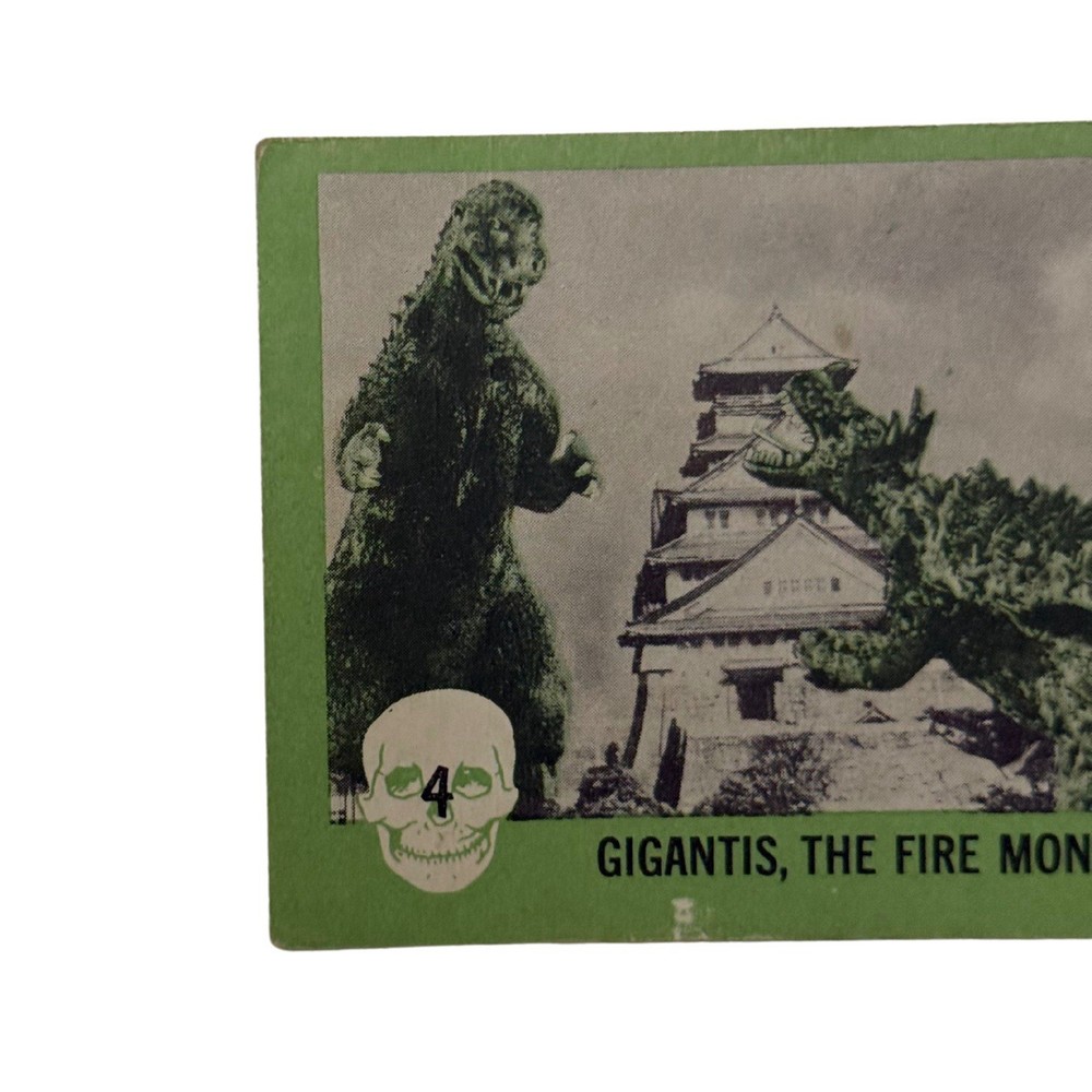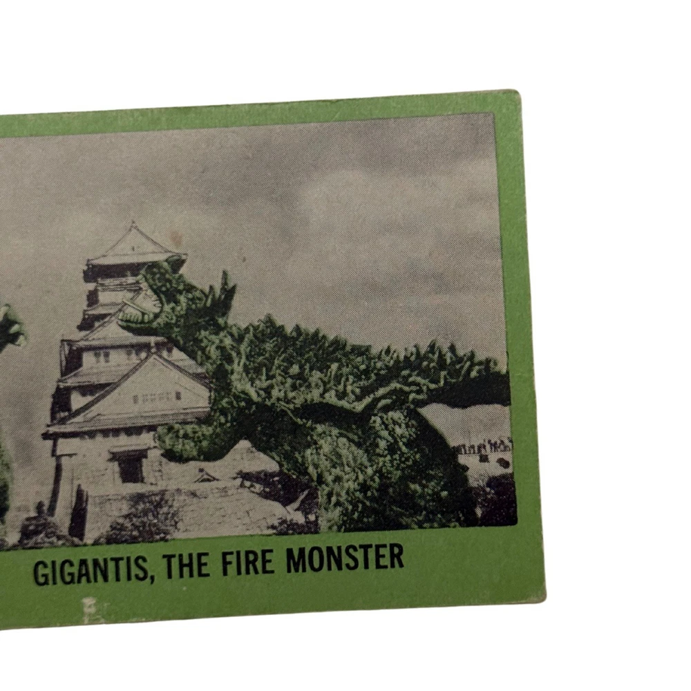 1961 Nu-Card Horror Monster #4 Gigantis the Fire Monster Card Vintage Please refer to the photos for exact item being sold. This is an original 1961 Nu-Card Horror Monster Series trading card, #4 titled “Gigantis, the Fire Monster.” It features an iconic battle scene with kaiju-style monsters destroying a Japanese castle, clearly referencing the U.S. re-titled version of Godzilla Raids Again (1955), known stateside as Gigantis, the Fire Monster. The back includes a classic “Horrible Joke” and horror-themed red border illustrations. The card comes in a protective sleeve with a top loader, ideal for display or long-term storage. Condition Report: • Corners: Moderate wear with soft rounding • Edges: Minor edge chipping and aging • Surface: Some visible print wear and tiny marks • Back: Clean, some age spots • Other Notes: Small printing imperfection near bottom edge Card shows moderate vintage wear with clean back and iconic kaiju imagery intact.