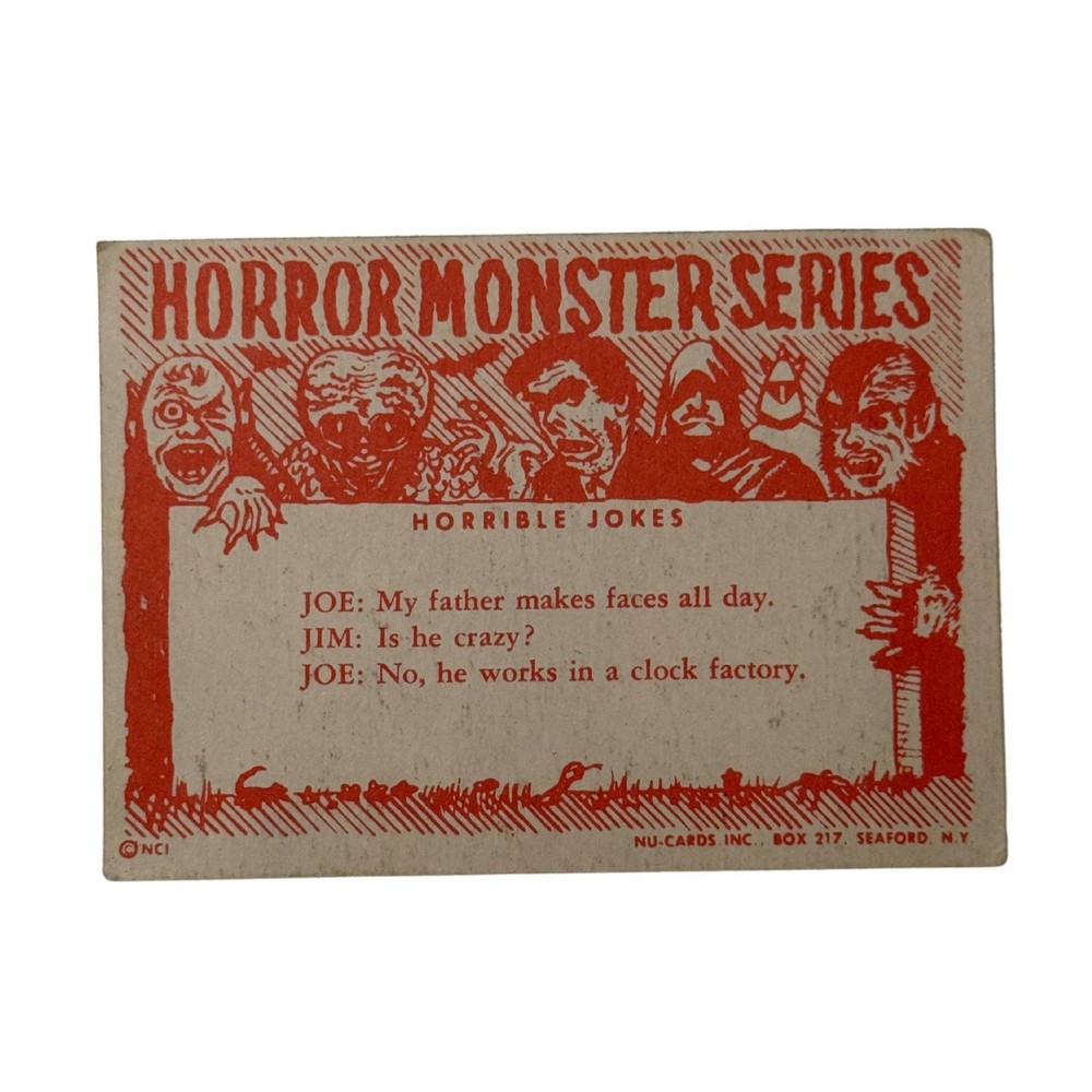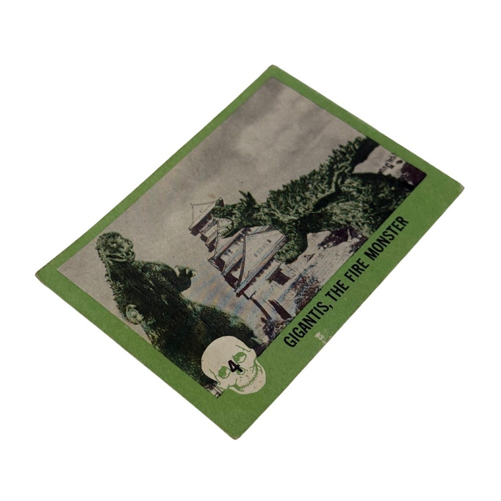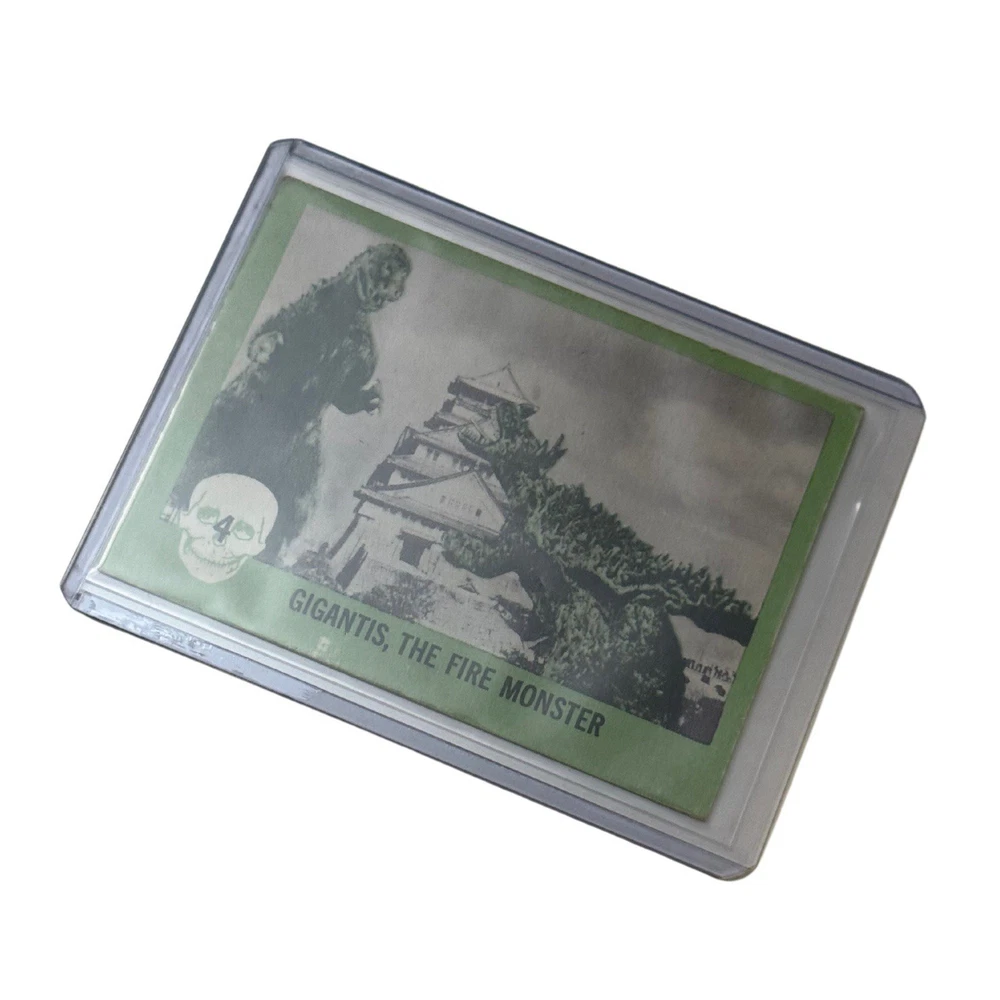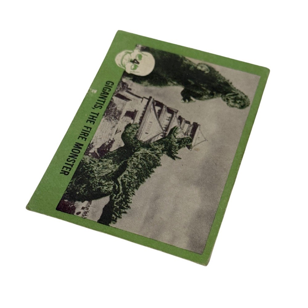 1961 Nu-Card Horror Monster #4 Gigantis the Fire Monster Card Vintage Please refer to the photos for exact item being sold. This is an original 1961 Nu-Card Horror Monster Series trading card, #4 titled “Gigantis, the Fire Monster.” It features an iconic battle scene with kaiju-style monsters destroying a Japanese castle, clearly referencing the U.S. re-titled version of Godzilla Raids Again (1955), known stateside as Gigantis, the Fire Monster. The back includes a classic “Horrible Joke” and horror-themed red border illustrations. The card comes in a protective sleeve with a top loader, ideal for display or long-term storage. Condition Report: • Corners: Moderate wear with soft rounding • Edges: Minor edge chipping and aging • Surface: Some visible print wear and tiny marks • Back: Clean, some age spots • Other Notes: Small printing imperfection near bottom edge Card shows moderate vintage wear with clean back and iconic kaiju imagery intact.
