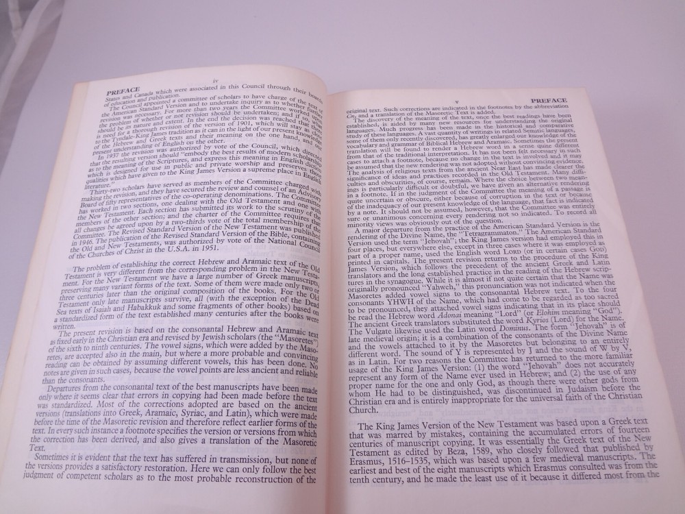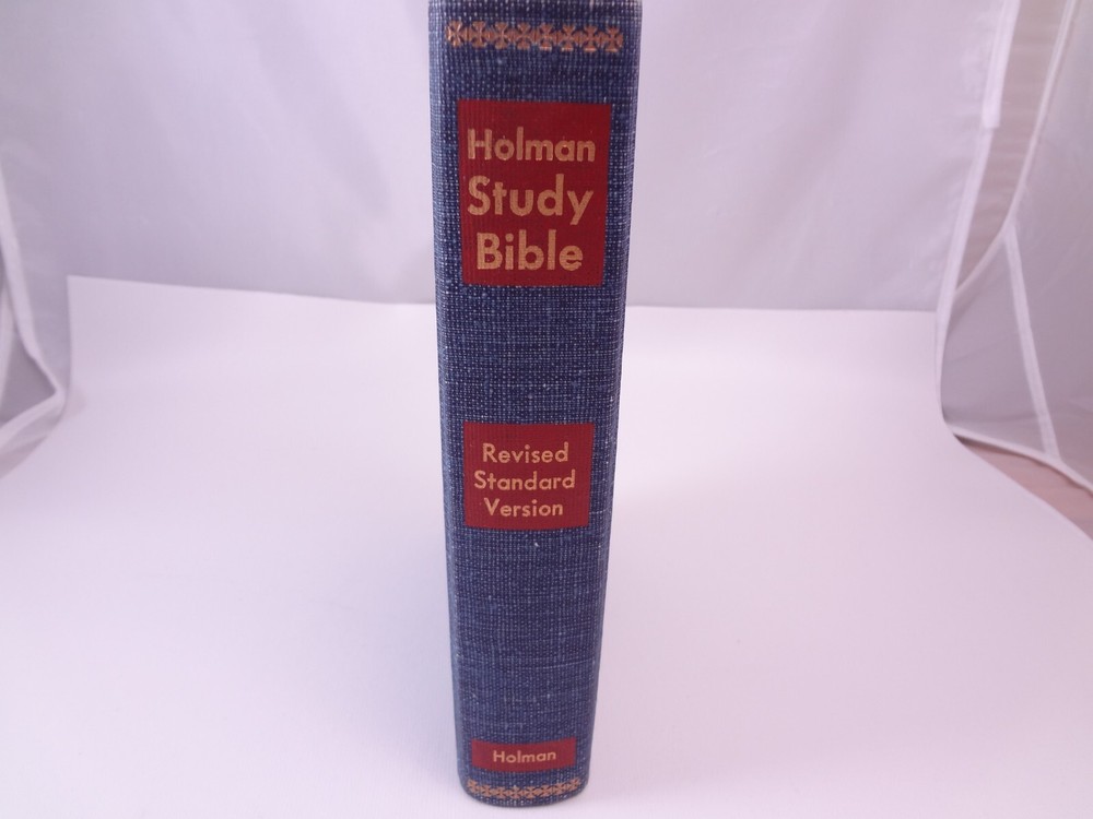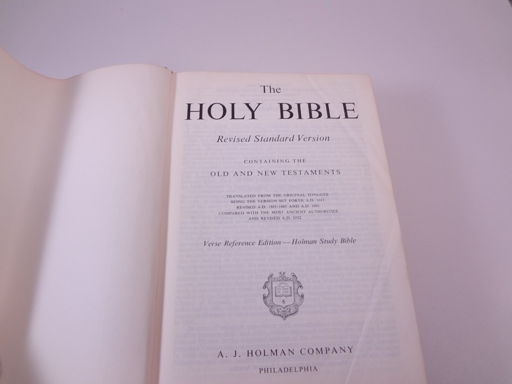 The 1962 Holman Study Bible RSV is a vintage, leather-bound Bible featuring a black Persian grain leather cover and back. This Revised Standard Version Bible is a comprehensive collection of religious texts suitable for all ages, with a focus on Bible studies, Christian history, and Christianity. Published by A.J. Holman, this Bible includes maps, verse references, and a jewel edition cover, making it a valuable resource for individuals seeking spiritual enlightenment and a deeper understanding of the teachings of Jesus Christ.