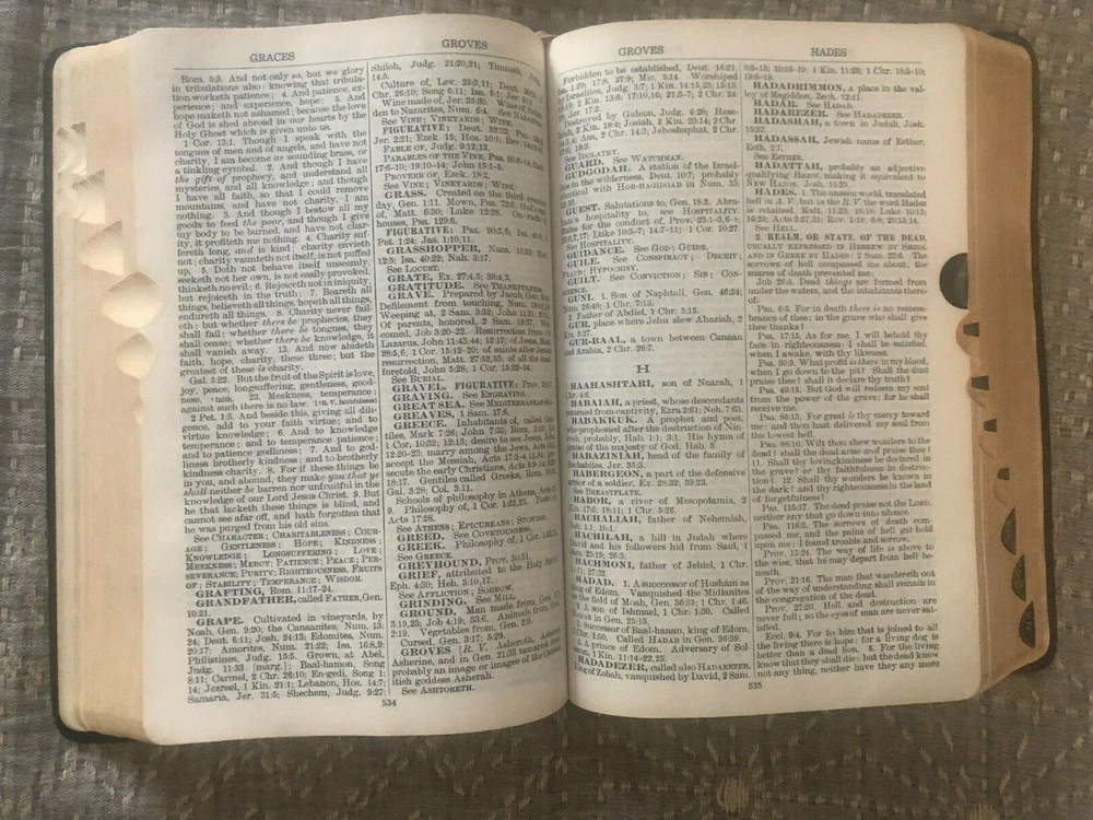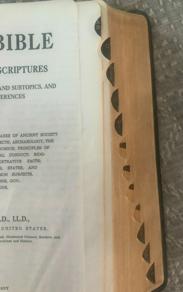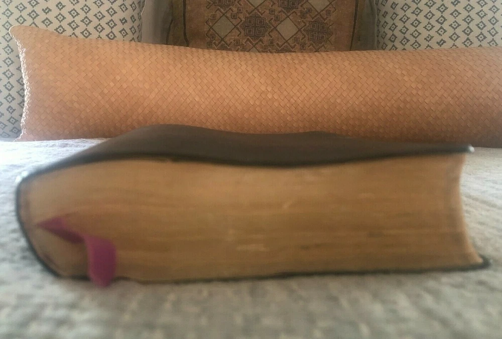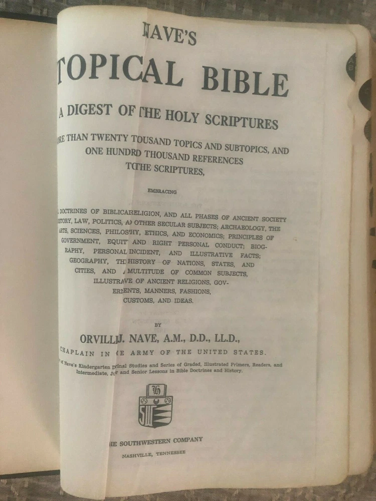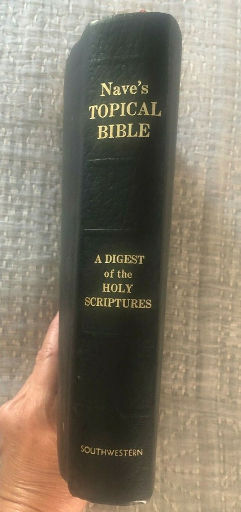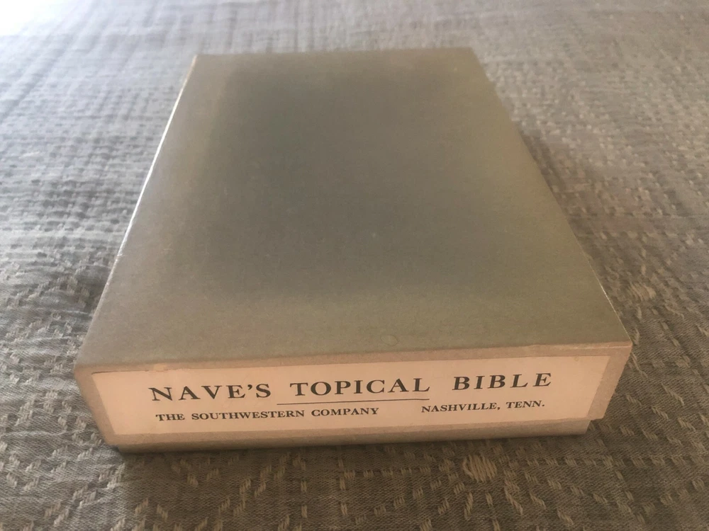 This Nave's Topical Bible from 1962 comes with its original box! No scent (smoke-free home) No marks or writing in the bible MEASUREMENTS (of box with bible inside) Length: 10 inches Width: 7 inches Height: 2 inches WEIGHS 2 pounds, 15 ounces NOTE FLAWS 1. 1 light-colored mark on back cover (see last photo) 2. Bible leans a bit to one side when lying flat (see 2nd-to-last photo) 3. Last pages of bible (blank personal notes section) have a bit of waving If you have questions or would like more photos, just ask RL
