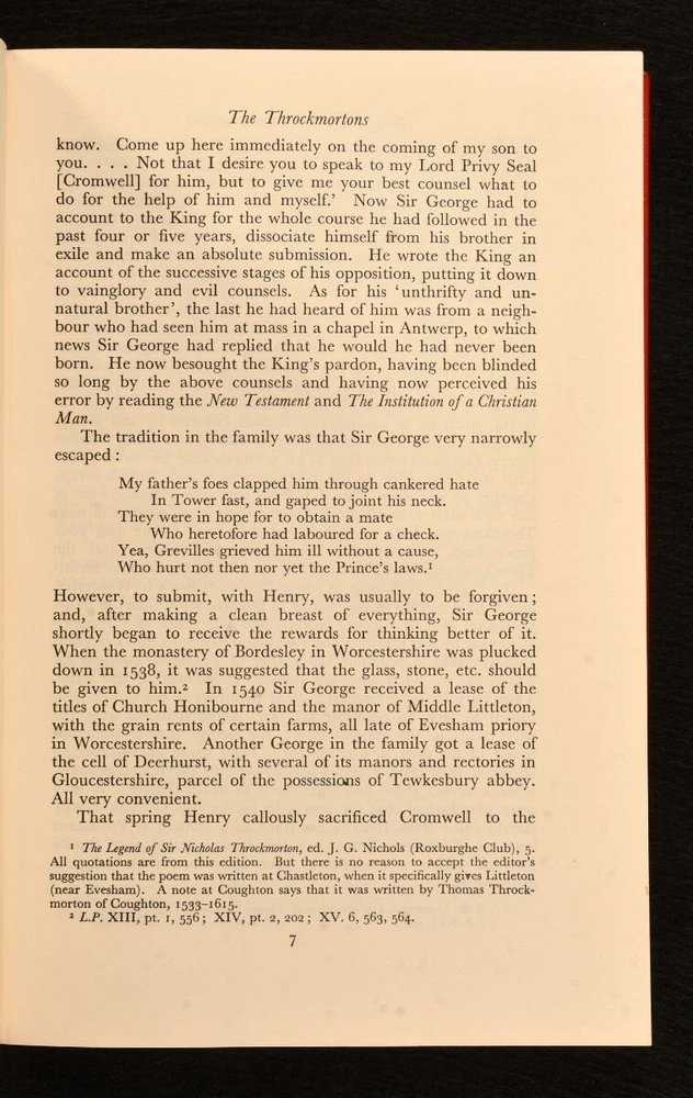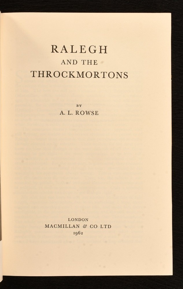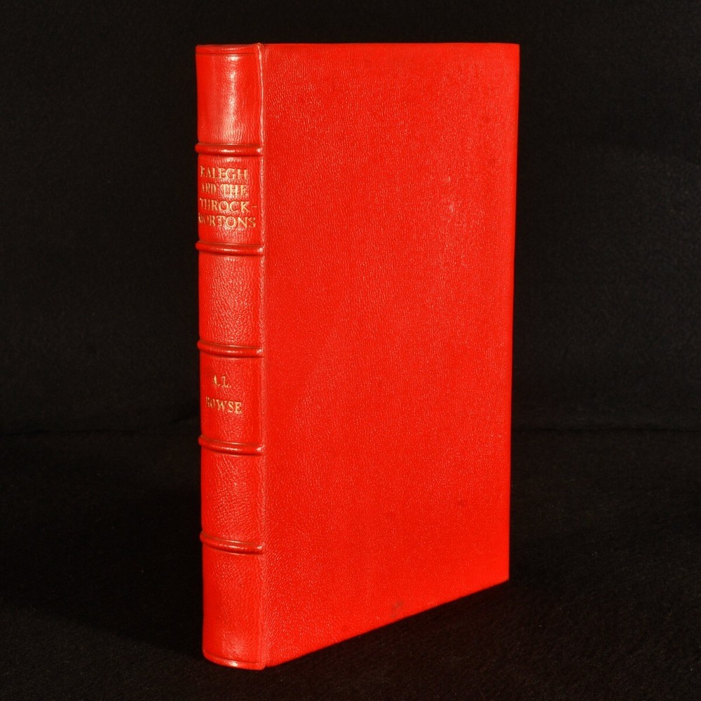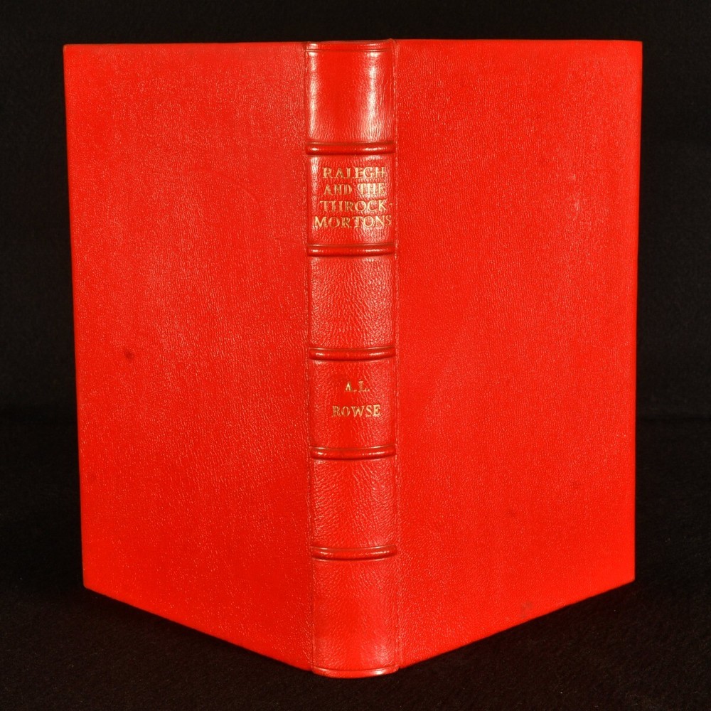Click here to see our other books! Ralegh and the Throckmortons A. L. Rowse 1962 Macmillan and Co. : London 9" by 6" xi, [1], 347, [1pp.] SUMMARY An elegantly bound copy of this interesting take on a biography of Sir Walter Raleigh, with insightful information taken from the diary of Raleigh's brother-in-law. Early Edition,Illustrated,Leather Binding Overall Condition: Near Fine This book weighs 1 KG when packed UK Postage: £ 3.99 US Postage: £ 22.99 EU Postage : £ 16.99 European Postage: £ 17.99 Asia Postage: £ 22.99 Worldwide Postage: £ 28.99 DESCRIPTION The second impression. Published the month after the first edition. Bound in a wonderful red full crushed morocco. This interesting take on the life of celebrated Elizabethan statesman and explorer, Sir Walter Raleigh, is largely inspired by the diaries of Raleigh's brother-in-law, Sir Arthur Throckmorton. Written by English historian A. L. Rowse. Raleigh secretly married Elizabeth Throckmorton, Arthur's sister and a Gentlewoman to the Privy Chamber to Queen Elizabeth I, a match which was fiercely opposed by the monarch, leading to a long period of disfavour for both Raleigh and his new wife. This biographical work surrounds the Throckmorton and Raleigh families. With fourteen photographic depictions and a frontispiece, including images of Throckmorton's original diaries. With the morocco bookplate of W.A. Foyle of Beeleigh Abbey to the front pastedown. William Foyle founded Foyles bookshop in 1903 alongside his brother. He purchased Beeleigh Abbey during the Second World War, an impressive twelfth century monastery in Essex. Beeleigh housed his library, one of the largest private libraries in England. CONDITION Bound in a red full crushed morocco. Externally, lovely, with the odd mark to leather. Bookplate to the front paste down. Internally, firmly bound with bright, clean pages. Overall Condition: Near Fine GLOSSARY OF TERMS Overall Condition (Dustwrapper condition rating is shown after that for the book itself, where a dustwrapper is present) Fine - Very well preserved copy showing very little wear Very Good Indeed - Only one or two minor faults, really a very attractive copy Very Good - Quite a wide term meaning no major faults but probably several smaller ones often expected given the age of the book, but still a respectable copy Good - Meaning not very good. Some more serious faults as will be described in the condition report under 'condition' Good Only - Meaning one or more faults that could really do with repair Fair - As with good only above but with other faults leaving a compromised copy even after repair Poor - Really bad and possibly seriously incomplete. We only sell books in this condition where their rarity or value makes them attractive none the less. Major defects will be described. GUARANTEE We offer a full money back guarantee on our descriptions. Please ask for details and conditions. We prefer PAYPAL. If you pay via PAYPAL we will post the item off the same or the next working day with the postage you have selected. Please note we cannot accept USD cheques