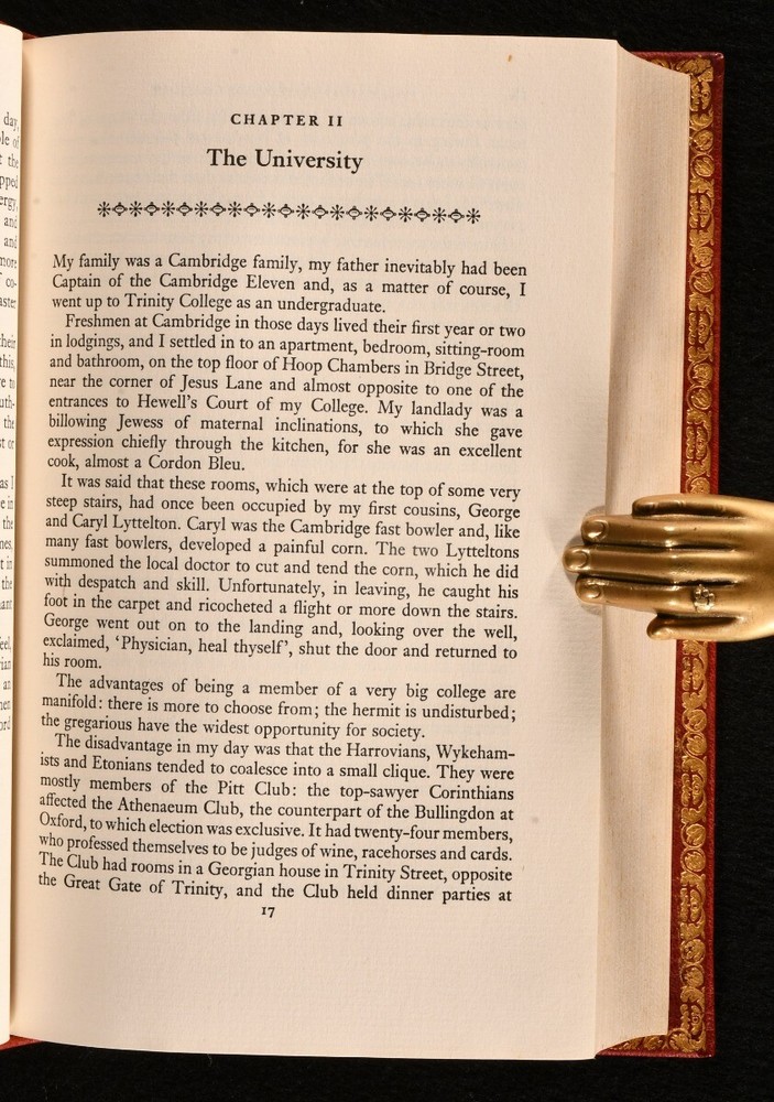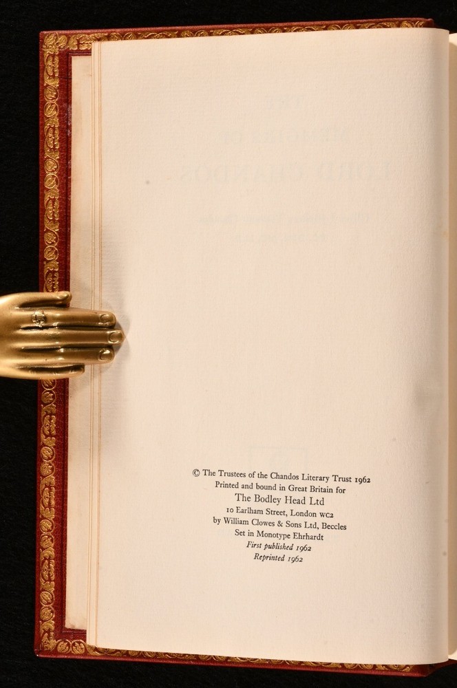 Click here to see our other books! The Memoirs of Lord Chandos Oliver Lyttelton; Lord Chandos 1962 The Bodley Head : London 8.5" by 5.5" [6], vii-xvi, 446pp SUMMARY A finely bound copy of the exciting memoirs of Oliver Lyttelton, recounting hs time spent working in the government during the Second World War. Fine Binding,First Edition,Illustrated,Leather Binding,Signed Binding Overall Condition: Near Fine This book weighs 1 KG when packed UK Postage: £ 3.99 US Postage: £ 22.99 EU Postage : £ 16.99 European Postage: £ 17.99 Asia Postage: £ 22.99 Worldwide Postage: £ 28.99 DESCRIPTION The first edition, second impression of this work. In a signed binding by Harry Bailey & Raymond Whitaker. The memoirs of Oliver Lyttelton, the 1st Viscount Chandos. Chandos held prominent ministerial posts during the Second World War, being an important figure in the war effort. Illustrated with two maps. CONDITION In a full morocco binding by Harry Bailey & Raymond Whitaker. Externally, smart. with some light marks to the boards. Spine is a little faded. The odd spot to the fore edge and paste downs. Internally, firmly bound. pages are bright and clean. Overall Condition: Near Fine GLOSSARY OF TERMS Overall Condition (Dustwrapper condition rating is shown after that for the book itself, where a dustwrapper is present) Fine - Very well preserved copy showing very little wear Very Good Indeed - Only one or two minor faults, really a very attractive copy Very Good - Quite a wide term meaning no major faults but probably several smaller ones often expected given the age of the book, but still a respectable copy Good - Meaning not very good. Some more serious faults as will be described in the condition report under 'condition' Good Only - Meaning one or more faults that could really do with repair Fair - As with good only above but with other faults leaving a compromised copy even after repair Poor - Really bad and possibly seriously incomplete. We only sell books in this condition where their rarity or value makes them attractive none the less. Major defects will be described. GUARANTEE We offer a full money back guarantee on our descriptions. Please ask for details and conditions. We prefer PAYPAL. If you pay via PAYPAL we will post the item off the same or the next working day with the postage you have selected. Please note we cannot accept USD cheques