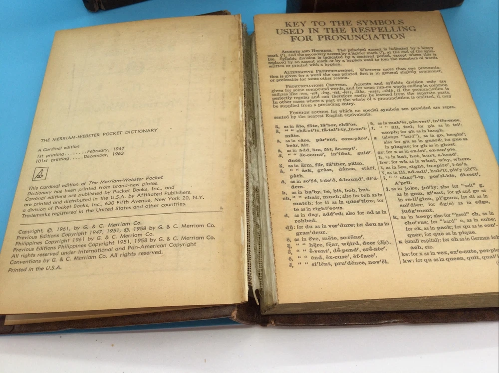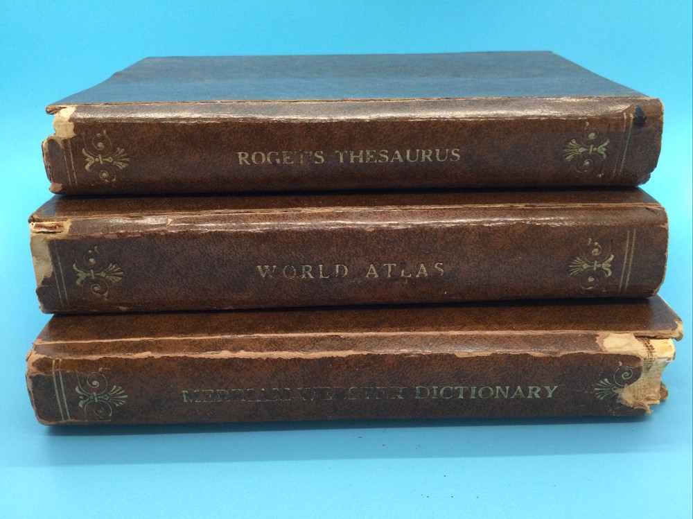 1963 Merriam-Webster Pocket Dictionary Thesaurus Atlas Top Grain Cowhide Books. All three books show wear including wear to the leather and torn bindings. Pages are intact and readable. Over all the books are in poor / fair condition. Our Shipping Guidelines We use USPS (United States Postal Service). We generally ship within 1 business day. Examples: You pay for an item on Tuesday: we will ship it out before the end of the day on Wednesday. If you pay for an item on Friday through Sunday, we have until the end of the day Monday to ship the item (according to eBay guidelines).