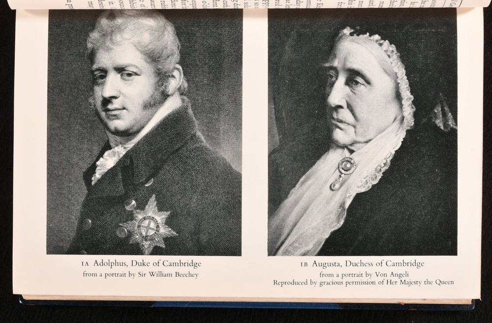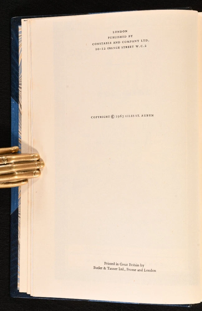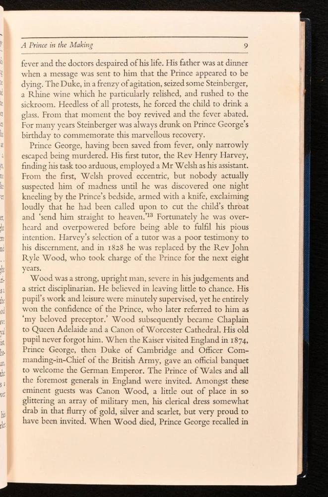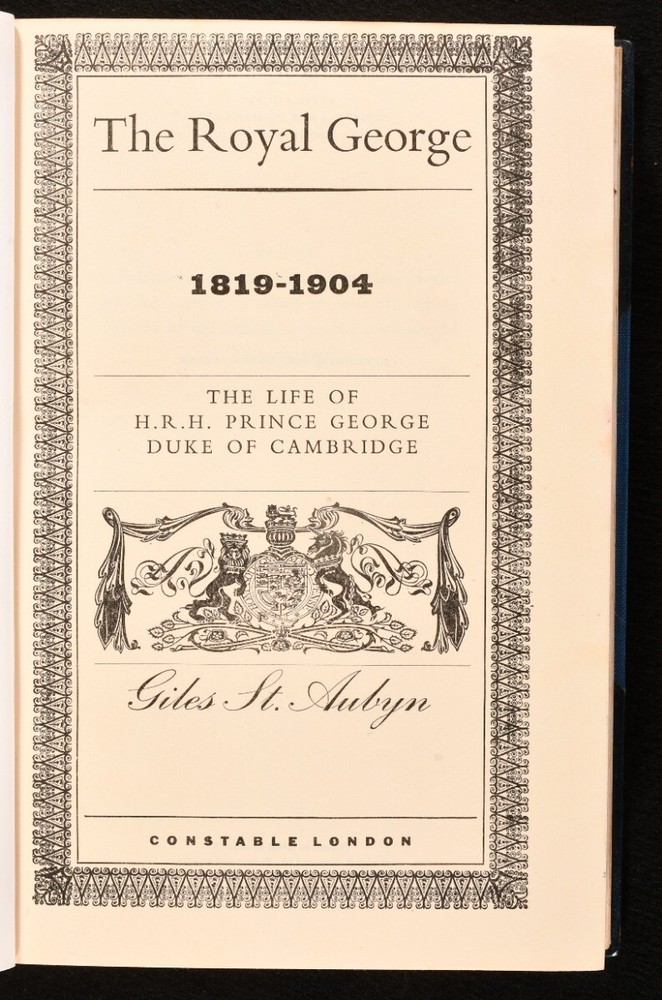 Click here to see our other books! The Royal George 1819-1904 Giles St. Aubyn 1963 Constable : London 8.5" by 5.5" [6], vii-xi, [1], 380pp SUMMARY An illustrated first edition biography on the life of Prince George the Duke of Cambridge, a lovely copy bound by Sangorski & Sutcliffe for Audrey Pleydell-Bouverie. Fine Binding,First Edition,Illustrated,Leather Binding,Signed Binding Overall Condition: Fine This book weighs 1 KG when packed UK Postage: £ 3.99 US Postage: £ 22.99 EU Postage : £ 16.99 European Postage: £ 17.99 Asia Postage: £ 22.99 Worldwide Postage: £ 28.99 DESCRIPTION The first edition of this work. An insightful biography into the live of Prince George, the Duke of Cambridge. Cousin of Queen Victoria, George was a prominent figure in the Royal family, an army officer who served as the Commander-in-Chief of the Forces. Illustrated with a frontispiece, eight plates, and in-text illustrations. Collated, complete. By Giles St. Aubyn. In a striking binding by Sangorski & Sutcliffe. Pleydell-Bouverie was a close friend of Stanley Bray, who worked at the firm for over 60 years. He often bound books for her as gifts. From the library of Audrey Pleydell-Bouverie, from her library at Julians Park, Hertfordshire. After being widowed at 25, Audrey married the fabulously wealthy American department store heir, Marshall Field III, later divorcing him and marrying the Honorable Peter Pleydell-Bouverie. In 1940 she bought Julians Park and redesigned the interior. Her library was impressive, with many examples of her own bookbinding. Audrey was an extravagant socialite and renowned beauty, the illegitimate granddaughter of King Edward VII (though she was also rumoured to be his daughter, or the lover of King Edward VIII), featured in the 'Book of Beauty' by Cecil Beaton. She had many high profile friends, such as Winston Churchill, Coco Chanel, Fred Astaire, and Nancy Mitford, a sparkling hostess of the Edwardian period, her hedonistic antics bringing her into the Bright Young Things. CONDITION In a half crushed morocco binding by Sangorski & Sutcliffe with cloth to the boards. Externally, smart. Spine is a touch faded. The odd spot to the fore edge. Internally, firmly bound. Pages are bright and clean. Overall Condition: Fine GLOSSARY OF TERMS Overall Condition (Dustwrapper condition rating is shown after that for the book itself, where a dustwrapper is present) Fine - Very well preserved copy showing very little wear Very Good Indeed - Only one or two minor faults, really a very attractive copy Very Good - Quite a wide term meaning no major faults but probably several smaller ones often expected given the age of the book, but still a respectable copy Good - Meaning not very good. Some more serious faults as will be described in the condition report under 'condition' Good Only - Meaning one or more faults that could really do with repair Fair - As with good only above but with other faults leaving a compromised copy even after repair Poor - Really bad and possibly seriously incomplete. We only sell books in this condition where their rarity or value makes them attractive none the less. Major defects will be described. GUARANTEE We offer a full money back guarantee on our descriptions. Please ask for details and conditions. We prefer PAYPAL. If you pay via PAYPAL we will post the item off the same or the next working day with the postage you have selected. Please note we cannot accept USD cheques