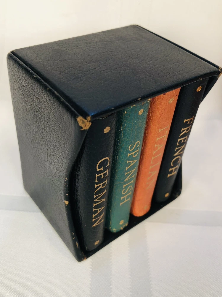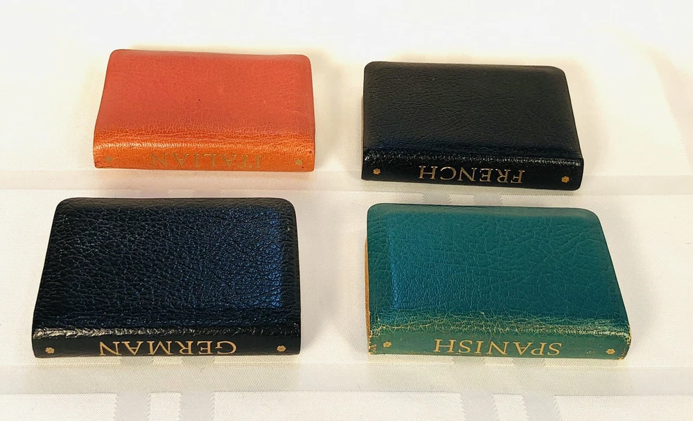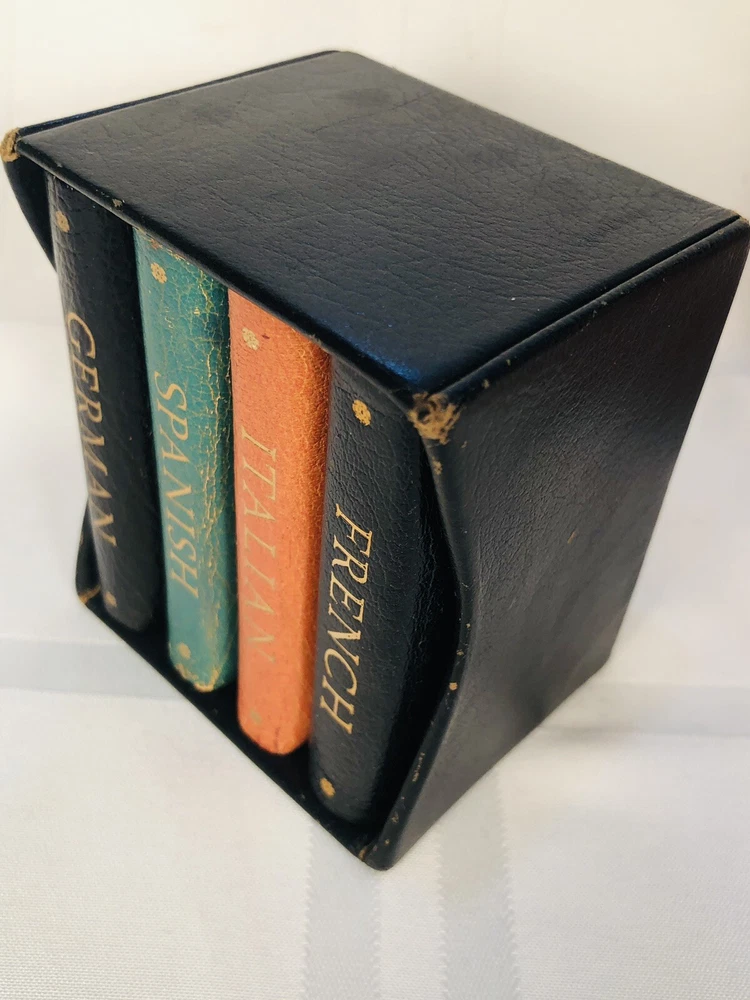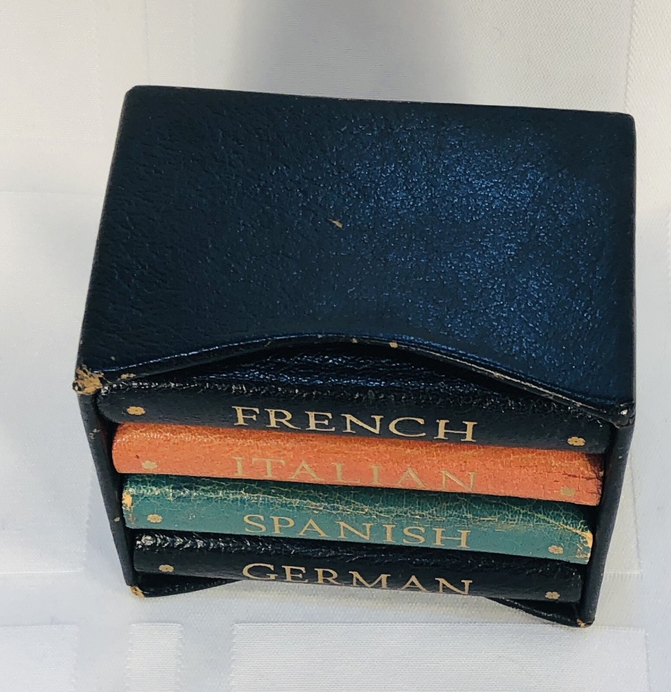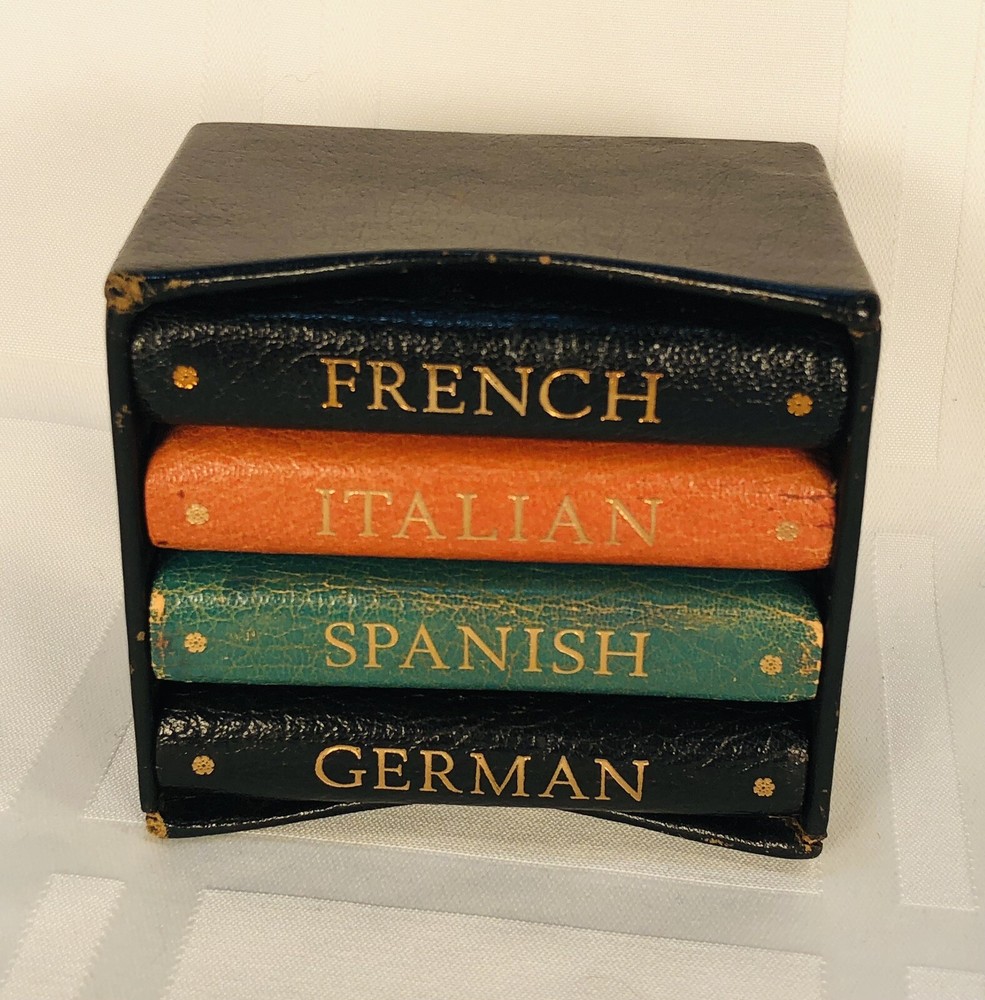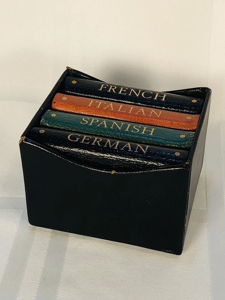 Vintage 1964 Geoffrey Parker Burgess & Bowes midget dictionary set in slip case. Includes French, Italian, Spanish & German dictionaries - with gilt page edges All were bound by hand in English leather (as per gold Geoffrey Parker sticker in the front of each book) German & Spanish volumes are dated 1964 on title page. Italian & French are not dated. Each dictionary measures 2 1/4" x 3 1/4" x 1/2". Slip case is marked "Geoffrey Parker Hand Made in England" on the back.