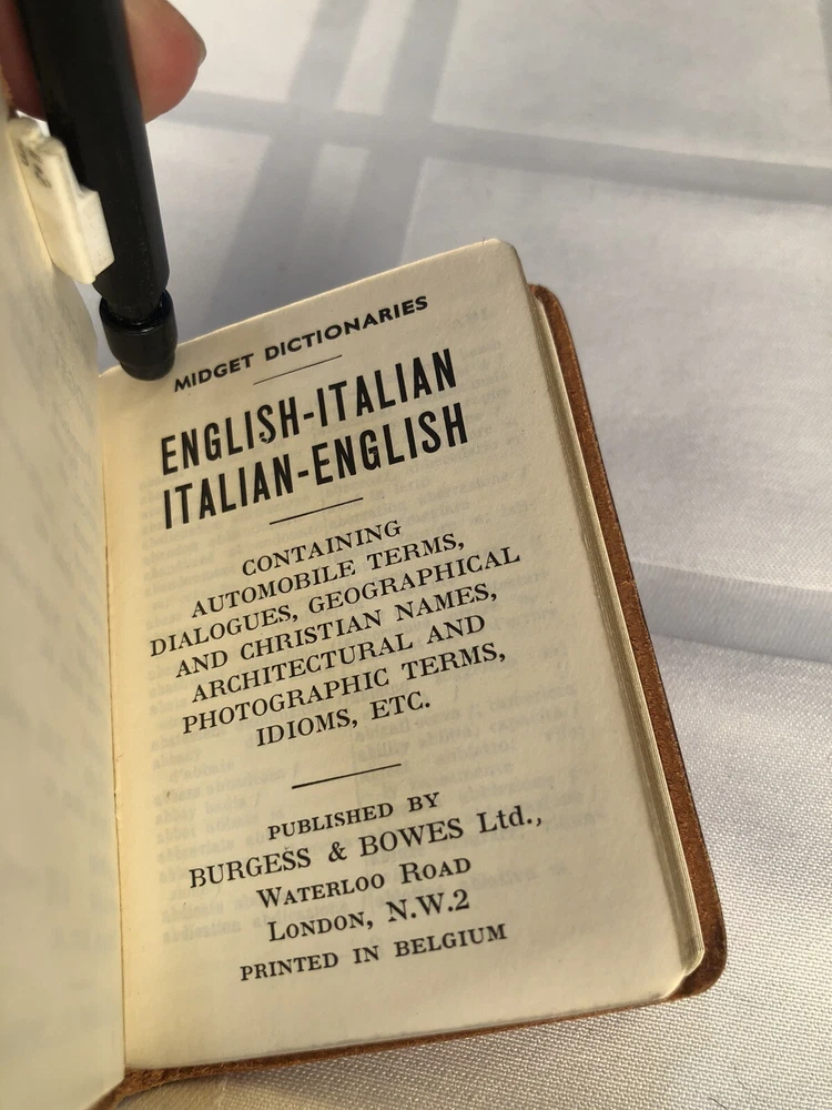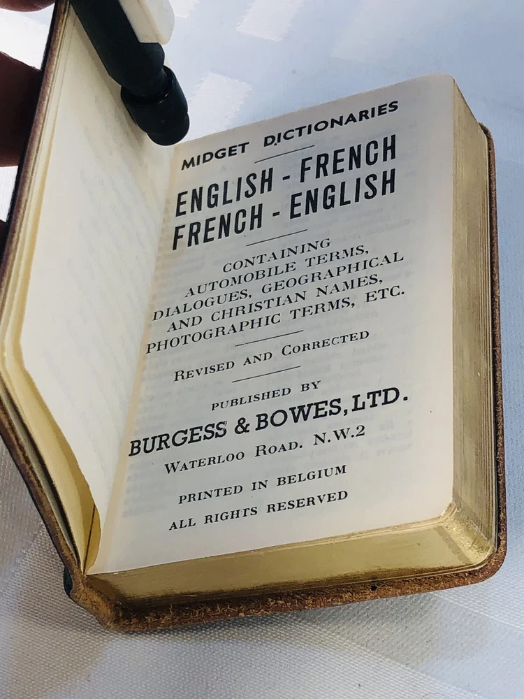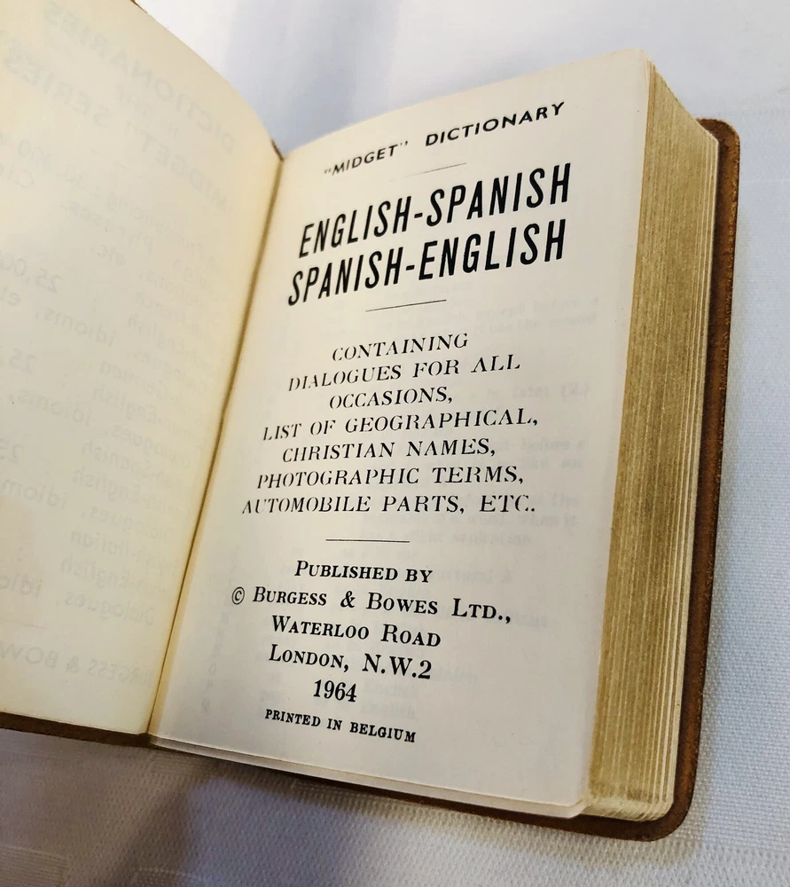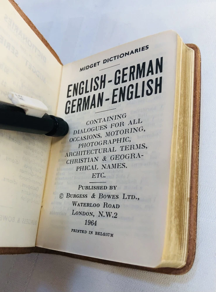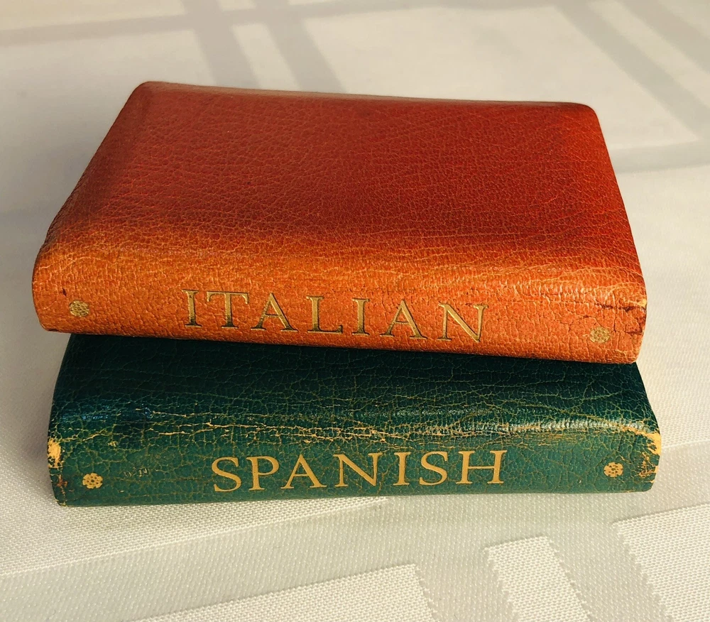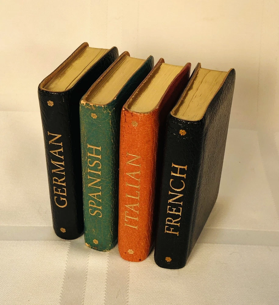 Vintage 1964 Geoffrey Parker Burgess & Bowes midget dictionary set in slip case. Includes French, Italian, Spanish & German dictionaries - with gilt page edges All were bound by hand in English leather (as per gold Geoffrey Parker sticker in the front of each book) German & Spanish volumes are dated 1964 on title page. Italian & French are not dated. Each dictionary measures 2 1/4" x 3 1/4" x 1/2". Slip case is marked "Geoffrey Parker Hand Made in England" on the back.