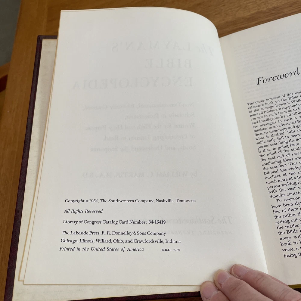 This hardcover book titled "The Bible" is a vintage piece from 1964 with a faux leather bound and illustrated features. It contains a collection of reference materials, including history, spirituality, and religion. The book is written in English, with the original language being English as well. The intended audience ranges from young adults to adults, with a narrative type of nonfiction and a genre of history. The book is published by Southwestern and has an edition of first edition. It is not personalized, signed, or inscribed, and does not have an ex libris. This encyclopedia is a great addition to any library or reference collection.091824