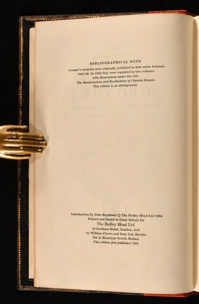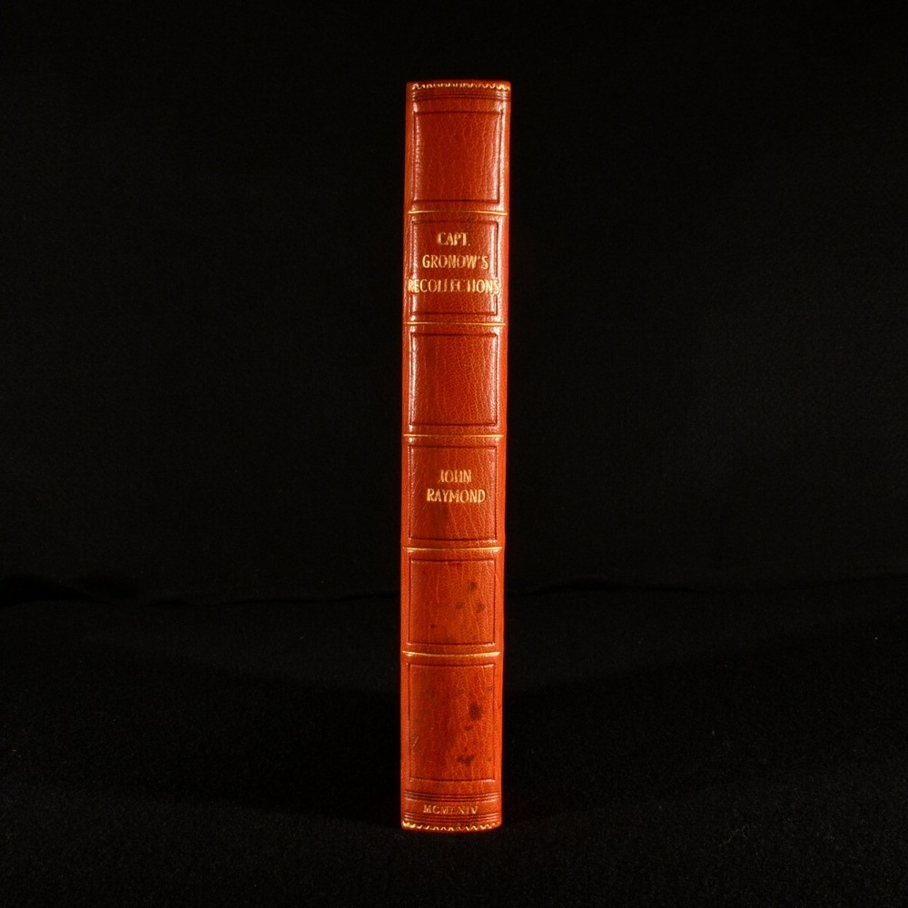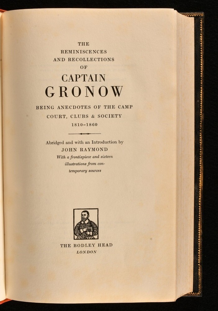 Click here to see our other books! The Reminiscences and Recollections of Captain Gronow Captain Gronow; John Raymond 1964 The Bodley Head : London 10" by 6" [4], 5-384pp SUMMARY A decoratively bound first Bodley Head abridged edition of the memoirs of Captain Rees Howell Gronow, an entertaining work on late Georgian and Victorian society. Fine Binding,First Edition,Illustrated,Leather Binding,Rebound,Signed Binding Overall Condition: Near Fine This book weighs 1 KG when packed UK Postage: £ 3.99 US Postage: £ 22.99 EU Postage : £ 16.99 European Postage: £ 17.99 Asia Postage: £ 22.99 Worldwide Postage: £ 28.99 DESCRIPTION The first abridged edition of this work published by Bodley Head. In a two-toned full morocco binding by Harry Bailey & Raymond Whitaker. The memoir and reminiscences of Captain Rees Howell Gronow, a Welsh Grenadier Guards officer and dandy. Gronow's memoirs recollect various anecdotes of the camp, court, clubs, and society, from 1810 to 1860. Illustrated with a frontispiece, eight plates, and in-text illustrations. Collated, complete. Here abridged with an introduction by John Raymond. CONDITION In a full morocco binding by Harry Bailey & Raymond Whitaker. Externally, the spine is a touch faded. Light marks to the boards and spine. The odd spot to the fore edge. Internally, firmly bound. Pages are bright and clean with some spotting to the first and last few pages. Overall Condition: Near Fine GLOSSARY OF TERMS Overall Condition (Dustwrapper condition rating is shown after that for the book itself, where a dustwrapper is present) Fine - Very well preserved copy showing very little wear Very Good Indeed - Only one or two minor faults, really a very attractive copy Very Good - Quite a wide term meaning no major faults but probably several smaller ones often expected given the age of the book, but still a respectable copy Good - Meaning not very good. Some more serious faults as will be described in the condition report under 'condition' Good Only - Meaning one or more faults that could really do with repair Fair - As with good only above but with other faults leaving a compromised copy even after repair Poor - Really bad and possibly seriously incomplete. We only sell books in this condition where their rarity or value makes them attractive none the less. Major defects will be described. GUARANTEE We offer a full money back guarantee on our descriptions. Please ask for details and conditions. We prefer PAYPAL. If you pay via PAYPAL we will post the item off the same or the next working day with the postage you have selected. Please note we cannot accept USD cheques