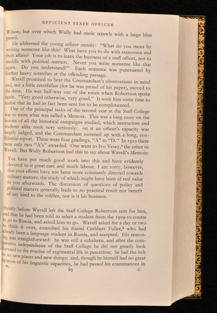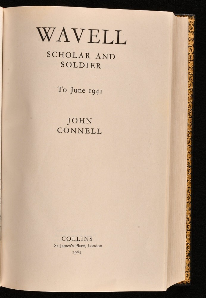 Click here to see our other books! Wavell Scholar and Soldier to June 1941 John Connell 1964 Collins : London 9" by 6" [10], 11-573, [1pp] SUMMARY The first edition of John Connell's biography on Archibald Wavell, an important figure in the British Army, illustrated throughout. Fine Binding,First Edition,Illustrated,Leather Binding,Signed Binding Overall Condition: Near Fine This book weighs 1 KG when packed UK Postage: £ 3.99 US Postage: £ 22.99 EU Postage : £ 16.99 European Postage: £ 17.99 Asia Postage: £ 22.99 Worldwide Postage: £ 28.99 DESCRIPTION The first edition of this work. In a signed binding by Harry Bailey & Raymond Whitaker. A biography on the life of Archibald Wavell, to June 1941, when Wavell was a scholar and solider as a senior officer of the British Army, serving in the Second Boer War, the Bazar Valley Campaign, and the First World War. Illustrated with a frontispiece, fourteen plates, and six in-text maps. Collated, complete. By John Connell. A second volume, 'Supreme Commander', was later published. CONDITION In a full morocco binding by Harry Bailey & Raymond Whitaker. Externally, smart. Light marks to the boards and spine. A little discolouration to the spine. Internally, firmly bound. Pages are bright and clean. Overall Condition: Near Fine GLOSSARY OF TERMS Overall Condition (Dustwrapper condition rating is shown after that for the book itself, where a dustwrapper is present) Fine - Very well preserved copy showing very little wear Very Good Indeed - Only one or two minor faults, really a very attractive copy Very Good - Quite a wide term meaning no major faults but probably several smaller ones often expected given the age of the book, but still a respectable copy Good - Meaning not very good. Some more serious faults as will be described in the condition report under 'condition' Good Only - Meaning one or more faults that could really do with repair Fair - As with good only above but with other faults leaving a compromised copy even after repair Poor - Really bad and possibly seriously incomplete. We only sell books in this condition where their rarity or value makes them attractive none the less. Major defects will be described. GUARANTEE We offer a full money back guarantee on our descriptions. Please ask for details and conditions. We prefer PAYPAL. If you pay via PAYPAL we will post the item off the same or the next working day with the postage you have selected. Please note we cannot accept USD cheques