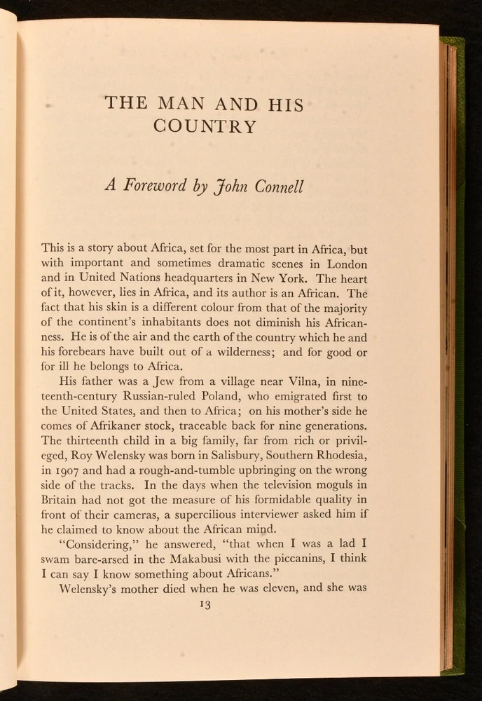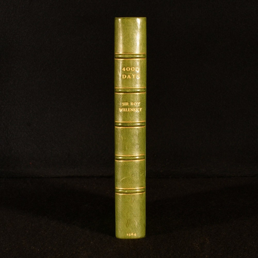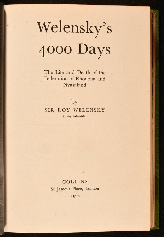 Click here to see our other books! Welensky's 4000 Days: The Life and Death of the Federation of Rhodesia and Nyasaland Sir Roy Welensky 1964 Collins : London 8" by 5.5" 383pp. SUMMARY The first edition of this illustrated autobiography by Sir Roy Welensky, bound in a Maltbys crushed half morocco with cloth to the boards. First Edition,Illustrated,Leather Binding,Original Binding,Publishers' Original Binding,Signed Binding Overall Condition: Fine This book weighs 0.75 KG when packed UK Postage: £ 3.99 US Postage: £ 19.99 EU Postage : £ 15.99 European Postage: £ 16.99 Asia Postage: £ 21.99 Worldwide Postage: £ 25.99 DESCRIPTION The first edition, first impression. Bound in a crushed half morocco with cloth to the boards by Maltbys with their signature to the front pastedown. Illustrated with a monochrome frontispiece and ten pages of monochrome plates. Collated complete. This autobiographical work was written by Sir Roy Welensky, the last president of the Federations of Rhodesia and Nyasaland. The work describes Welensky's life, with a focus on the last days of the federation and an account of the events that lead to its end. CONDITION Bound in a modern crushed half morocco with cloth to the boards. Retaining half title and endpapers. Externally lovely. Binder's signature to the front pastedown. Internally firmly bound with clean and bright pages. Overall Condition: Fine GLOSSARY OF TERMS Overall Condition (Dustwrapper condition rating is shown after that for the book itself, where a dustwrapper is present) Fine - Very well preserved copy showing very little wear Very Good Indeed - Only one or two minor faults, really a very attractive copy Very Good - Quite a wide term meaning no major faults but probably several smaller ones often expected given the age of the book, but still a respectable copy Good - Meaning not very good. Some more serious faults as will be described in the condition report under 'condition' Good Only - Meaning one or more faults that could really do with repair Fair - As with good only above but with other faults leaving a compromised copy even after repair Poor - Really bad and possibly seriously incomplete. We only sell books in this condition where their rarity or value makes them attractive none the less. Major defects will be described. GUARANTEE We offer a full money back guarantee on our descriptions. Please ask for details and conditions. We prefer PAYPAL. If you pay via PAYPAL we will post the item off the same or the next working day with the postage you have selected. Please note we cannot accept USD cheques