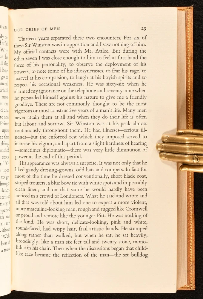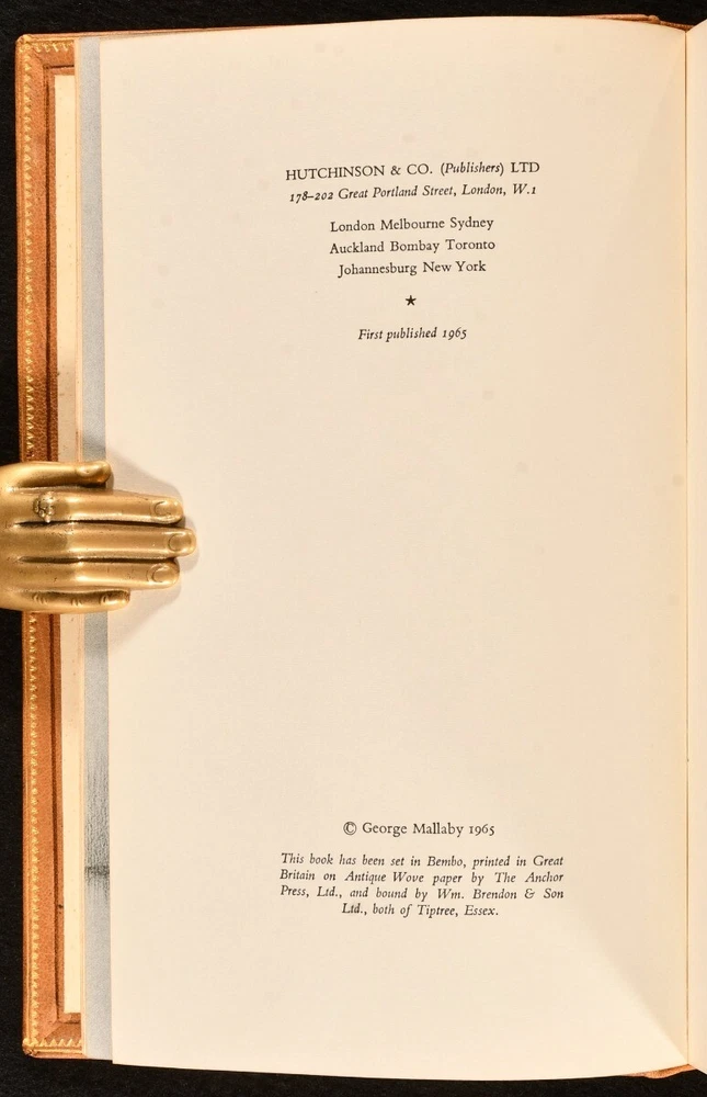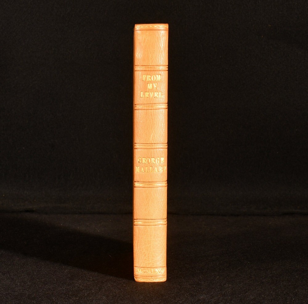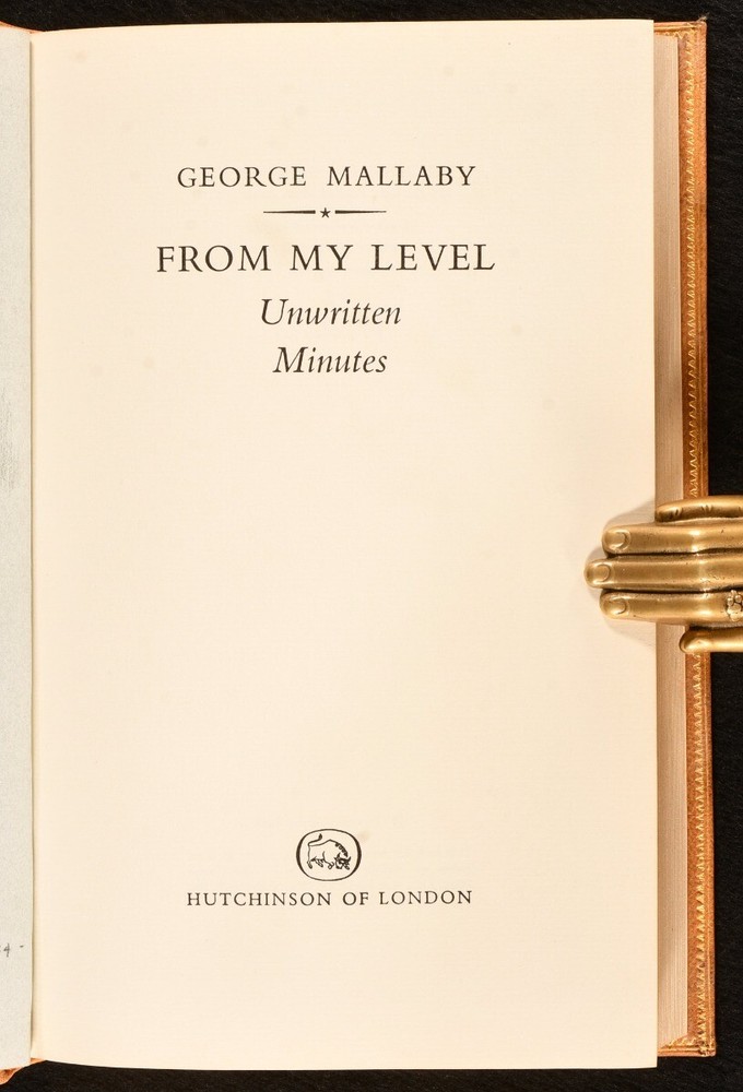 Click here to see our other books! From My Level: Unwritten Minutes George Mallaby 1965 Hutchinson : London 8.5" by 5.5" 222pp. SUMMARY A smartly bound first edition of this collection of memories from English public servant, Sir Howard George Charles Mallaby. First Edition,Leather Binding Overall Condition: Fine This book weighs 0.75 KG when packed UK Postage: £ 3.99 US Postage: £ 19.99 EU Postage : £ 15.99 European Postage: £ 16.99 Asia Postage: £ 21.99 Worldwide Postage: £ 25.99 DESCRIPTION First edition. With a portrait frontispiece by Youngman Carter, a British illustrator and author. Memories of Sir Winston Churchill, Mr. Macmillan, New Zealand Prime Ministers, wartime conferences, the Brussels Treaty, the foundation of N.A.T.O, and more. Written by Sir Howard George Charles Mallaby, an English schoolmaster and public servant who received the US Legion of Merit in 1946 and was appointed the British High Commissioner to New Zealand from 1957 to 1959. Bound by R. W. & H. B. CONDITION Bound in full brown crushed morocco with gilt. Externally, excellent. Internally, firmly bound. Pages are very bright and clean throughout. Bound by R. W. & H. B. Overall Condition: Fine GLOSSARY OF TERMS Overall Condition (Dustwrapper condition rating is shown after that for the book itself, where a dustwrapper is present) Fine - Very well preserved copy showing very little wear Very Good Indeed - Only one or two minor faults, really a very attractive copy Very Good - Quite a wide term meaning no major faults but probably several smaller ones often expected given the age of the book, but still a respectable copy Good - Meaning not very good. Some more serious faults as will be described in the condition report under 'condition' Good Only - Meaning one or more faults that could really do with repair Fair - As with good only above but with other faults leaving a compromised copy even after repair Poor - Really bad and possibly seriously incomplete. We only sell books in this condition where their rarity or value makes them attractive none the less. Major defects will be described. GUARANTEE We offer a full money back guarantee on our descriptions. Please ask for details and conditions. We prefer PAYPAL. If you pay via PAYPAL we will post the item off the same or the next working day with the postage you have selected. Please note we cannot accept USD cheques