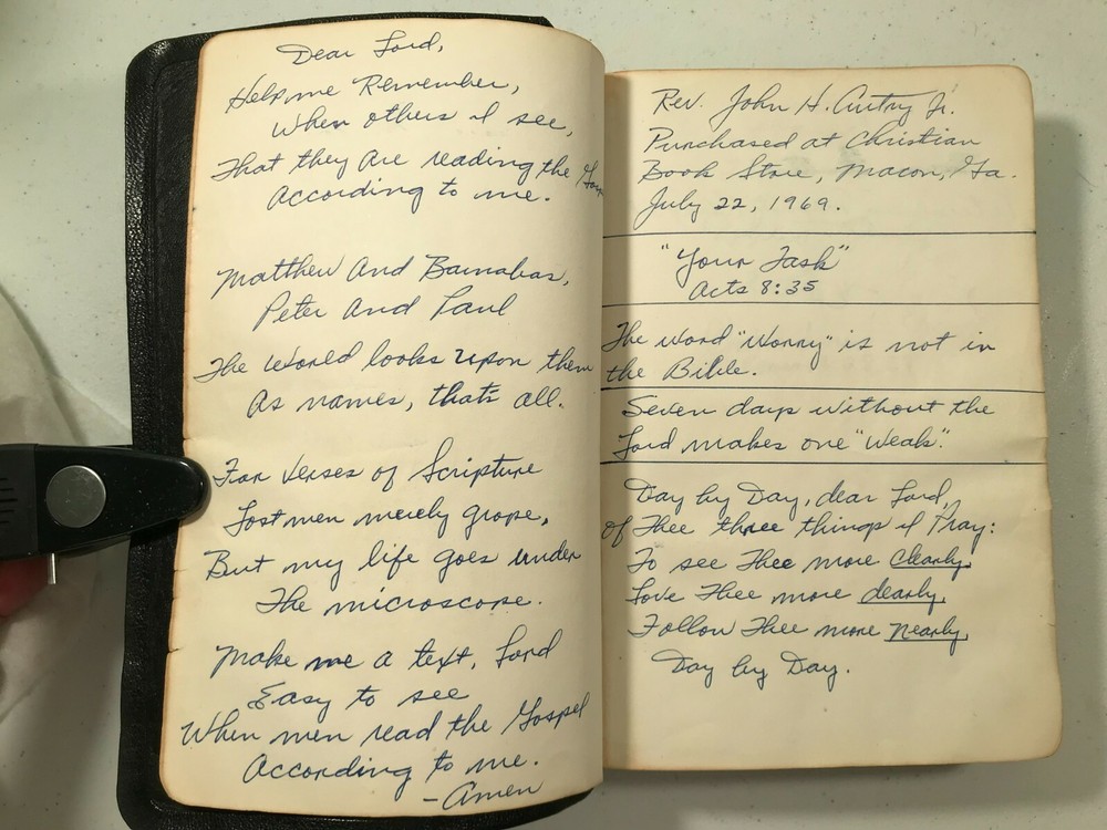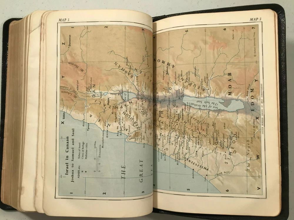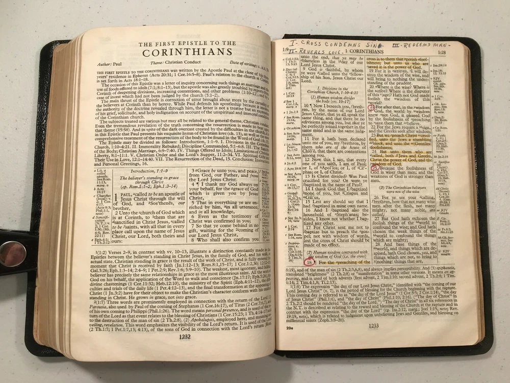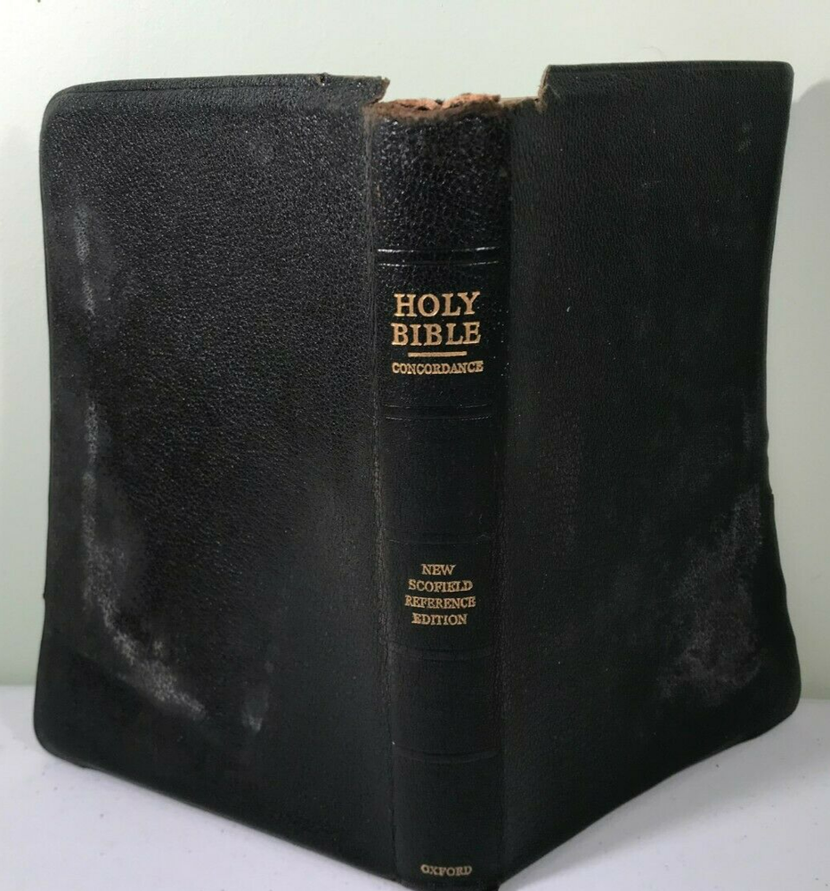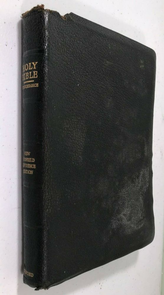 This is The New Scofield Bible HOLY BIBLE - Authorized King James Version, with introductions, annotations, subject chain references, and such word changes in the text as will help the reader. Editor, C. I. Scofield. Published in 1967 by Oxford University Press. Bound in black hand-grained Morocco leather. This Bible was owned by a Pastor (he was a "Reverend") and it is a well-used copy with notes or underlining in many pages.. Please see photos for more on contents and condition. Leather covers have worn areas, top of spine and adjacent edge is chipped off. There's notes and names in first few blank pages at the beginning. There's an ink stamp of previous owner on first and last page. Title page has a 2" closed tear. Some pages are creased. First several pages have wear at the edges. Several pages have marginal notes, underlining or highlighting. There's other minor wear or marks. A well-used and well-loved Bible previously owned by a Pastor. Thanks for looking ! r196