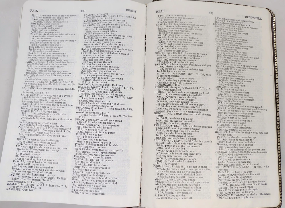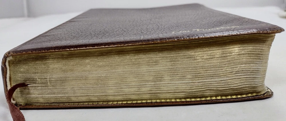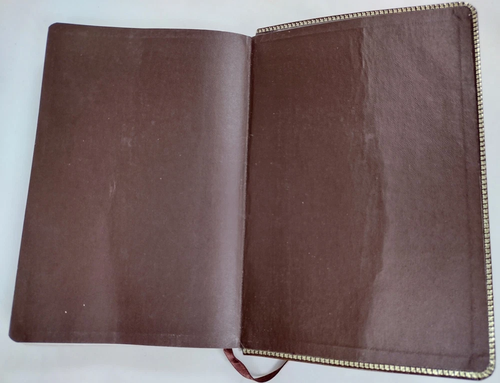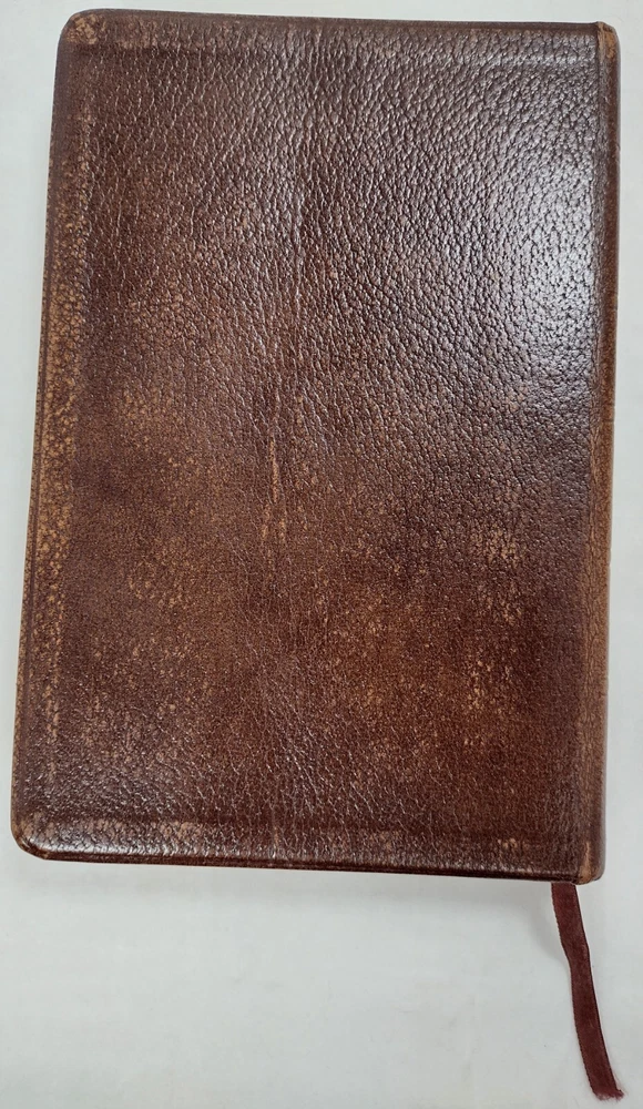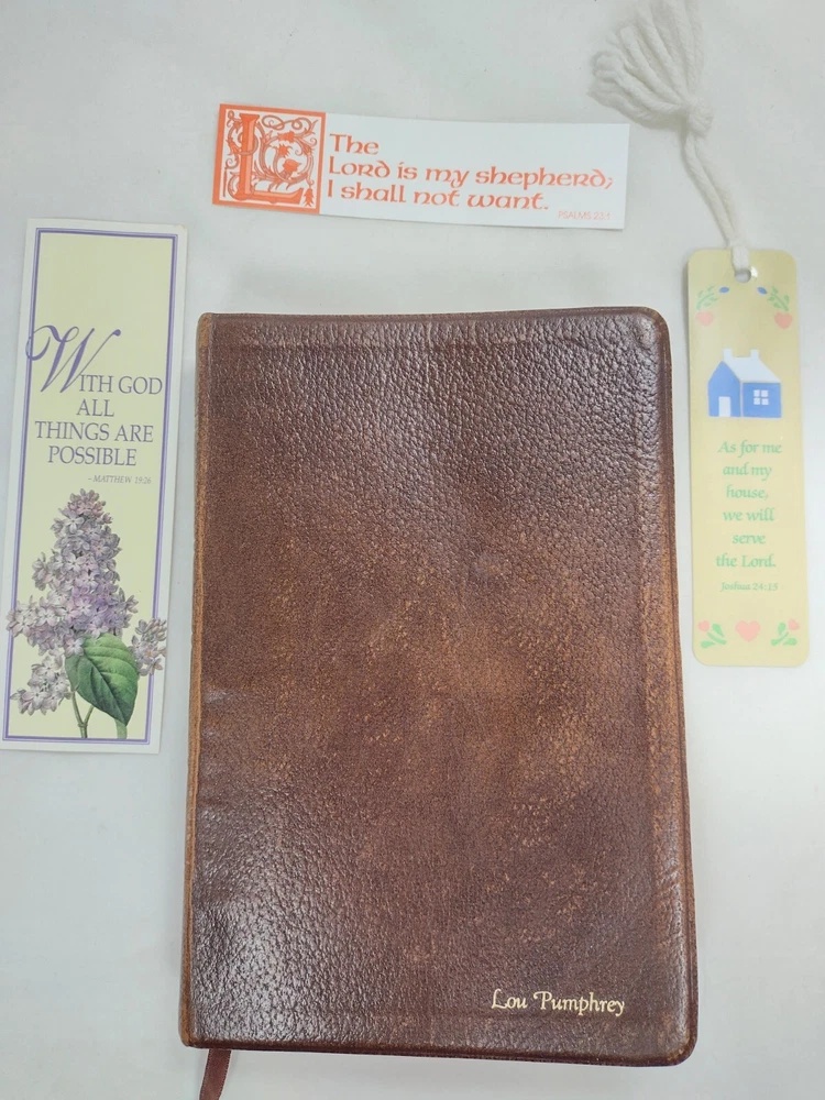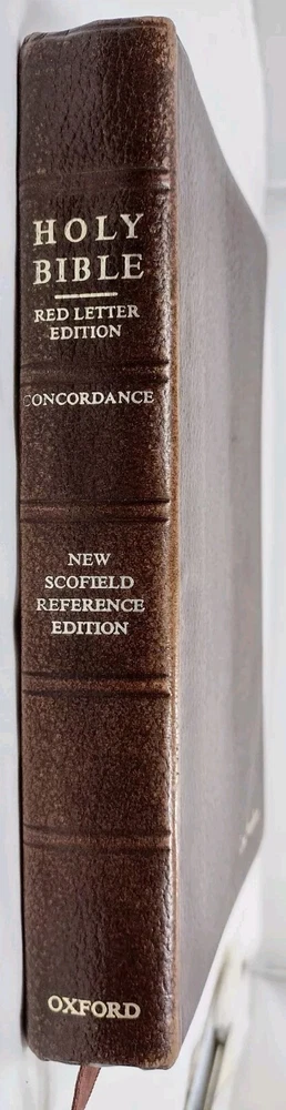 1967 Holy Bible Red Letter Concordance New Scofield Reference Ed Oxford Leather. This Bible is pre-owned. It has some writing here and there, papers of reference taped one in front one in back, bending, yellowing, embossed personal name on front, and wear. It has 1392 pages of Scripture and index to annotations, 192 pages of concordance and map index, and 9 map pages. It measures approximately 1 1/2 x 6 x 9". You get the 3 bookmarks that were in it. Pictures are part of the description. Thanks for looking!