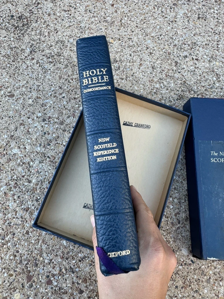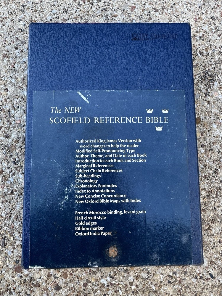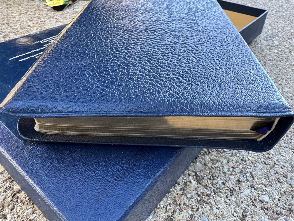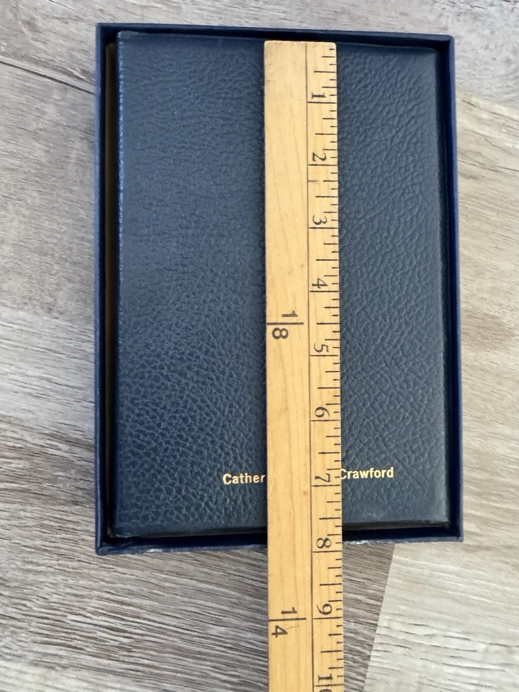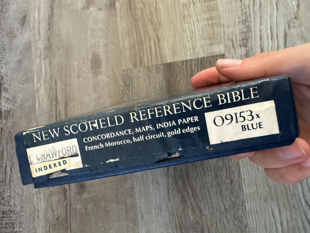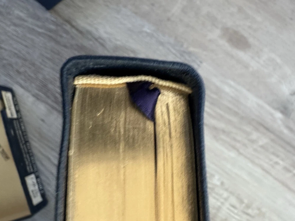 Has name engraved on front cover In excellent like new condition apart from the inside has approximately 50 or so pages with highlights as shown in the photos Some with heavy highlights and some with much less Examples shown No odors This Bible is the indexed version and has a beautiful blue color Measurements in photos Ships bubble wrapped in box BIBLCBX