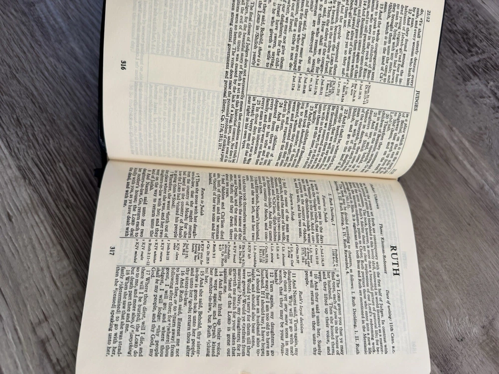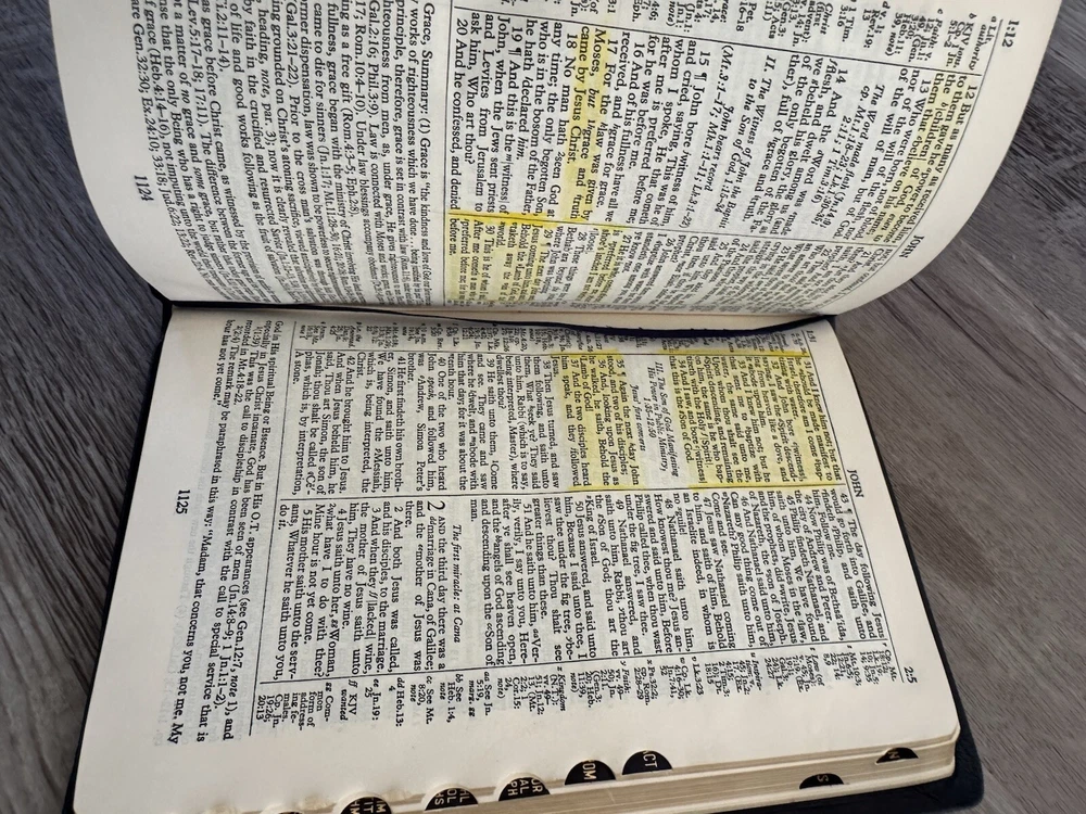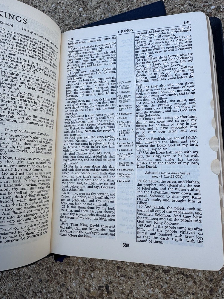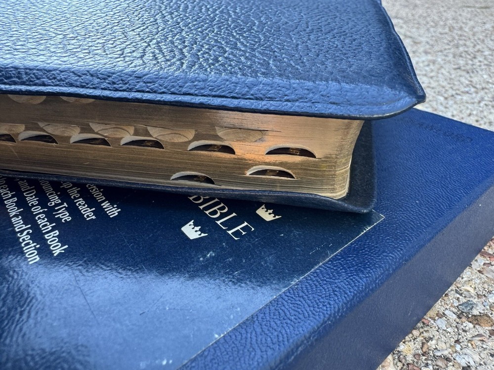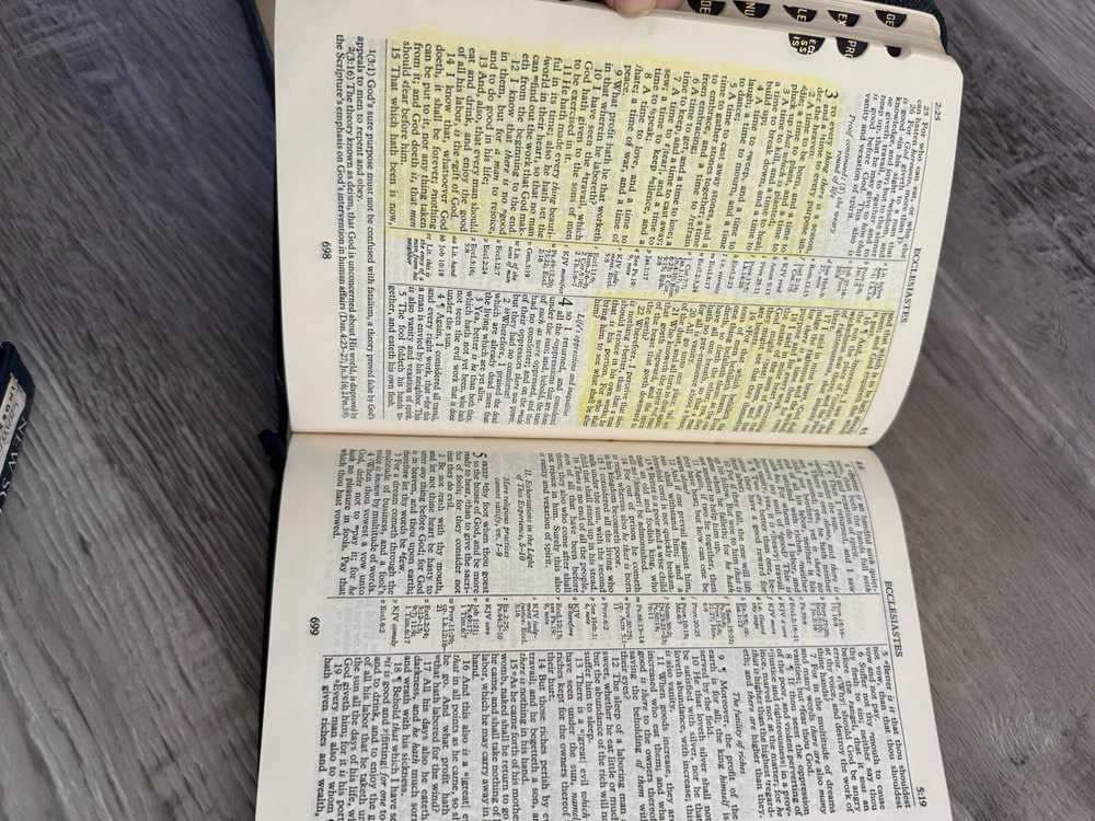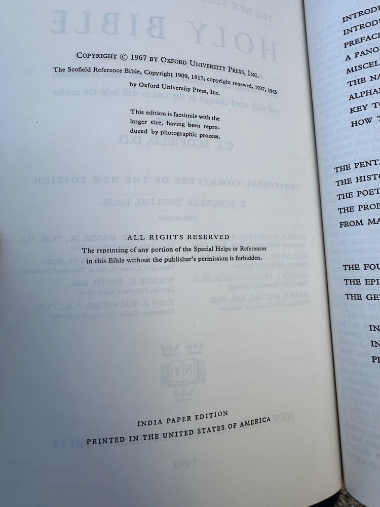 Has name engraved on front cover In excellent like new condition apart from the inside has approximately 50 or so pages with highlights as shown in the photos Some with heavy highlights and some with much less Examples shown No odors This Bible is the indexed version and has a beautiful blue color Measurements in photos Ships bubble wrapped in box BIBLCBX