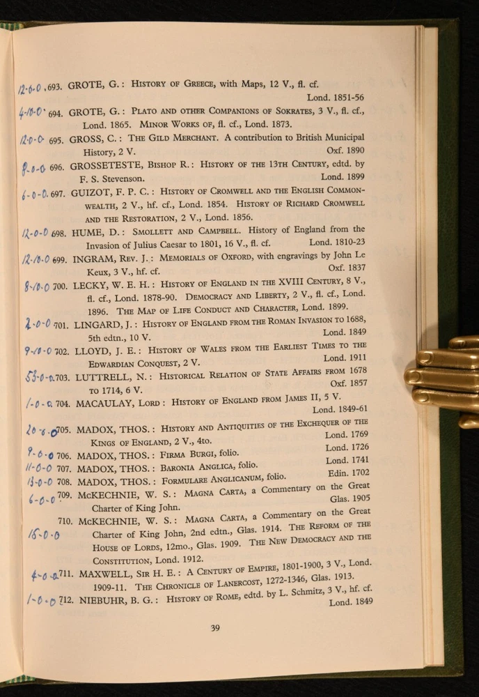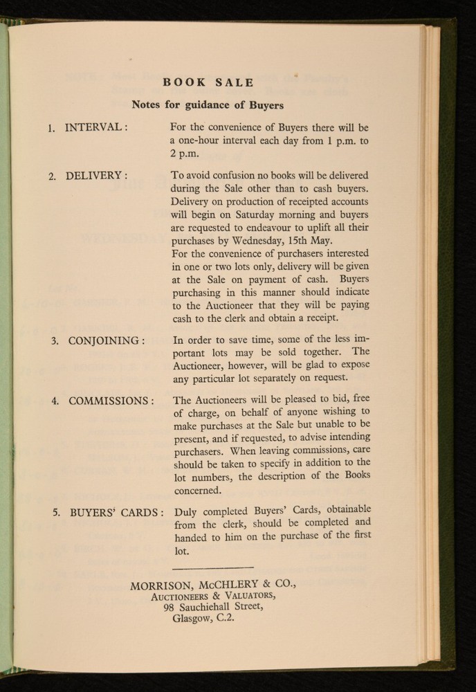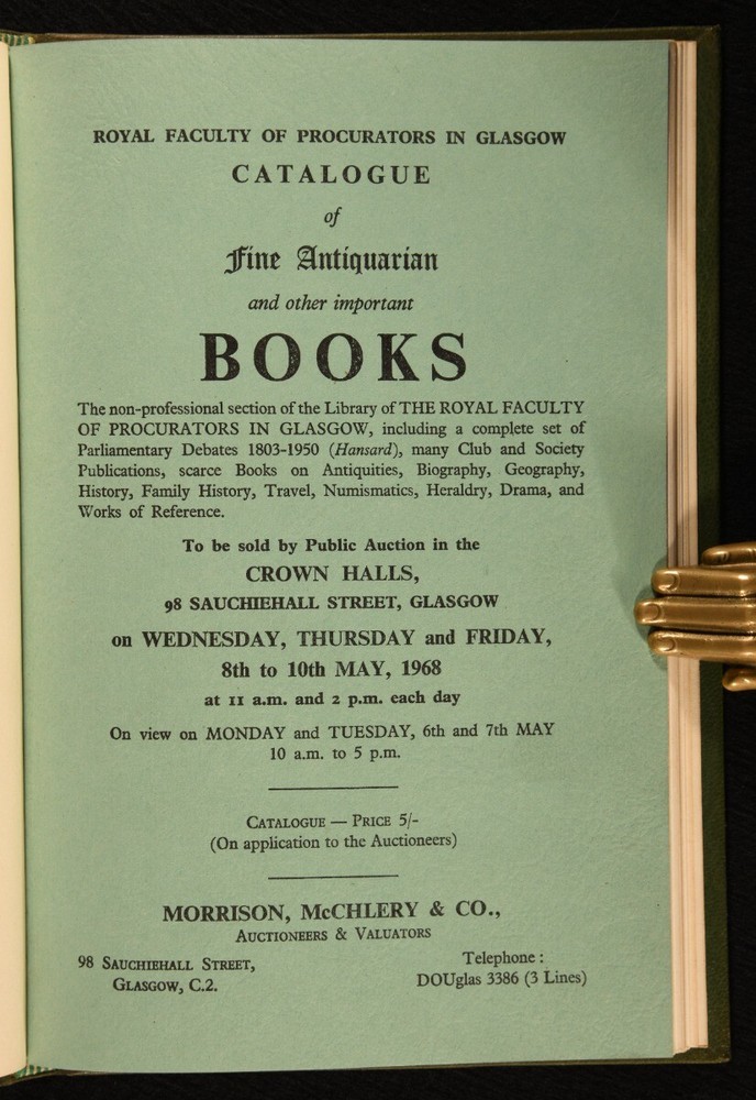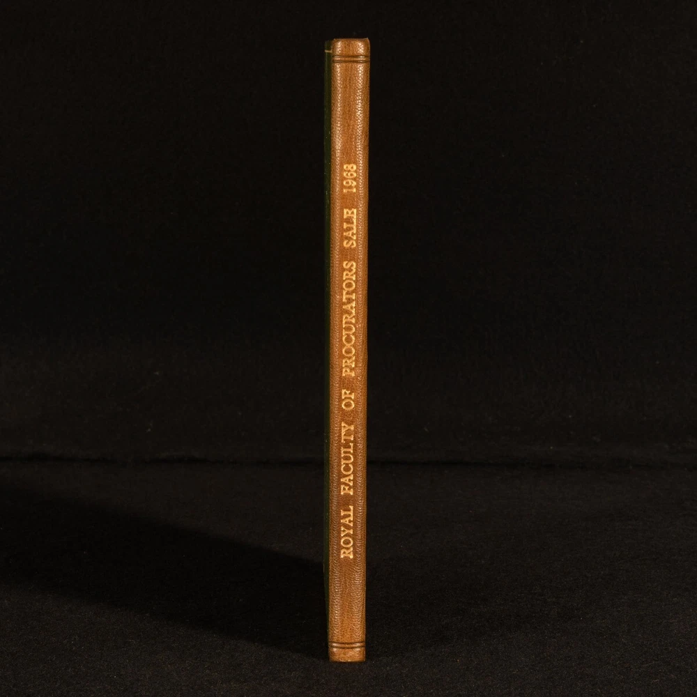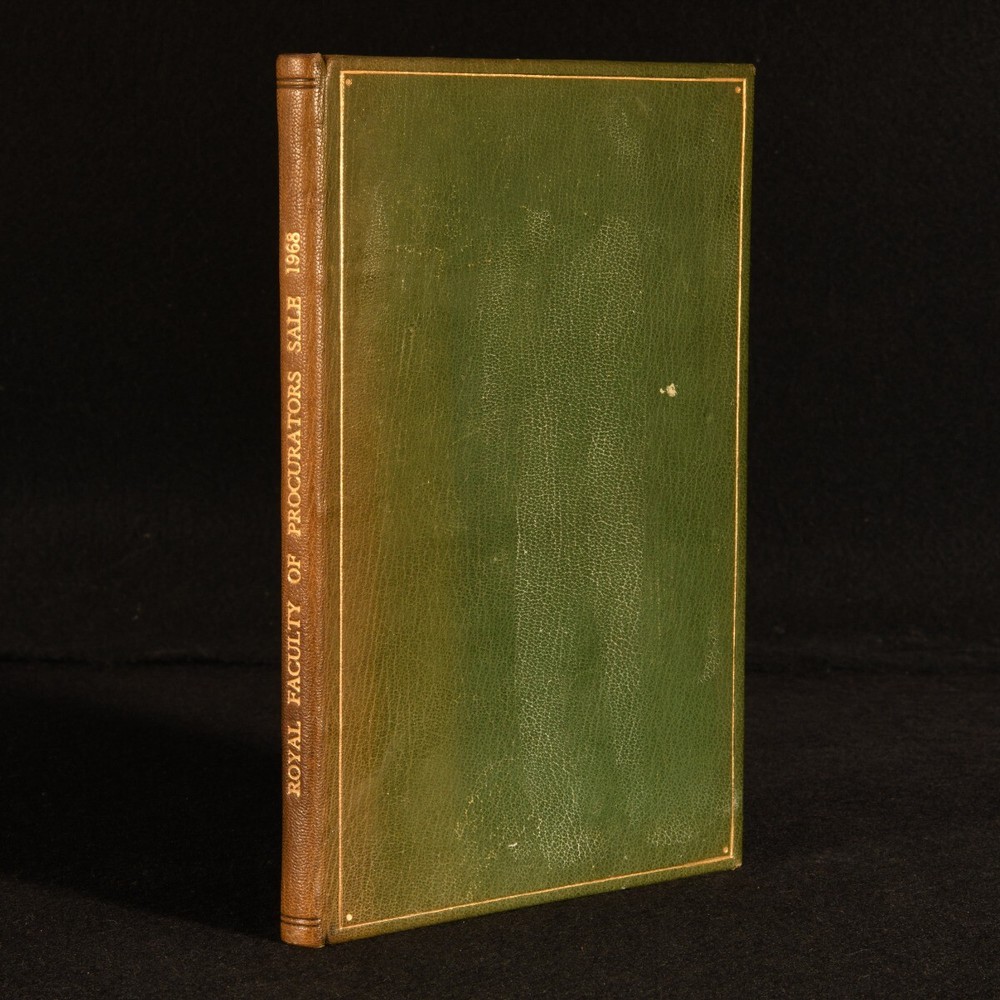 Click here to see our other books! Royal Faculty of Procurators in Glasgow Catalogue of Fine Antiquarian and Other Important Books Not Stated 1968 Morrison, McChlery & Co : Glasgow 8.5" by 5.5" 56, 8pp SUMMARY A very scarce catalogue of an auction held of the books held at the Royal Faculty of Procurators in Glasgow. First Edition,Leather Binding,Signed Binding,Very Scarce Overall Condition: Very Good This book weighs 0.5 KG when packed UK Postage: £ 3.99 US Postage: £ 15.99 EU Postage : £ 13.99 European Postage: £ 14.99 Asia Postage: £ 18.99 Worldwide Postage: £ 19.99 DESCRIPTION A very scarce first edition. Bound by Donn & Wilson LTD. A catalogue of antiquarian books sold at auction by Morrison, McChlery & Co in 1968, from the library of the Royal Faculty of Procurators in Glasgow. The Royal Faculty of Procurators in Glasgow is a professional body of legal practitioners, and is home to the largest law library in the West of Scotland, covering all practice areas. Original wraps bound in to the front. Prior owner's ink to the margins, giving the sold prices for each item. Newspaper clippings to the verso of the front endpaper, recto of the front free, and to the rear paste down, discussing the sale. CONDITION In a full crushed morocco binding, bound by Donn & Wilson LTD. Externally, generally smart, with light marks to the boards and spine. Spine is faded. Newspaper clippings to the verso of the front endpaper, recto of the front free, and to the rear paste down, discussing the sale. Internally, firmly bound. Pages are bright and clean. Prior owner's ink to the margins. Overall Condition: Very Good GLOSSARY OF TERMS Overall Condition (Dustwrapper condition rating is shown after that for the book itself, where a dustwrapper is present) Fine - Very well preserved copy showing very little wear Very Good Indeed - Only one or two minor faults, really a very attractive copy Very Good - Quite a wide term meaning no major faults but probably several smaller ones often expected given the age of the book, but still a respectable copy Good - Meaning not very good. Some more serious faults as will be described in the condition report under 'condition' Good Only - Meaning one or more faults that could really do with repair Fair - As with good only above but with other faults leaving a compromised copy even after repair Poor - Really bad and possibly seriously incomplete. We only sell books in this condition where their rarity or value makes them attractive none the less. Major defects will be described. GUARANTEE We offer a full money back guarantee on our descriptions. Please ask for details and conditions. We prefer PAYPAL. If you pay via PAYPAL we will post the item off the same or the next working day with the postage you have selected. Please note we cannot accept USD cheques