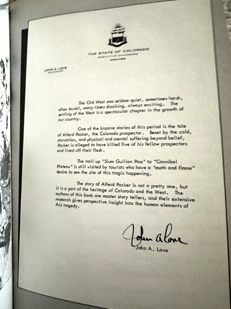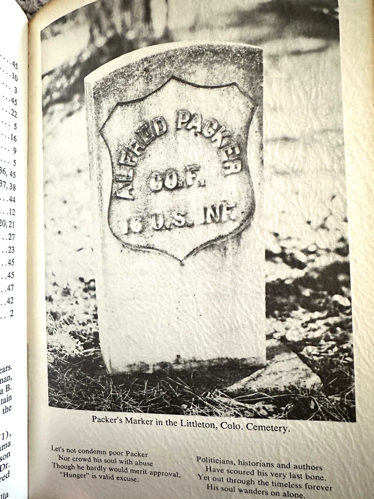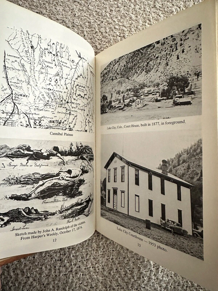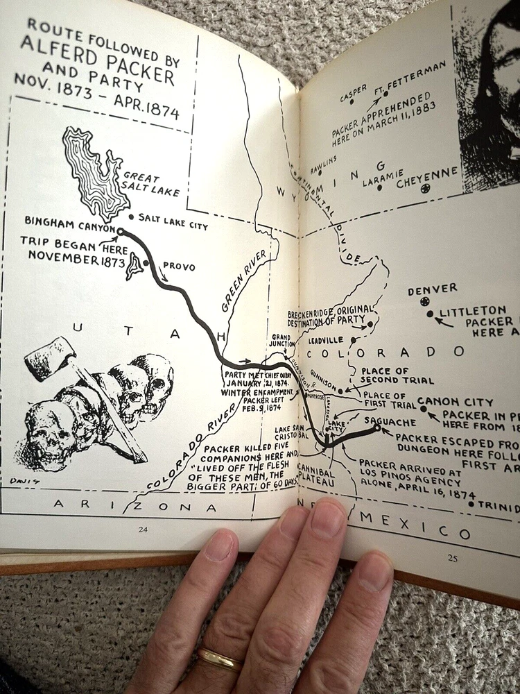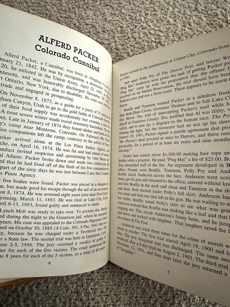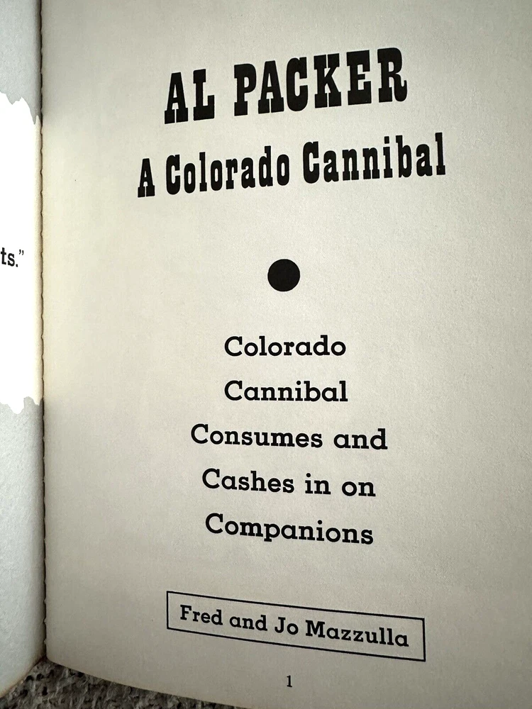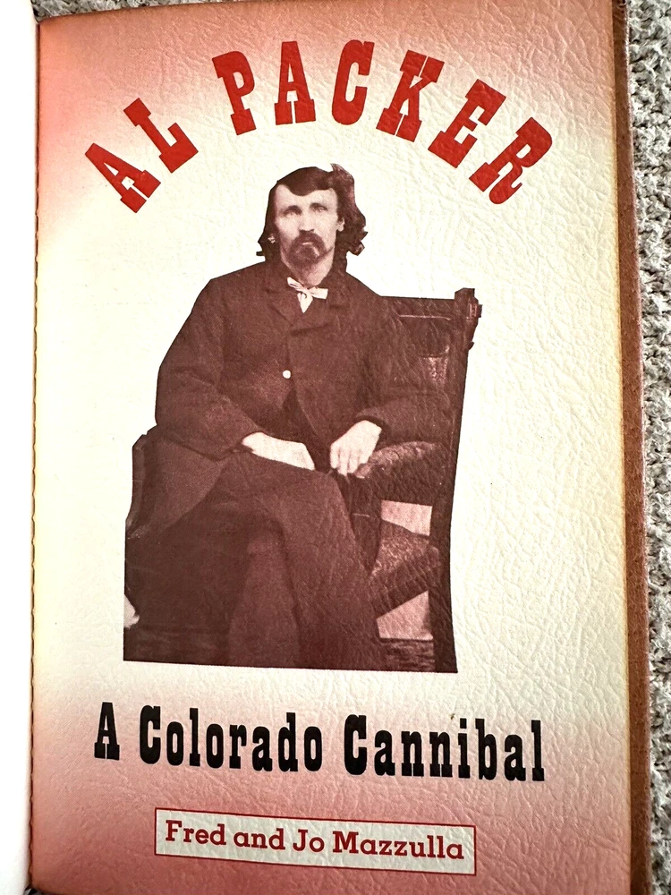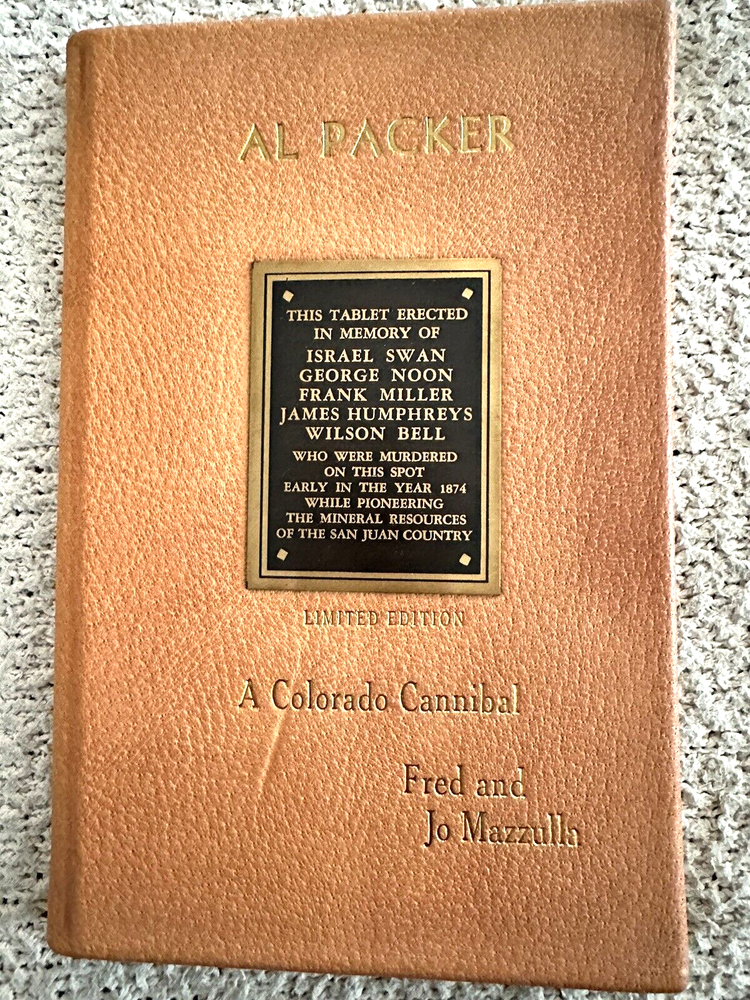 1968 Limited Edition No. 146/150 Tanned Leather/Metal Plate Al Packer, A Colorado Cannibal Fred & Jo Mazzulla (signed) (see photo) Good condition (see photos) Numerous illustrations, photographs, portraits & map plan. pp. 49 Dimensions: 8 3/4" x 5 1/2" x 1/4" Alfred Griner Packer (1842 – 1907), also known as the "Colorado Cannibal", was an American prospector and self-proclaimed wilderness guide who confessed to cannibalism during the winter of 1874. Though no clear or definitive evidence has been found to this day, and despite in-depth research about proof of his deeds, he is one of the four persons historically convicted for cannibalism in the United States. After emerging as the sole survivor of a six-man party who had attempted to travel through the San Juan Mountains of the Colorado Territory, he eventually confessed to having lived off the flesh of his companions, giving more than one version of his account as to the circumstances. After his story was called into question, Packer escaped jail and hid from justice for nine years. He was eventually tried, convicted of premeditated murder and sentenced to death. Packer won a retrial, and was eventually sentenced to 40 years in prison on five counts of voluntary manslaughter.