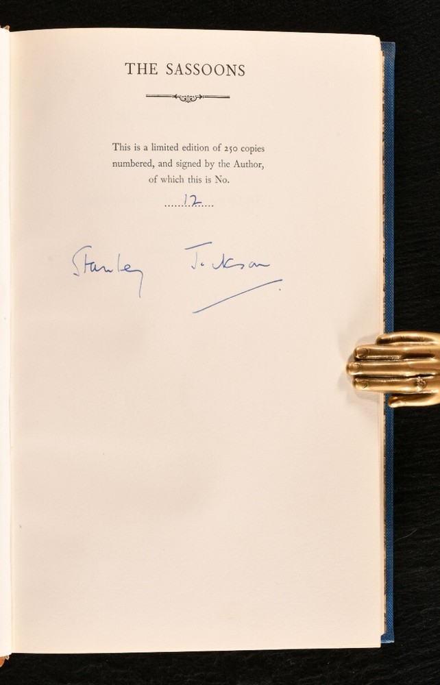 Click here to see our other books! The Sassoons Stanley Jackson 1968 Heinmann : London 10" by 6" [11], xii-xiii, [4], 2-304pp SUMMARY A signed limited edition of Stanley Jackson's study into the Sassoon dynasty, a beautiful work illustrated throughout. Illustrated,Leather Binding,Limited Edition,Publishers' Original Binding,Signed Overall Condition: Fine This book weighs 1.5 KG when packed UK Postage: £ 3.99 US Postage: £ 23.99 EU Postage : £ 18.99 European Postage: £ 19.99 Asia Postage: £ 31.99 Worldwide Postage: £ 32.99 DESCRIPTION A limited edition work, limited to two-hundred and fifty copies, of which this is number twelve. Signed by the author to the limitation page. A detailed and insightful study into the Sassoon family, the 'Rothschlilds of the East'. The Sassoon family is of Baghadadi Jewish descent, having immense wealth due to their success in finance and trade. Since the eighteenth century the Sassoon dynasty have been one of the wealthiest families in the world. Illustrated with a frontispiece, twenty-plates, and in-text graphs. Collated, complete. Written by Stanely Jackson. CONDITION In the original publisher's quarter morocco binding with cloth to the boards. Externally, with just a couple to faint marks to the boards. Internally, firmly bound. Pages are bright and clean. Overall Condition: Fine GLOSSARY OF TERMS Overall Condition (Dustwrapper condition rating is shown after that for the book itself, where a dustwrapper is present) Fine - Very well preserved copy showing very little wear Very Good Indeed - Only one or two minor faults, really a very attractive copy Very Good - Quite a wide term meaning no major faults but probably several smaller ones often expected given the age of the book, but still a respectable copy Good - Meaning not very good. Some more serious faults as will be described in the condition report under 'condition' Good Only - Meaning one or more faults that could really do with repair Fair - As with good only above but with other faults leaving a compromised copy even after repair Poor - Really bad and possibly seriously incomplete. We only sell books in this condition where their rarity or value makes them attractive none the less. Major defects will be described. GUARANTEE We offer a full money back guarantee on our descriptions. Please ask for details and conditions. We prefer PAYPAL. If you pay via PAYPAL we will post the item off the same or the next working day with the postage you have selected. Please note we cannot accept USD cheques