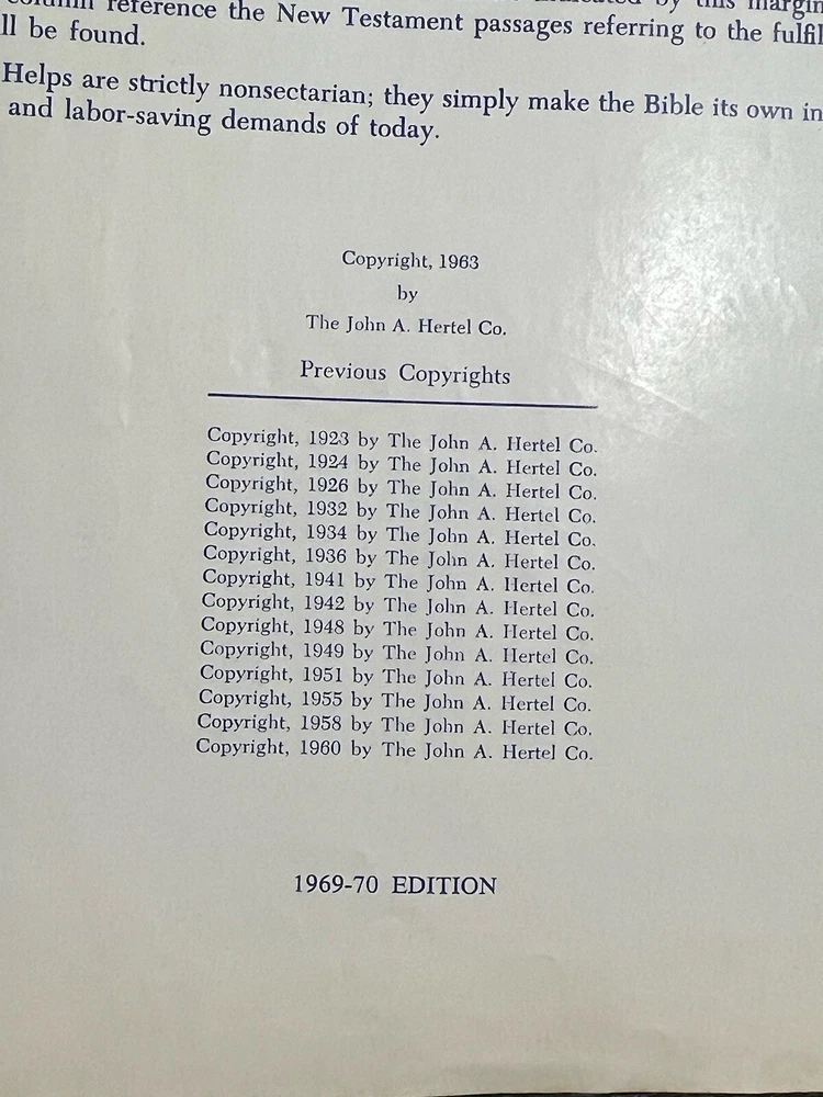 1969-70 New Standard Reference Bible Special Blue Ribbon Edition Hertel Bonded Leather Bible. In used condition, has obvious signs of usage and wear, writing throughout- see photos before purchasing....