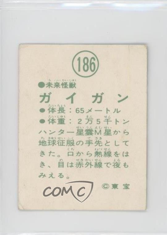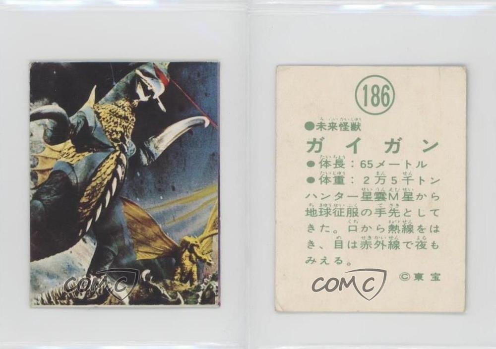 1970 Yamakatsu Mothra vs Godzilla Pull Pack - [Base] #186 Gigan COMC Item: 163844698 - Non-Sports Card - Featuring Gigan Search for more: 1970 Yamakatsu Mothra vs Godzilla Pull Pack Search for more: 1970 Yamakatsu Mothra vs Godzilla Pull Pack - [Base] View all of our Listings Auctions Buy It Now About Us Located in the beautiful Pacific Northwest, COMC (Check Out My Cards) is the world's largest consignment service for trading card singles. More than 10,000 people have used our consignment service to list over 50 million trading cards. Find out how we can help you consign your items on eBay by contacting us through eBay messaging. COMC -- "The Safe & Easy Way to Buy & Sell" Raw Condition for Modern Cards Unless otherwise noted, raw modern cards are listed in Near Mint-Mint condition or better. A NM-MT card appears to be Mint at first glance, but upon closer inspection, may exhibit some of the following: minor print defects (e.g. roller marks, print line, dimple), minor scratches, slight edge wear, and slight corner wear. Centering is clearly visible in the images provided and does not factor into our condition assessment. Raw Condition for Vintage Cards Unless otherwise noted, raw vintage cards are listed in Excellent condition or better. An EX card may exhibit some of the following: minor rounding of corners, surface wear, print defects, light scratches, and slight edge wear/chipping. Centering is clearly visible in the images provided and does not factor into our condition assessment. Domestic Shipping Combined shipping for multiple items is available. To receive combined shipping, please ensure all desired items are in your eBay shopping cart before proceeding to checkout. eBay limits orders to 40 items per order. We automatically combine multiple orders placed on the same day. If you place multiple orders on the same day, please contact us to request a refund of applicable shipping costs. Signature confirmation may be required on invoices over $400. All cards are protected and shipped securely. International Shipping COMC offers eBay's International Shipping (EIS) for international orders under $2,500* (see country exceptions below). All duties and import fees are paid at checkout; in the rare event that there are additional import fees upon delivery, these are borne by the buyer. EIS packages route through a shipping hub in Erlanger, KY before shipping to their final destination. Please note that EIS does not allow for combined shipments. The shipping rates are determined by eBay and cannot be adjusted. *Maximum sale price exceptions: Colombia, Kuwait ($2,000); Taiwan ($1,539); Chile, Costa Rica, Guatemala, Honduras, Trinidad and Tobago ($1,000); Antigua and Barbuda, Aruba, Belize, Dominica, Grenada, Philippines, Saint Kitts and Nevis, Saint Lucia, Montserrat, Turks and Caicos Islands ($500); Dominican Republic, El Salvador ($200). Please request a shipping quote through eBay messaging for orders that exceed the maximum sale price supported by eBay's International Shipping. You will be responsible for all duties and import fees for international orders shipped outside the EIS. All cards are protected and shipped securely. Payment COMC does not accept offers on our cards through our eBay storefront. COMC utilizes eBay’s managed payments system. If you are experiencing difficulties making a payment, please contact eBay for assistance. Return Policy Returns are only accepted on the rare occasion the item is not as described. If you are making a return, please initiate the return process through eBay so a mailing label can be provided for you. Prior to listing, our expert team carefully assessed this item to represent it accurately. Please review the description and high-definition images prior to purchasing to ensure this item meets your satisfaction. We welcome you to contact us if you have further questions about this item. Trust and Integrity COMC carefully assesses each item consigned to us to prevent fraudulent items from entering the marketplace. If you believe an item offered on COMC may be fraudulent, please contact us with details so we can investigate the issue. Items we determine are outside our supported items policy may be removed. Last Modified: 6/22/2025 6:02:08 PM PDT