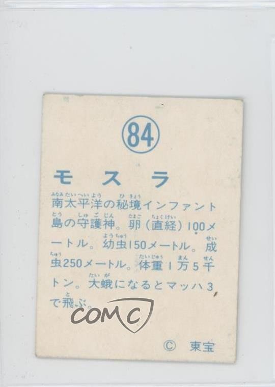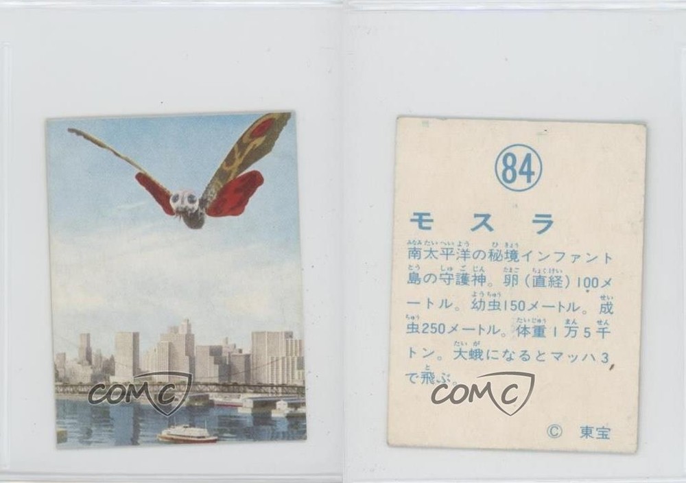 1970 Yamakatsu Mothra vs Godzilla Pull Pack - [Base] #84 Mothra COMC Item: 212834888 - Non-Sports Card - Featuring Mothra Search for more: 1970 Yamakatsu Mothra vs Godzilla Pull Pack Search for more: 1970 Yamakatsu Mothra vs Godzilla Pull Pack - [Base] View all of our Listings Auctions Buy It Now About Us Located in the beautiful Pacific Northwest, COMC (Check Out My Cards) is the world's largest consignment service for trading card singles. More than 10,000 people have used our consignment service to list over 50 million trading cards. Find out how we can help you consign your items on eBay by contacting us through eBay messaging. COMC -- "The Safe & Easy Way to Buy & Sell" Raw Condition for Modern Cards Unless otherwise noted, raw modern cards are listed in Near Mint-Mint condition or better. A NM-MT card appears to be Mint at first glance, but upon closer inspection, may exhibit some of the following: minor print defects (e.g. roller marks, print line, dimple), minor scratches, slight edge wear, and slight corner wear. Centering is clearly visible in the images provided and does not factor into our condition assessment. Raw Condition for Vintage Cards Unless otherwise noted, raw vintage cards are listed in Excellent condition or better. An EX card may exhibit some of the following: minor rounding of corners, surface wear, print defects, light scratches, and slight edge wear/chipping. Centering is clearly visible in the images provided and does not factor into our condition assessment. Domestic Shipping Combined shipping for multiple items is available. To receive combined shipping, please ensure all desired items are in your eBay shopping cart before proceeding to checkout. eBay limits orders to 40 items per order. We automatically combine multiple orders placed on the same day. If you place multiple orders on the same day, please contact us to request a refund of applicable shipping costs. Signature confirmation may be required on invoices over $400. All cards are protected and shipped securely. International Shipping COMC offers eBay's International Shipping (EIS) for international orders under $2,500* (see country exceptions below). All duties and import fees are paid at checkout; in the rare event that there are additional import fees upon delivery, these are borne by the buyer. EIS packages route through a shipping hub in Erlanger, KY before shipping to their final destination. Please note that EIS does not allow for combined shipments. The shipping rates are determined by eBay and cannot be adjusted. *Maximum sale price exceptions: Colombia, Kuwait ($2,000); Taiwan ($1,539); Chile, Costa Rica, Guatemala, Honduras, Trinidad and Tobago ($1,000); Antigua and Barbuda, Aruba, Belize, Dominica, Grenada, Philippines, Saint Kitts and Nevis, Saint Lucia, Montserrat, Turks and Caicos Islands ($500); Dominican Republic, El Salvador ($200). Please request a shipping quote through eBay messaging for orders that exceed the maximum sale price supported by eBay's International Shipping. You will be responsible for all duties and import fees for international orders shipped outside the EIS. All cards are protected and shipped securely. Payment COMC does not accept offers on our cards through our eBay storefront. COMC utilizes eBay’s managed payments system. If you are experiencing difficulties making a payment, please contact eBay for assistance. Return Policy Returns are only accepted on the rare occasion the item is not as described. If you are making a return, please initiate the return process through eBay so a mailing label can be provided for you. Prior to listing, our expert team carefully assessed this item to represent it accurately. Please review the description and high-definition images prior to purchasing to ensure this item meets your satisfaction. We welcome you to contact us if you have further questions about this item. Trust and Integrity COMC carefully assesses each item consigned to us to prevent fraudulent items from entering the marketplace. If you believe an item offered on COMC may be fraudulent, please contact us with details so we can investigate the issue. Items we determine are outside our supported items policy may be removed. Last Modified: 6/2/2025 4:20:25 PM PDT