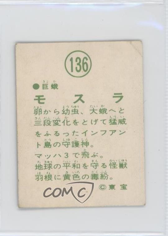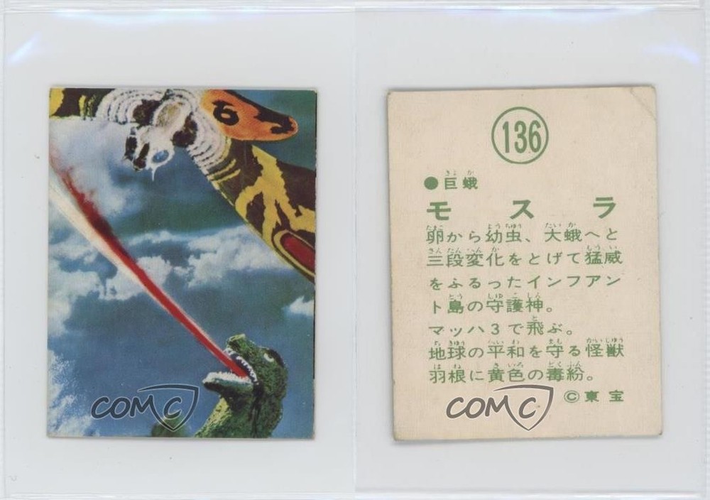 1970 Yamakatsu Mothra vs Godzilla Pull Pack - [Base] #136 Mothra, Godzilla COMC Item: 248530730 - Non-Sports Card - Featuring Mothra and Godzilla Search for more: 1970 Yamakatsu Mothra vs Godzilla Pull Pack Search for more: 1970 Yamakatsu Mothra vs Godzilla Pull Pack - [Base] View all of our Listings Auctions Buy It Now About Us Located in the beautiful Pacific Northwest, COMC (Check Out My Cards) is the world's largest consignment service for trading card singles. More than 10,000 people have used our consignment service to list over 50 million trading cards. Find out how we can help you consign your items on eBay by contacting us through eBay messaging. COMC -- "The Safe & Easy Way to Buy & Sell" Raw Condition for Modern Cards Unless otherwise noted, raw modern cards are listed in Near Mint-Mint condition or better. A NM-MT card appears to be Mint at first glance, but upon closer inspection, may exhibit some of the following: minor print defects (e.g. roller marks, print line, dimple), minor scratches, slight edge wear, and slight corner wear. Centering is clearly visible in the images provided and does not factor into our condition assessment. Raw Condition for Vintage Cards Unless otherwise noted, raw vintage cards are listed in Excellent condition or better. An EX card may exhibit some of the following: minor rounding of corners, surface wear, print defects, light scratches, and slight edge wear/chipping. Centering is clearly visible in the images provided and does not factor into our condition assessment. Domestic Shipping Combined shipping for multiple items is available. To receive combined shipping, please ensure all desired items are in your eBay shopping cart before proceeding to checkout. eBay limits orders to 40 items per order. We automatically combine multiple orders placed on the same day. If you place multiple orders on the same day, please contact us to request a refund of applicable shipping costs. Signature confirmation may be required on invoices over $400. All cards are protected and shipped securely. International Shipping COMC offers eBay's International Shipping (EIS) for international orders under $2,500* (see country exceptions below). All duties and import fees are paid at checkout; in the rare event that there are additional import fees upon delivery, these are borne by the buyer. EIS packages route through a shipping hub in Erlanger, KY before shipping to their final destination. Please note that EIS does not allow for combined shipments. The shipping rates are determined by eBay and cannot be adjusted. *Maximum sale price exceptions: Colombia, Kuwait ($2,000); Taiwan ($1,539); Chile, Costa Rica, Guatemala, Honduras, Trinidad and Tobago ($1,000); Antigua and Barbuda, Aruba, Belize, Dominica, Grenada, Philippines, Saint Kitts and Nevis, Saint Lucia, Montserrat, Turks and Caicos Islands ($500); Dominican Republic, El Salvador ($200). Please request a shipping quote through eBay messaging for orders that exceed the maximum sale price supported by eBay's International Shipping. You will be responsible for all duties and import fees for international orders shipped outside the EIS. All cards are protected and shipped securely. Payment COMC does not accept offers on our cards through our eBay storefront. COMC utilizes eBay’s managed payments system. If you are experiencing difficulties making a payment, please contact eBay for assistance. Return Policy Returns are only accepted on the rare occasion the item is not as described. If you are making a return, please initiate the return process through eBay so a mailing label can be provided for you. Prior to listing, our expert team carefully assessed this item to represent it accurately. Please review the description and high-definition images prior to purchasing to ensure this item meets your satisfaction. We welcome you to contact us if you have further questions about this item. Trust and Integrity COMC carefully assesses each item consigned to us to prevent fraudulent items from entering the marketplace. If you believe an item offered on COMC may be fraudulent, please contact us with details so we can investigate the issue. Items we determine are outside our supported items policy may be removed. Last Modified: 6/12/2025 6:36:15 PM PDT