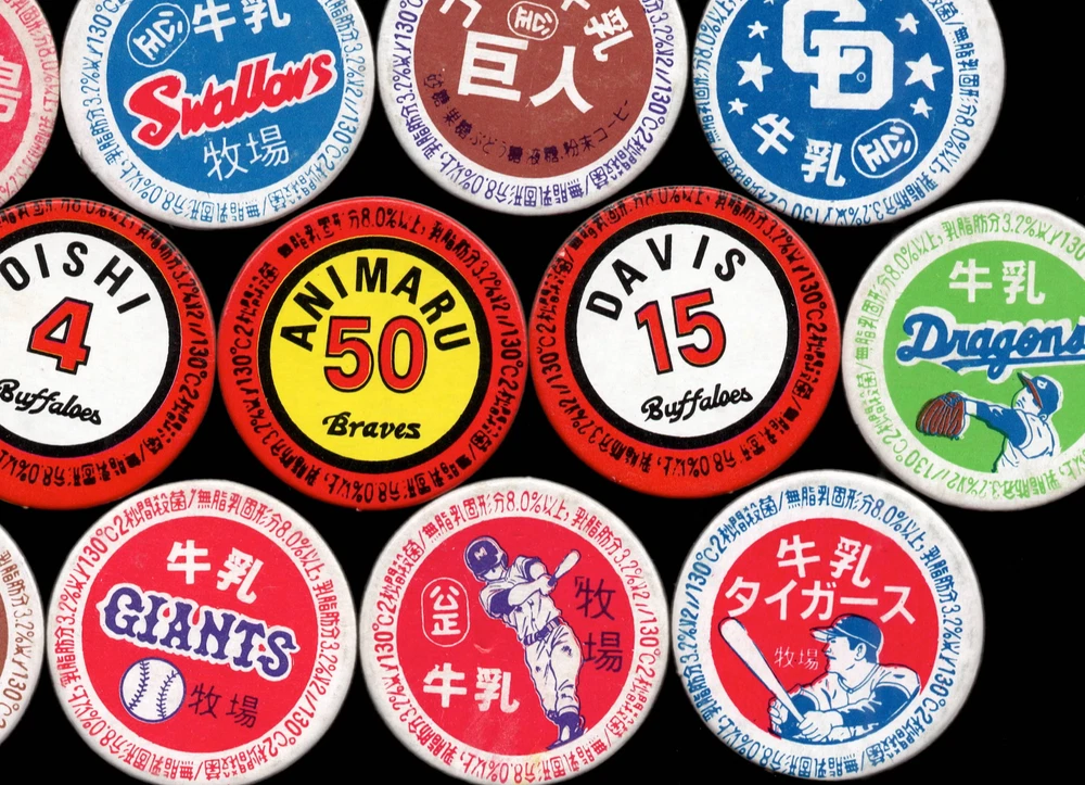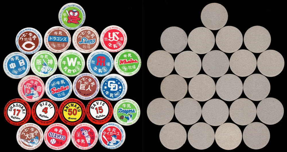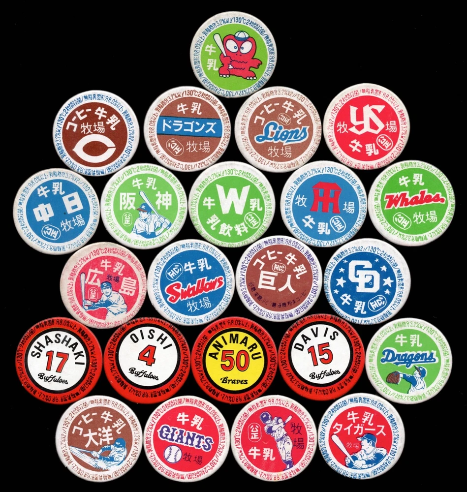 1970's JRM Unc. (JRM-Uncatalogued) Milk Cap Round Japanese Baseball Menko-like Card 1-3/8" 23 Different All Japanese Baseball related includes... Pro Player Uniform Numbers , Pro Teams , Generic Players , etc. These smaller Thick Stock multi-color Milk Caps were made in the 1970's. These cards/caps are Uncatalogued in the Japanese Baseball Card Catalog. This series has hundreds of different caps with a small % being baseball related. Others include Popeye & Bluto, Soccer, Converse, Godzilla, Ninjas, Jet Planes, Baseball Team names, etc. There are different levels of Scarcity. 23 Different in Lot thick sturdy stock light to average wear collector grade. smaller at 1-3/8" wide ea. Great for the 'type card collector', or Japanese Card collector.... guaranteed authentic and unaltered. ~ SHIPPING ~ I have to start charging for shipping on items over $20. On $20+, It cost me $4.36 to send a small 3oz USPS tracked envelope. On mid-range items in the $20-$50 range I need to charge for a part of this fee so have a new $2 Shipping Charge on some items. Mahalo