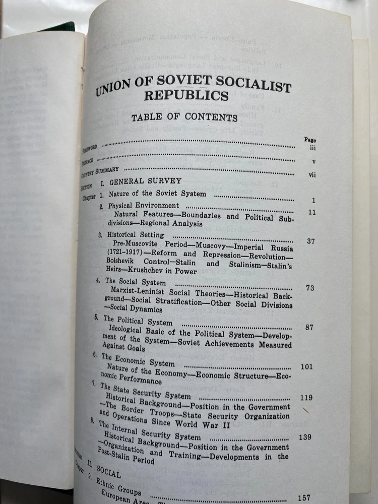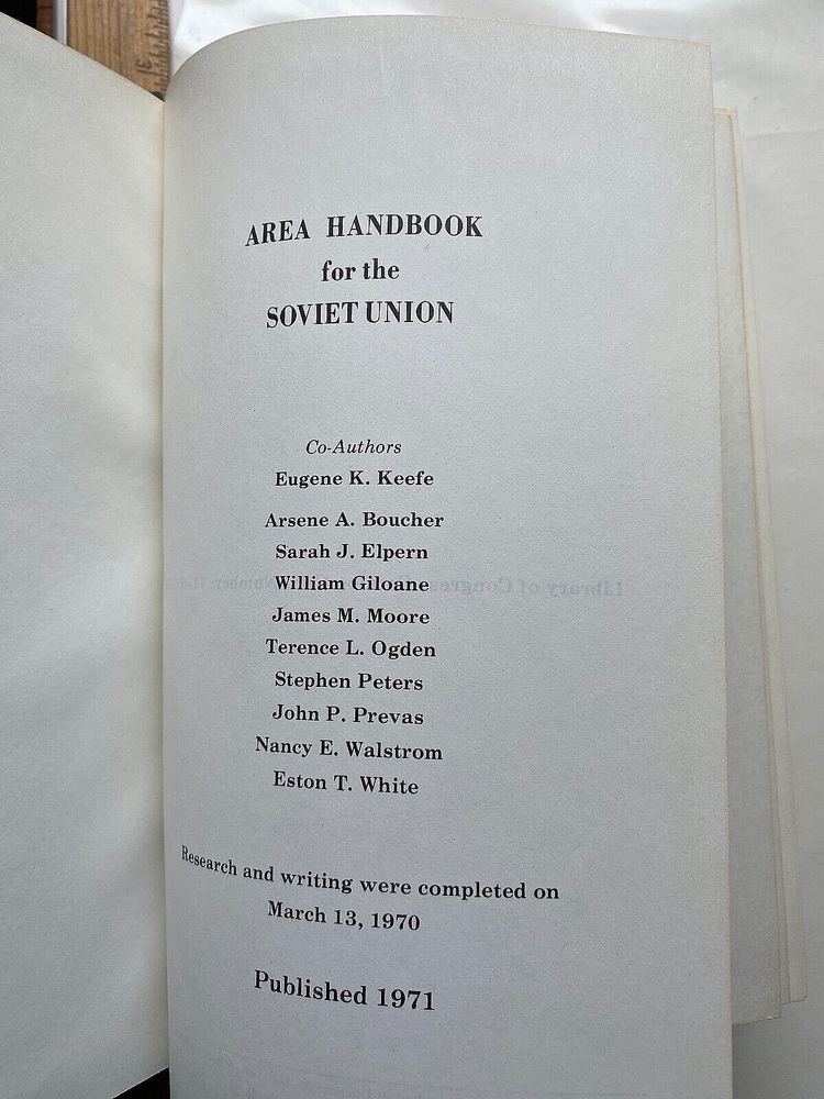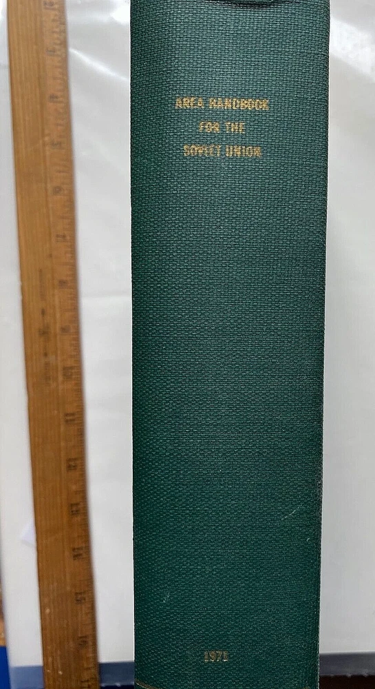 Keefe, Eugene, et.al. Area Handbook for the Soviet Union. U.S. Government Printing Office. 1 971. Large 827 page hardcover. No dust jacket. Illustrated, including a couple of fold-out maps. One of a series of large, hardcover handbooks prepared by Foreign Area Studies of the American University. Obviously for use by civilian and military offices of the U.S. Government. G-VG condition. Slight edge and corner wear, some fading/light soiling on front cover. Pages are tight and clean. I use a poor/fair/good/very good/excellent/mint grading system and grade very conservatively (see my feedback). This does NOT necessarily correspond to the generic Ebay grading system that we must use. Shipping is $6.95 in the U.S. International Buyers – Please Note Please obtain shipping quote before bidding. Import duties, taxes and charges are not included in the item price or shipping charges. These charges are the buyer's responsibility. Please check with your country's customs office to determine what these additional costs will be prior to bidding/buying. Thank you. We cannot be responsible for transit times through customs. THANKS FOR LOOKING! WE NOW HAVE OUR EBAY STORE! CHECK IT OUT FOR MORE VINTAGE ITEMS. Track Page Views With Auctiva's FREE Counter