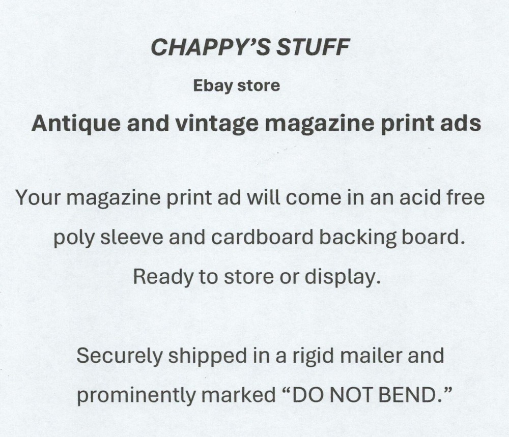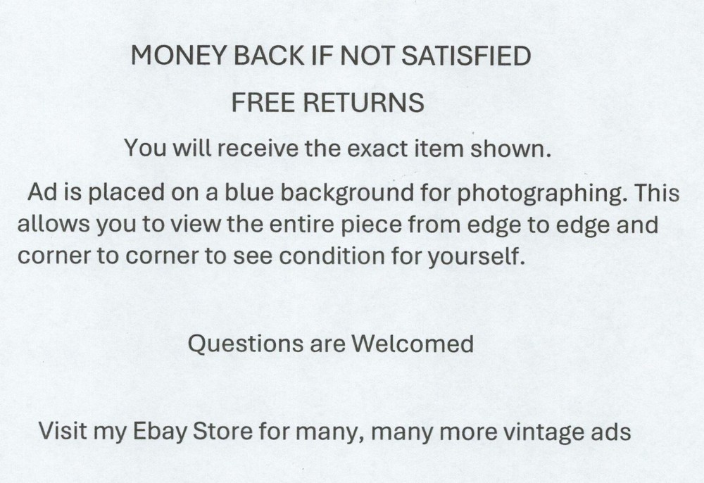 The PRINT AD is photographed on top of a blue poster board. This allows you to actually see the entire Ad from edge to edge to allow you to determine the condition. The actual PRINT AD does NOT have a blue border. Removed from a 1972 Magazine. Please use the magnifier to review the photo to determine condition. * Ready to frame * Approximately 8" x 11" in size * Vintage magazine ad from 1972 * Not a reproduction or copy. * Original ad carefully removed from an old (vintage magazine) All our ads are original and suitable for framing. Your item will be placed in a acid free poly sleeve with an acid free backboard and then shipped in a rigid carboard mailer which will be prominently marked "DO NOT BEND" Upon arrival if you have any issue with your item kindly contact us directly Thanks so much for looking and please check out our other items. I do combine shipping.