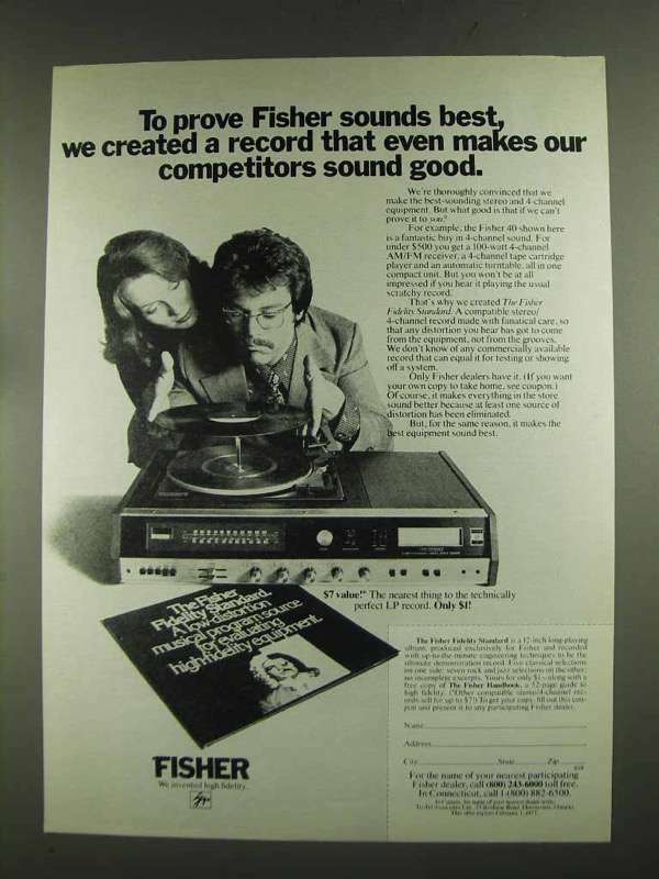 Item ID: CZ0708 This listing is for a vintage paper advertisement. This is a 1972 ad for a Fisher 40 Stereo! The size of the ad is approximately 8.5x11inches. The caption for this ad is 'To prove Fisher sounds best, we created a record that even makes our competitors sound good' The ad is in great condition. This vintage ad would look great framed and displayed! Add it to your collecction today!