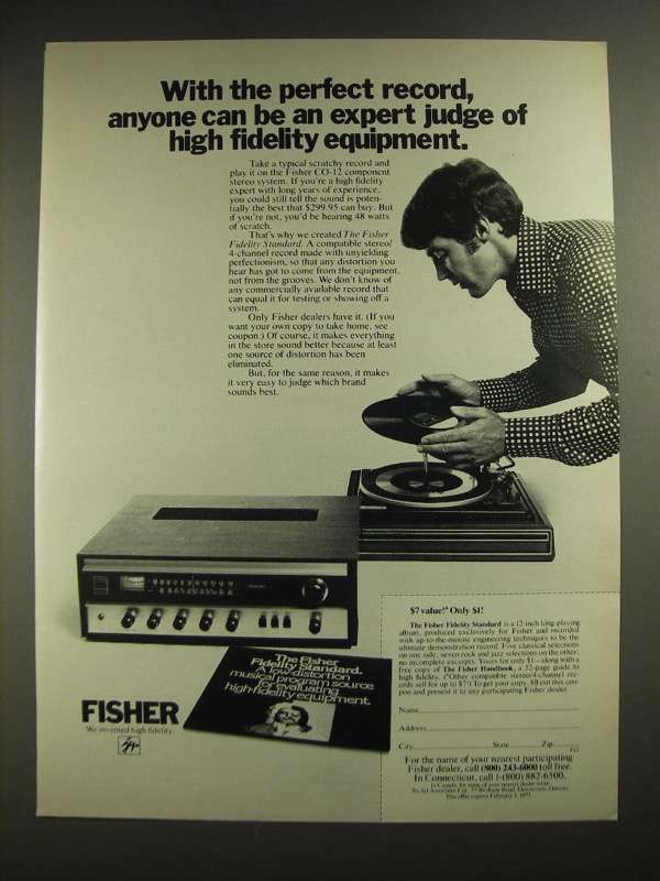 Item ID: EH0313 This listing is for a vintage paper advertisement. This is a 1972 ad for a Fisher CO-12 Component Stereo System! The size of the ad is approximately 8.5x11inches. The caption for this ad is 'With the perfect record, anyone can be an expert judge of high fidelity equipment' The ad is in great condition. This vintage ad would look great framed and displayed! Add it to your collection today!