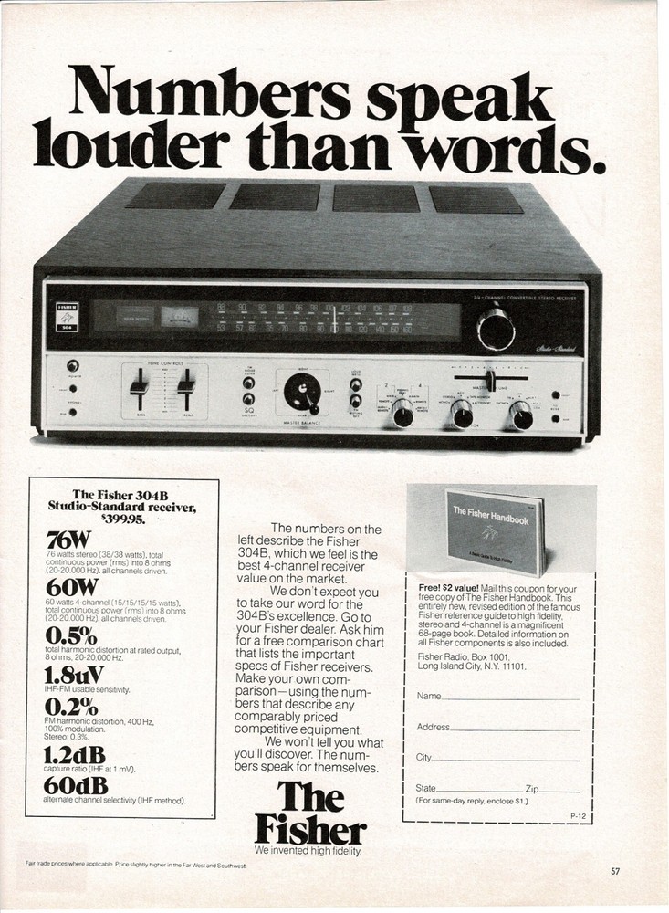 ADVERTISEMENT : 1973 Fisher 304B Studio Standard Receiver Stereo Hi-Fi VTG PRINT AD SIZE APPROXIMATELY: 8" x 11" CONDITION : No tears, stains or creases. Please note: This sale is for the vintage paper advertisement shown and not the item in the advertisement. It is not a copy, reprint or repro of any kind. Why not purchase one (or more) now! These old advertisements are ideal for: Collectors Historians Museums An intriguing gift Home and Business decor Don't just think of these as old pieces of paper. These are pieces of history. They show the changing fashions, architecture, furniture, design aesthetics and much more over the course of time. Many old ads have detailed info about the product they are advertising and can help with research. They also make a fine substitute for expensive artwork. Many old ads are very beautiful, or have bold graphics; many are drawn and signed by famous artists and illustrators. You could decorate your business, whole house or apartment, man or woman cave with vintage advertisements for the same price as one piece of fine art. Like this item? Why not purchase it now! About The Advertisements All advertisements are carefully removed from the source (magazines, newspapers, books, etc.) and are completely original. No copies, reprints or reproductions of any kind . Most vintage ads were printed on very thin paper and so some of the printing or advertisement from the reverse side may be visible. Ads are shipped flat and are packaged using archival acid-free backing boards and acid-free, clear plastic sleeves. Payment, Shipping and Returns I accept Paypal. Combined Shipping: I only charge shipping for one ad and/or print, no matter how many are purchased, if all items are paid for with a single payment. Items paid for separately will be shipped separately and do not qualify for discounts. If you are having trouble making a combined payment for all your items, please contact me BEFORE making your payment. I may be able to help out and save you some money. 30 day return policy for any reason Thanks for looking!