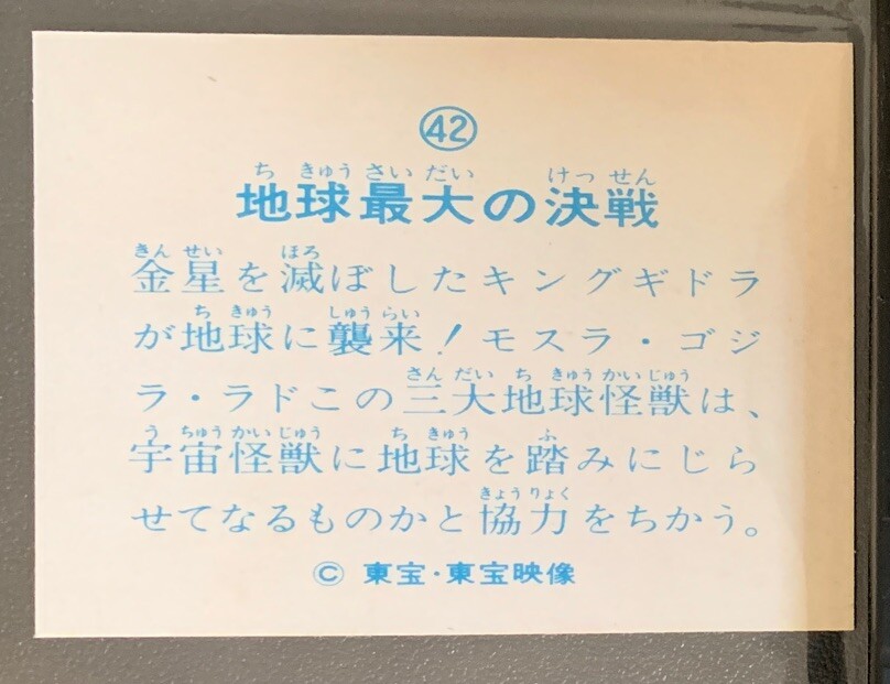 This vintage 1973 Godzilla card is a must-have for any kaiju collector! The vibrant artwork featuring Rodan, Ghidorah, and Mothra brings back nostalgic Toho monster battles. The card’s condition is impressive for its age, making it a standout piece. Perfect for fans of classic Godzilla memorabilia—highly recommended!