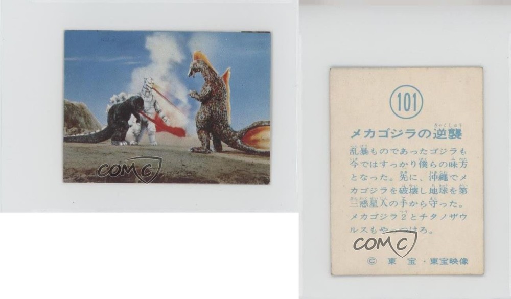 1974 Yamakatsu Godzilla Anthology - [Base] #101 Godzilla COMC Item: 248620763 - Non-Sports Card - Featuring Godzilla Search for more: 1974 Yamakatsu Godzilla Anthology Search for more: 1974 Yamakatsu Godzilla Anthology - [Base] View all of our Listings Auctions Buy It Now About Us Located in the beautiful Pacific Northwest, COMC (Check Out My Cards) is the world's largest consignment service for trading card singles. More than 10,000 people have used our consignment service to list over 50 million trading cards. Find out how we can help you consign your items on eBay by contacting us through eBay messaging. COMC -- "The Safe & Easy Way to Buy & Sell" Raw Condition for Modern Cards Unless otherwise noted, raw modern cards are listed in Near Mint-Mint condition or better. A NM-MT card appears to be Mint at first glance, but upon closer inspection, may exhibit some of the following: minor print defects (e.g. roller marks, print line, dimple), minor scratches, slight edge wear, and slight corner wear. Centering is clearly visible in the images provided and does not factor into our condition assessment. Raw Condition for Vintage Cards Unless otherwise noted, raw vintage cards are listed in Excellent condition or better. An EX card may exhibit some of the following: minor rounding of corners, surface wear, print defects, light scratches, and slight edge wear/chipping. Centering is clearly visible in the images provided and does not factor into our condition assessment. Domestic Shipping Combined shipping for multiple items is available. To receive combined shipping, please ensure all desired items are in your eBay shopping cart before proceeding to checkout. eBay limits orders to 40 items per order. We automatically combine multiple orders placed on the same day. If you place multiple orders on the same day, please contact us to request a refund of applicable shipping costs. Signature confirmation may be required on invoices over $400. All cards are protected and shipped securely. International Shipping COMC offers eBay's International Shipping (EIS) for international orders under $2,500* (see country exceptions below). All duties and import fees are paid at checkout; in the rare event that there are additional import fees upon delivery, these are borne by the buyer. EIS packages route through a shipping hub in Erlanger, KY before shipping to their final destination. Please note that EIS does not allow for combined shipments. The shipping rates are determined by eBay and cannot be adjusted. *Maximum sale price exceptions: Colombia, Kuwait ($2,000); Taiwan ($1,539); Chile, Costa Rica, Guatemala, Honduras, Trinidad and Tobago ($1,000); Antigua and Barbuda, Aruba, Belize, Dominica, Grenada, Philippines, Saint Kitts and Nevis, Saint Lucia, Montserrat, Turks and Caicos Islands ($500); Dominican Republic, El Salvador ($200). Please request a shipping quote through eBay messaging for orders that exceed the maximum sale price supported by eBay's International Shipping. You will be responsible for all duties and import fees for international orders shipped outside the EIS. All cards are protected and shipped securely. Payment COMC does not accept offers on our cards through our eBay storefront. COMC utilizes eBay’s managed payments system. If you are experiencing difficulties making a payment, please contact eBay for assistance. Return Policy Returns are only accepted on the rare occasion the item is not as described. If you are making a return, please initiate the return process through eBay so a mailing label can be provided for you. Prior to listing, our expert team carefully assessed this item to represent it accurately. Please review the description and high-definition images prior to purchasing to ensure this item meets your satisfaction. We welcome you to contact us if you have further questions about this item. Trust and Integrity COMC carefully assesses each item consigned to us to prevent fraudulent items from entering the marketplace. If you believe an item offered on COMC may be fraudulent, please contact us with details so we can investigate the issue. Items we determine are outside our supported items policy may be removed. Last Modified: 6/13/2025 11:58:19 AM PDT