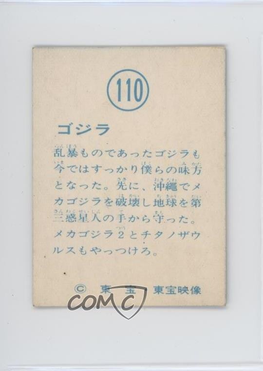1974 Yamakatsu Godzilla Anthology - [Base] #110 Godzilla COMC Item: 229998563 - Non-Sports Card - Featuring Godzilla Search for more: 1974 Yamakatsu Godzilla Anthology Search for more: 1974 Yamakatsu Godzilla Anthology - [Base] View all of our Listings Auctions Buy It Now About Us Located in the beautiful Pacific Northwest, COMC (Check Out My Cards) is the world's largest consignment service for trading card singles. More than 10,000 people have used our consignment service to list over 50 million trading cards. Find out how we can help you consign your items on eBay by contacting us through eBay messaging. COMC -- "The Safe & Easy Way to Buy & Sell" Raw Condition for Modern Cards Unless otherwise noted, raw modern cards are listed in Near Mint-Mint condition or better. A NM-MT card appears to be Mint at first glance, but upon closer inspection, may exhibit some of the following: minor print defects (e.g. roller marks, print line, dimple), minor scratches, slight edge wear, and slight corner wear. Centering is clearly visible in the images provided and does not factor into our condition assessment. Raw Condition for Vintage Cards Unless otherwise noted, raw vintage cards are listed in Excellent condition or better. An EX card may exhibit some of the following: minor rounding of corners, surface wear, print defects, light scratches, and slight edge wear/chipping. Centering is clearly visible in the images provided and does not factor into our condition assessment. Domestic Shipping Combined shipping for multiple items is available. To receive combined shipping, please ensure all desired items are in your eBay shopping cart before proceeding to checkout. eBay limits orders to 40 items per order. We automatically combine multiple orders placed on the same day. If you place multiple orders on the same day, please contact us to request a refund of applicable shipping costs. Signature confirmation may be required on invoices over $400. All cards are protected and shipped securely. International Shipping COMC offers eBay's International Shipping (EIS) for international orders under $2,500* (see country exceptions below). All duties and import fees are paid at checkout; in the rare event that there are additional import fees upon delivery, these are borne by the buyer. EIS packages route through a shipping hub in Erlanger, KY before shipping to their final destination. Please note that EIS does not allow for combined shipments. The shipping rates are determined by eBay and cannot be adjusted. *Maximum sale price exceptions: Colombia, Kuwait ($2,000); Taiwan ($1,539); Chile, Costa Rica, Guatemala, Honduras, Trinidad and Tobago ($1,000); Antigua and Barbuda, Aruba, Belize, Dominica, Grenada, Philippines, Saint Kitts and Nevis, Saint Lucia, Montserrat, Turks and Caicos Islands ($500); Dominican Republic, El Salvador ($200). Please request a shipping quote through eBay messaging for orders that exceed the maximum sale price supported by eBay's International Shipping. You will be responsible for all duties and import fees for international orders shipped outside the EIS. All cards are protected and shipped securely. Payment COMC does not accept offers on our cards through our eBay storefront. COMC utilizes eBay’s managed payments system. If you are experiencing difficulties making a payment, please contact eBay for assistance. Return Policy Returns are only accepted on the rare occasion the item is not as described. If you are making a return, please initiate the return process through eBay so a mailing label can be provided for you. Prior to listing, our expert team carefully assessed this item to represent it accurately. Please review the description and high-definition images prior to purchasing to ensure this item meets your satisfaction. We welcome you to contact us if you have further questions about this item. Trust and Integrity COMC carefully assesses each item consigned to us to prevent fraudulent items from entering the marketplace. If you believe an item offered on COMC may be fraudulent, please contact us with details so we can investigate the issue. Items we determine are outside our supported items policy may be removed. Last Modified: 6/12/2025 5:58:36 PM PDT