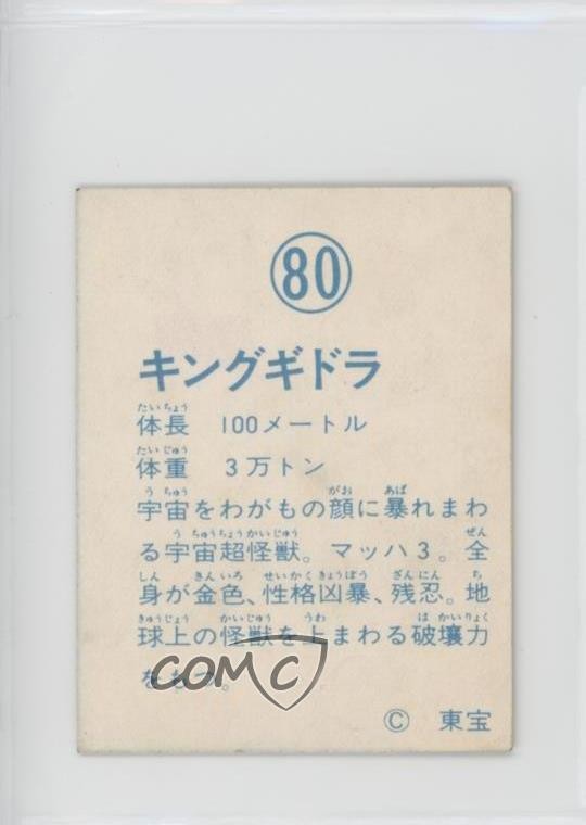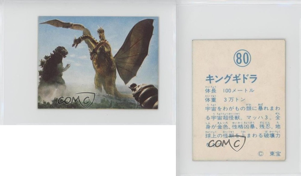 1974 Yamakatsu Godzilla Anthology - [Base] #80 Godzilla, Ghidorah COMC Item: 248530696 - Non-Sports Card - Featuring Godzilla and Ghidorah Search for more: 1974 Yamakatsu Godzilla Anthology Search for more: 1974 Yamakatsu Godzilla Anthology - [Base] View all of our Listings Auctions Buy It Now About Us Located in the beautiful Pacific Northwest, COMC (Check Out My Cards) is the world's largest consignment service for trading card singles. More than 10,000 people have used our consignment service to list over 50 million trading cards. Find out how we can help you consign your items on eBay by contacting us through eBay messaging. COMC -- "The Safe & Easy Way to Buy & Sell" Raw Condition for Modern Cards Unless otherwise noted, raw modern cards are listed in Near Mint-Mint condition or better. A NM-MT card appears to be Mint at first glance, but upon closer inspection, may exhibit some of the following: minor print defects (e.g. roller marks, print line, dimple), minor scratches, slight edge wear, and slight corner wear. Centering is clearly visible in the images provided and does not factor into our condition assessment. Raw Condition for Vintage Cards Unless otherwise noted, raw vintage cards are listed in Excellent condition or better. An EX card may exhibit some of the following: minor rounding of corners, surface wear, print defects, light scratches, and slight edge wear/chipping. Centering is clearly visible in the images provided and does not factor into our condition assessment. Domestic Shipping Combined shipping for multiple items is available. To receive combined shipping, please ensure all desired items are in your eBay shopping cart before proceeding to checkout. eBay limits orders to 40 items per order. We automatically combine multiple orders placed on the same day. If you place multiple orders on the same day, please contact us to request a refund of applicable shipping costs. Signature confirmation may be required on invoices over $400. All cards are protected and shipped securely. International Shipping COMC offers eBay's International Shipping (EIS) for international orders under $2,500* (see country exceptions below). All duties and import fees are paid at checkout; in the rare event that there are additional import fees upon delivery, these are borne by the buyer. EIS packages route through a shipping hub in Erlanger, KY before shipping to their final destination. Please note that EIS does not allow for combined shipments. The shipping rates are determined by eBay and cannot be adjusted. *Maximum sale price exceptions: Colombia, Kuwait ($2,000); Taiwan ($1,539); Chile, Costa Rica, Guatemala, Honduras, Trinidad and Tobago ($1,000); Antigua and Barbuda, Aruba, Belize, Dominica, Grenada, Philippines, Saint Kitts and Nevis, Saint Lucia, Montserrat, Turks and Caicos Islands ($500); Dominican Republic, El Salvador ($200). Please request a shipping quote through eBay messaging for orders that exceed the maximum sale price supported by eBay's International Shipping. You will be responsible for all duties and import fees for international orders shipped outside the EIS. All cards are protected and shipped securely. Payment COMC does not accept offers on our cards through our eBay storefront. COMC utilizes eBay’s managed payments system. If you are experiencing difficulties making a payment, please contact eBay for assistance. Return Policy Returns are only accepted on the rare occasion the item is not as described. If you are making a return, please initiate the return process through eBay so a mailing label can be provided for you. Prior to listing, our expert team carefully assessed this item to represent it accurately. Please review the description and high-definition images prior to purchasing to ensure this item meets your satisfaction. We welcome you to contact us if you have further questions about this item. Trust and Integrity COMC carefully assesses each item consigned to us to prevent fraudulent items from entering the marketplace. If you believe an item offered on COMC may be fraudulent, please contact us with details so we can investigate the issue. Items we determine are outside our supported items policy may be removed. Last Modified: 6/12/2025 10:52:21 PM PDT