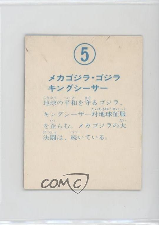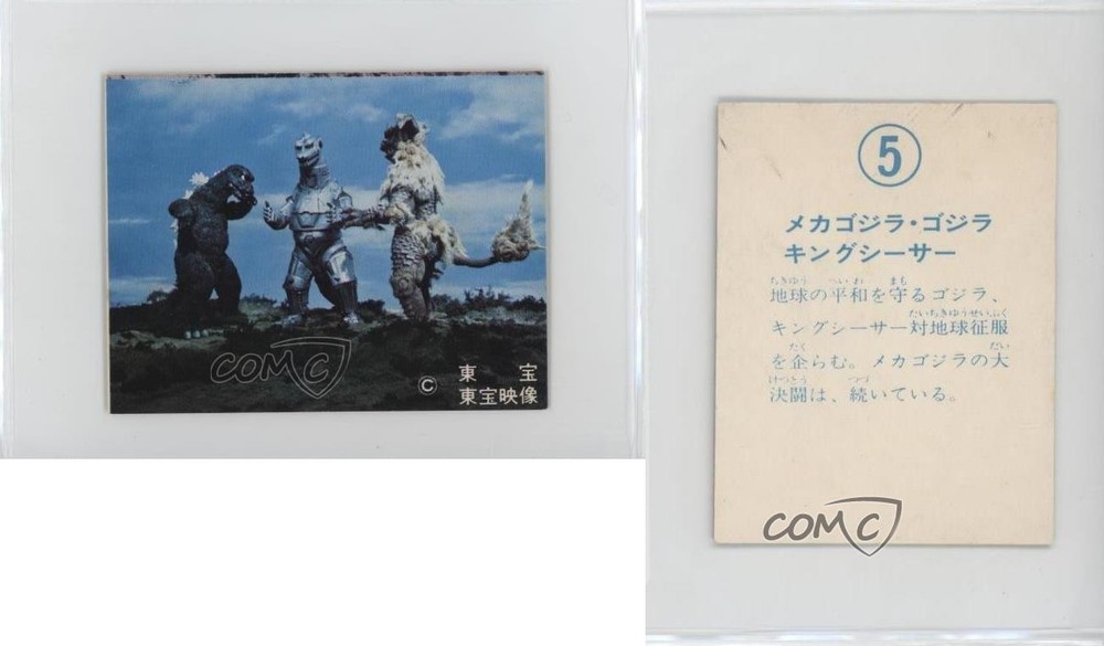 1974 Yamakatsu Godzilla Anthology - [Base] #5 Godzilla, Mechagodzilla, King Caesar COMC Item: 185131482 - Non-Sports Card - Featuring Godzilla , Mechagodzilla and King Caesar Search for more: 1974 Yamakatsu Godzilla Anthology Search for more: 1974 Yamakatsu Godzilla Anthology - [Base] View all of our Listings Auctions Buy It Now About Us Located in the beautiful Pacific Northwest, COMC (Check Out My Cards) is the world's largest consignment service for trading card singles. More than 10,000 people have used our consignment service to list over 50 million trading cards. Find out how we can help you consign your items on eBay by contacting us through eBay messaging. COMC -- "The Safe & Easy Way to Buy & Sell" Raw Condition for Modern Cards Unless otherwise noted, raw modern cards are listed in Near Mint-Mint condition or better. A NM-MT card appears to be Mint at first glance, but upon closer inspection, may exhibit some of the following: minor print defects (e.g. roller marks, print line, dimple), minor scratches, slight edge wear, and slight corner wear. Centering is clearly visible in the images provided and does not factor into our condition assessment. Raw Condition for Vintage Cards Unless otherwise noted, raw vintage cards are listed in Excellent condition or better. An EX card may exhibit some of the following: minor rounding of corners, surface wear, print defects, light scratches, and slight edge wear/chipping. Centering is clearly visible in the images provided and does not factor into our condition assessment. Domestic Shipping Combined shipping for multiple items is available. To receive combined shipping, please ensure all desired items are in your eBay shopping cart before proceeding to checkout. eBay limits orders to 40 items per order. We automatically combine multiple orders placed on the same day. If you place multiple orders on the same day, please contact us to request a refund of applicable shipping costs. Signature confirmation may be required on invoices over $400. All cards are protected and shipped securely. International Shipping COMC offers eBay's International Shipping (EIS) for international orders under $2,500* (see country exceptions below). All duties and import fees are paid at checkout; in the rare event that there are additional import fees upon delivery, these are borne by the buyer. EIS packages route through a shipping hub in Erlanger, KY before shipping to their final destination. Please note that EIS does not allow for combined shipments. The shipping rates are determined by eBay and cannot be adjusted. *Maximum sale price exceptions: Colombia, Kuwait ($2,000); Taiwan ($1,539); Chile, Costa Rica, Guatemala, Honduras, Trinidad and Tobago ($1,000); Antigua and Barbuda, Aruba, Belize, Dominica, Grenada, Philippines, Saint Kitts and Nevis, Saint Lucia, Montserrat, Turks and Caicos Islands ($500); Dominican Republic, El Salvador ($200). Please request a shipping quote through eBay messaging for orders that exceed the maximum sale price supported by eBay's International Shipping. You will be responsible for all duties and import fees for international orders shipped outside the EIS. All cards are protected and shipped securely. Payment COMC does not accept offers on our cards through our eBay storefront. COMC utilizes eBay’s managed payments system. If you are experiencing difficulties making a payment, please contact eBay for assistance. Return Policy Returns are only accepted on the rare occasion the item is not as described. If you are making a return, please initiate the return process through eBay so a mailing label can be provided for you. Prior to listing, our expert team carefully assessed this item to represent it accurately. Please review the description and high-definition images prior to purchasing to ensure this item meets your satisfaction. We welcome you to contact us if you have further questions about this item. Trust and Integrity COMC carefully assesses each item consigned to us to prevent fraudulent items from entering the marketplace. If you believe an item offered on COMC may be fraudulent, please contact us with details so we can investigate the issue. Items we determine are outside our supported items policy may be removed. Last Modified: 5/25/2025 10:44:25 AM PDT