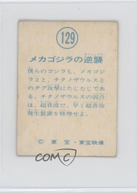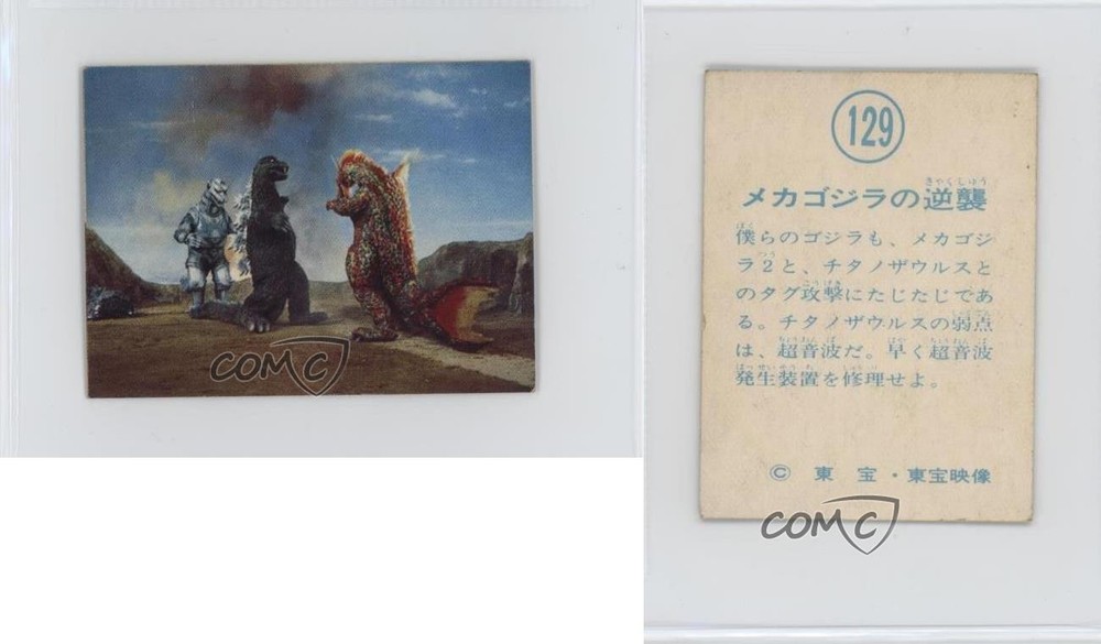 1974 Yamakatsu Godzilla Anthology - [Base] #129 Godzilla, Mechagodzilla, Titanosaurus COMC Item: 248556133 - Non-Sports Card - Featuring Godzilla , Mechagodzilla and Titanosaurus Search for more: 1974 Yamakatsu Godzilla Anthology Search for more: 1974 Yamakatsu Godzilla Anthology - [Base] View all of our Listings Auctions Buy It Now About Us Located in the beautiful Pacific Northwest, COMC (Check Out My Cards) is the world's largest consignment service for trading card singles. More than 10,000 people have used our consignment service to list over 50 million trading cards. Find out how we can help you consign your items on eBay by contacting us through eBay messaging. COMC -- "The Safe & Easy Way to Buy & Sell" Raw Condition for Modern Cards Unless otherwise noted, raw modern cards are listed in Near Mint-Mint condition or better. A NM-MT card appears to be Mint at first glance, but upon closer inspection, may exhibit some of the following: minor print defects (e.g. roller marks, print line, dimple), minor scratches, slight edge wear, and slight corner wear. Centering is clearly visible in the images provided and does not factor into our condition assessment. Raw Condition for Vintage Cards Unless otherwise noted, raw vintage cards are listed in Excellent condition or better. An EX card may exhibit some of the following: minor rounding of corners, surface wear, print defects, light scratches, and slight edge wear/chipping. Centering is clearly visible in the images provided and does not factor into our condition assessment. Domestic Shipping Combined shipping for multiple items is available. To receive combined shipping, please ensure all desired items are in your eBay shopping cart before proceeding to checkout. eBay limits orders to 40 items per order. We automatically combine multiple orders placed on the same day. If you place multiple orders on the same day, please contact us to request a refund of applicable shipping costs. Signature confirmation may be required on invoices over $400. All cards are protected and shipped securely. International Shipping COMC offers eBay's International Shipping (EIS) for international orders under $2,500* (see country exceptions below). All duties and import fees are paid at checkout; in the rare event that there are additional import fees upon delivery, these are borne by the buyer. EIS packages route through a shipping hub in Erlanger, KY before shipping to their final destination. Please note that EIS does not allow for combined shipments. The shipping rates are determined by eBay and cannot be adjusted. *Maximum sale price exceptions: Colombia, Kuwait ($2,000); Taiwan ($1,539); Chile, Costa Rica, Guatemala, Honduras, Trinidad and Tobago ($1,000); Antigua and Barbuda, Aruba, Belize, Dominica, Grenada, Philippines, Saint Kitts and Nevis, Saint Lucia, Montserrat, Turks and Caicos Islands ($500); Dominican Republic, El Salvador ($200). Please request a shipping quote through eBay messaging for orders that exceed the maximum sale price supported by eBay's International Shipping. You will be responsible for all duties and import fees for international orders shipped outside the EIS. All cards are protected and shipped securely. Payment COMC does not accept offers on our cards through our eBay storefront. COMC utilizes eBay’s managed payments system. If you are experiencing difficulties making a payment, please contact eBay for assistance. Return Policy Returns are only accepted on the rare occasion the item is not as described. If you are making a return, please initiate the return process through eBay so a mailing label can be provided for you. Prior to listing, our expert team carefully assessed this item to represent it accurately. Please review the description and high-definition images prior to purchasing to ensure this item meets your satisfaction. We welcome you to contact us if you have further questions about this item. Trust and Integrity COMC carefully assesses each item consigned to us to prevent fraudulent items from entering the marketplace. If you believe an item offered on COMC may be fraudulent, please contact us with details so we can investigate the issue. Items we determine are outside our supported items policy may be removed. Last Modified: 6/13/2025 12:02:53 AM PDT