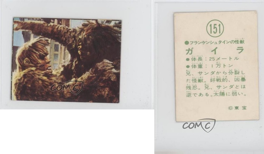 1974 Yamakatsu Godzilla Anthology - [Base] #151 Half Human COMC Item: 212876369 - Non-Sports Card Search for more: 1974 Yamakatsu Godzilla Anthology Search for more: 1974 Yamakatsu Godzilla Anthology - [Base] View all of our Listings Auctions Buy It Now About Us Located in the beautiful Pacific Northwest, COMC (Check Out My Cards) is the world's largest consignment service for trading card singles. More than 10,000 people have used our consignment service to list over 50 million trading cards. Find out how we can help you consign your items on eBay by contacting us through eBay messaging. COMC -- "The Safe & Easy Way to Buy & Sell" Raw Condition for Modern Cards Unless otherwise noted, raw modern cards are listed in Near Mint-Mint condition or better. A NM-MT card appears to be Mint at first glance, but upon closer inspection, may exhibit some of the following: minor print defects (e.g. roller marks, print line, dimple), minor scratches, slight edge wear, and slight corner wear. Centering is clearly visible in the images provided and does not factor into our condition assessment. Raw Condition for Vintage Cards Unless otherwise noted, raw vintage cards are listed in Excellent condition or better. An EX card may exhibit some of the following: minor rounding of corners, surface wear, print defects, light scratches, and slight edge wear/chipping. Centering is clearly visible in the images provided and does not factor into our condition assessment. Domestic Shipping Combined shipping for multiple items is available. To receive combined shipping, please ensure all desired items are in your eBay shopping cart before proceeding to checkout. eBay limits orders to 40 items per order. We automatically combine multiple orders placed on the same day. If you place multiple orders on the same day, please contact us to request a refund of applicable shipping costs. Signature confirmation may be required on invoices over $400. All cards are protected and shipped securely. International Shipping COMC offers eBay's International Shipping (EIS) for international orders under $2,500* (see country exceptions below). All duties and import fees are paid at checkout; in the rare event that there are additional import fees upon delivery, these are borne by the buyer. EIS packages route through a shipping hub in Erlanger, KY before shipping to their final destination. Please note that EIS does not allow for combined shipments. The shipping rates are determined by eBay and cannot be adjusted. *Maximum sale price exceptions: Colombia, Kuwait ($2,000); Taiwan ($1,539); Chile, Costa Rica, Guatemala, Honduras, Trinidad and Tobago ($1,000); Antigua and Barbuda, Aruba, Belize, Dominica, Grenada, Philippines, Saint Kitts and Nevis, Saint Lucia, Montserrat, Turks and Caicos Islands ($500); Dominican Republic, El Salvador ($200). Please request a shipping quote through eBay messaging for orders that exceed the maximum sale price supported by eBay's International Shipping. You will be responsible for all duties and import fees for international orders shipped outside the EIS. All cards are protected and shipped securely. Payment COMC does not accept offers on our cards through our eBay storefront. COMC utilizes eBay’s managed payments system. If you are experiencing difficulties making a payment, please contact eBay for assistance. Return Policy Returns are only accepted on the rare occasion the item is not as described. If you are making a return, please initiate the return process through eBay so a mailing label can be provided for you. Prior to listing, our expert team carefully assessed this item to represent it accurately. Please review the description and high-definition images prior to purchasing to ensure this item meets your satisfaction. We welcome you to contact us if you have further questions about this item. Trust and Integrity COMC carefully assesses each item consigned to us to prevent fraudulent items from entering the marketplace. If you believe an item offered on COMC may be fraudulent, please contact us with details so we can investigate the issue. Items we determine are outside our supported items policy may be removed. Last Modified: 5/4/2025 8:40:00 AM PDT