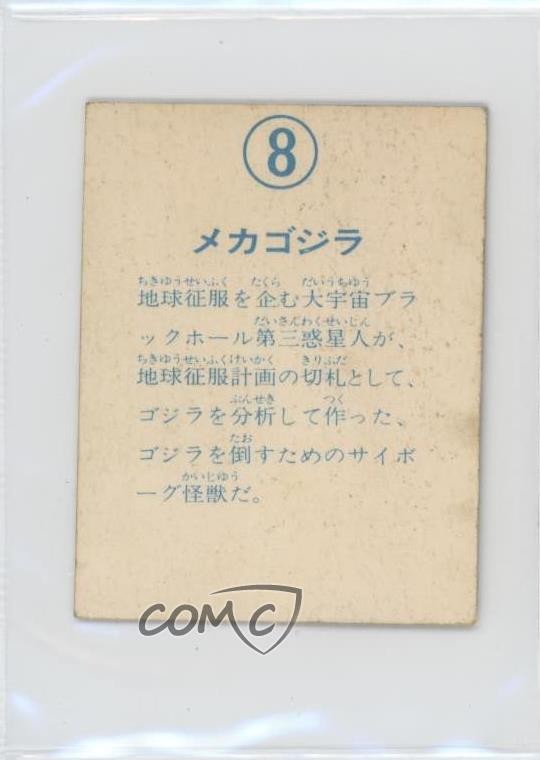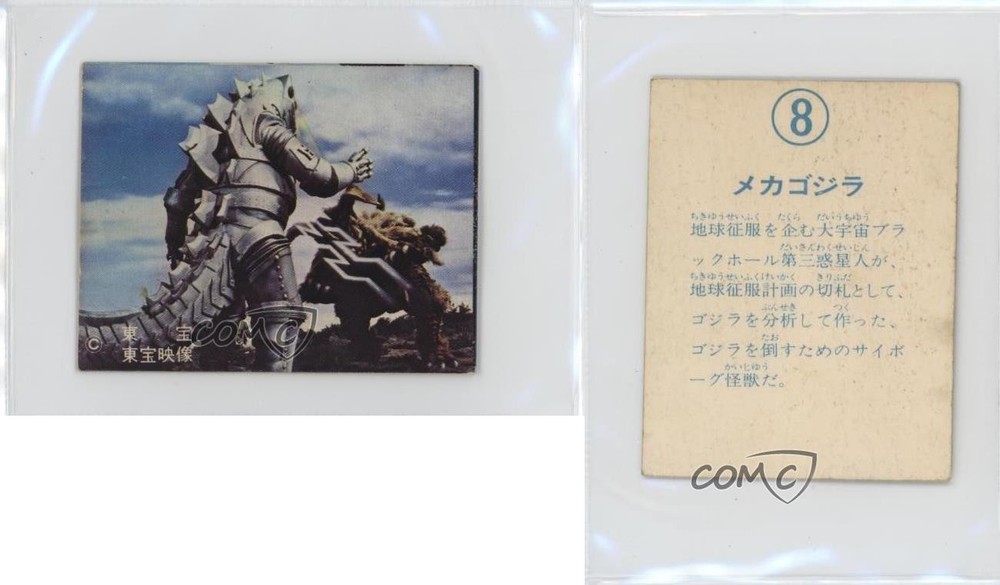 1974 Yamakatsu Godzilla Anthology - [Base] #8 Mechagodzilla, King Caesar COMC Item: 185132126 - Non-Sports Card - Featuring Mechagodzilla and King Caesar Search for more: 1974 Yamakatsu Godzilla Anthology Search for more: 1974 Yamakatsu Godzilla Anthology - [Base] View all of our Listings Auctions Buy It Now About Us Located in the beautiful Pacific Northwest, COMC (Check Out My Cards) is the world's largest consignment service for trading card singles. More than 10,000 people have used our consignment service to list over 50 million trading cards. Find out how we can help you consign your items on eBay by contacting us through eBay messaging. COMC -- "The Safe & Easy Way to Buy & Sell" Raw Condition for Modern Cards Unless otherwise noted, raw modern cards are listed in Near Mint-Mint condition or better. A NM-MT card appears to be Mint at first glance, but upon closer inspection, may exhibit some of the following: minor print defects (e.g. roller marks, print line, dimple), minor scratches, slight edge wear, and slight corner wear. Centering is clearly visible in the images provided and does not factor into our condition assessment. Raw Condition for Vintage Cards Unless otherwise noted, raw vintage cards are listed in Excellent condition or better. An EX card may exhibit some of the following: minor rounding of corners, surface wear, print defects, light scratches, and slight edge wear/chipping. Centering is clearly visible in the images provided and does not factor into our condition assessment. Domestic Shipping Combined shipping for multiple items is available. To receive combined shipping, please ensure all desired items are in your eBay shopping cart before proceeding to checkout. eBay limits orders to 40 items per order. We automatically combine multiple orders placed on the same day. If you place multiple orders on the same day, please contact us to request a refund of applicable shipping costs. Signature confirmation may be required on invoices over $400. All cards are protected and shipped securely. International Shipping COMC offers eBay's International Shipping (EIS) for international orders under $2,500* (see country exceptions below). All duties and import fees are paid at checkout; in the rare event that there are additional import fees upon delivery, these are borne by the buyer. EIS packages route through a shipping hub in Erlanger, KY before shipping to their final destination. Please note that EIS does not allow for combined shipments. The shipping rates are determined by eBay and cannot be adjusted. *Maximum sale price exceptions: Colombia, Kuwait ($2,000); Taiwan ($1,539); Chile, Costa Rica, Guatemala, Honduras, Trinidad and Tobago ($1,000); Antigua and Barbuda, Aruba, Belize, Dominica, Grenada, Philippines, Saint Kitts and Nevis, Saint Lucia, Montserrat, Turks and Caicos Islands ($500); Dominican Republic, El Salvador ($200). Please request a shipping quote through eBay messaging for orders that exceed the maximum sale price supported by eBay's International Shipping. You will be responsible for all duties and import fees for international orders shipped outside the EIS. All cards are protected and shipped securely. Payment COMC does not accept offers on our cards through our eBay storefront. COMC utilizes eBay’s managed payments system. If you are experiencing difficulties making a payment, please contact eBay for assistance. Return Policy Returns are only accepted on the rare occasion the item is not as described. If you are making a return, please initiate the return process through eBay so a mailing label can be provided for you. Prior to listing, our expert team carefully assessed this item to represent it accurately. Please review the description and high-definition images prior to purchasing to ensure this item meets your satisfaction. We welcome you to contact us if you have further questions about this item. Trust and Integrity COMC carefully assesses each item consigned to us to prevent fraudulent items from entering the marketplace. If you believe an item offered on COMC may be fraudulent, please contact us with details so we can investigate the issue. Items we determine are outside our supported items policy may be removed. Last Modified: 5/25/2025 10:49:29 AM PDT