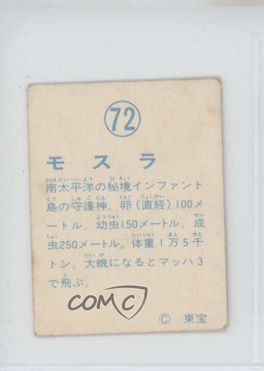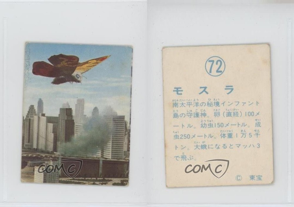 1974 Yamakatsu Godzilla Anthology - [Base] #72 Mothra COMC Item: 212879980 - Non-Sports Card - Featuring Mothra Search for more: 1974 Yamakatsu Godzilla Anthology Search for more: 1974 Yamakatsu Godzilla Anthology - [Base] View all of our Listings Auctions Buy It Now About Us Located in the beautiful Pacific Northwest, COMC (Check Out My Cards) is the world's largest consignment service for trading card singles. More than 10,000 people have used our consignment service to list over 50 million trading cards. Find out how we can help you consign your items on eBay by contacting us through eBay messaging. COMC -- "The Safe & Easy Way to Buy & Sell" Raw Condition for Modern Cards Unless otherwise noted, raw modern cards are listed in Near Mint-Mint condition or better. A NM-MT card appears to be Mint at first glance, but upon closer inspection, may exhibit some of the following: minor print defects (e.g. roller marks, print line, dimple), minor scratches, slight edge wear, and slight corner wear. Centering is clearly visible in the images provided and does not factor into our condition assessment. Raw Condition for Vintage Cards Unless otherwise noted, raw vintage cards are listed in Excellent condition or better. An EX card may exhibit some of the following: minor rounding of corners, surface wear, print defects, light scratches, and slight edge wear/chipping. Centering is clearly visible in the images provided and does not factor into our condition assessment. Domestic Shipping Combined shipping for multiple items is available. To receive combined shipping, please ensure all desired items are in your eBay shopping cart before proceeding to checkout. eBay limits orders to 40 items per order. We automatically combine multiple orders placed on the same day. If you place multiple orders on the same day, please contact us to request a refund of applicable shipping costs. Signature confirmation may be required on invoices over $400. All cards are protected and shipped securely. International Shipping COMC offers eBay's International Shipping (EIS) for international orders under $2,500* (see country exceptions below). All duties and import fees are paid at checkout; in the rare event that there are additional import fees upon delivery, these are borne by the buyer. EIS packages route through a shipping hub in Erlanger, KY before shipping to their final destination. Please note that EIS does not allow for combined shipments. The shipping rates are determined by eBay and cannot be adjusted. *Maximum sale price exceptions: Colombia, Kuwait ($2,000); Taiwan ($1,539); Chile, Costa Rica, Guatemala, Honduras, Trinidad and Tobago ($1,000); Antigua and Barbuda, Aruba, Belize, Dominica, Grenada, Philippines, Saint Kitts and Nevis, Saint Lucia, Montserrat, Turks and Caicos Islands ($500); Dominican Republic, El Salvador ($200). Please request a shipping quote through eBay messaging for orders that exceed the maximum sale price supported by eBay's International Shipping. You will be responsible for all duties and import fees for international orders shipped outside the EIS. All cards are protected and shipped securely. Payment COMC does not accept offers on our cards through our eBay storefront. COMC utilizes eBay’s managed payments system. If you are experiencing difficulties making a payment, please contact eBay for assistance. Return Policy Returns are only accepted on the rare occasion the item is not as described. If you are making a return, please initiate the return process through eBay so a mailing label can be provided for you. Prior to listing, our expert team carefully assessed this item to represent it accurately. Please review the description and high-definition images prior to purchasing to ensure this item meets your satisfaction. We welcome you to contact us if you have further questions about this item. Trust and Integrity COMC carefully assesses each item consigned to us to prevent fraudulent items from entering the marketplace. If you believe an item offered on COMC may be fraudulent, please contact us with details so we can investigate the issue. Items we determine are outside our supported items policy may be removed. Last Modified: 6/12/2025 7:20:23 AM PDT