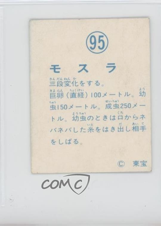 1974 Yamakatsu Godzilla Anthology - [Base] #95 Mothra COMC Item: 212846218 - Non-Sports Card - Featuring Mothra Search for more: 1974 Yamakatsu Godzilla Anthology Search for more: 1974 Yamakatsu Godzilla Anthology - [Base] View all of our Listings Auctions Buy It Now About Us Located in the beautiful Pacific Northwest, COMC (Check Out My Cards) is the world's largest consignment service for trading card singles. More than 10,000 people have used our consignment service to list over 50 million trading cards. Find out how we can help you consign your items on eBay by contacting us through eBay messaging. COMC -- "The Safe & Easy Way to Buy & Sell" Raw Condition for Modern Cards Unless otherwise noted, raw modern cards are listed in Near Mint-Mint condition or better. A NM-MT card appears to be Mint at first glance, but upon closer inspection, may exhibit some of the following: minor print defects (e.g. roller marks, print line, dimple), minor scratches, slight edge wear, and slight corner wear. Centering is clearly visible in the images provided and does not factor into our condition assessment. Raw Condition for Vintage Cards Unless otherwise noted, raw vintage cards are listed in Excellent condition or better. An EX card may exhibit some of the following: minor rounding of corners, surface wear, print defects, light scratches, and slight edge wear/chipping. Centering is clearly visible in the images provided and does not factor into our condition assessment. Domestic Shipping Combined shipping for multiple items is available. To receive combined shipping, please ensure all desired items are in your eBay shopping cart before proceeding to checkout. eBay limits orders to 40 items per order. We automatically combine multiple orders placed on the same day. If you place multiple orders on the same day, please contact us to request a refund of applicable shipping costs. Signature confirmation may be required on invoices over $400. All cards are protected and shipped securely. International Shipping COMC offers eBay's International Shipping (EIS) for international orders under $2,500* (see country exceptions below). All duties and import fees are paid at checkout; in the rare event that there are additional import fees upon delivery, these are borne by the buyer. EIS packages route through a shipping hub in Erlanger, KY before shipping to their final destination. Please note that EIS does not allow for combined shipments. The shipping rates are determined by eBay and cannot be adjusted. *Maximum sale price exceptions: Colombia, Kuwait ($2,000); Taiwan ($1,539); Chile, Costa Rica, Guatemala, Honduras, Trinidad and Tobago ($1,000); Antigua and Barbuda, Aruba, Belize, Dominica, Grenada, Philippines, Saint Kitts and Nevis, Saint Lucia, Montserrat, Turks and Caicos Islands ($500); Dominican Republic, El Salvador ($200). Please request a shipping quote through eBay messaging for orders that exceed the maximum sale price supported by eBay's International Shipping. You will be responsible for all duties and import fees for international orders shipped outside the EIS. All cards are protected and shipped securely. Payment COMC does not accept offers on our cards through our eBay storefront. COMC utilizes eBay’s managed payments system. If you are experiencing difficulties making a payment, please contact eBay for assistance. Return Policy Returns are only accepted on the rare occasion the item is not as described. If you are making a return, please initiate the return process through eBay so a mailing label can be provided for you. Prior to listing, our expert team carefully assessed this item to represent it accurately. Please review the description and high-definition images prior to purchasing to ensure this item meets your satisfaction. We welcome you to contact us if you have further questions about this item. Trust and Integrity COMC carefully assesses each item consigned to us to prevent fraudulent items from entering the marketplace. If you believe an item offered on COMC may be fraudulent, please contact us with details so we can investigate the issue. Items we determine are outside our supported items policy may be removed. Last Modified: 6/6/2025 5:16:40 AM PDT