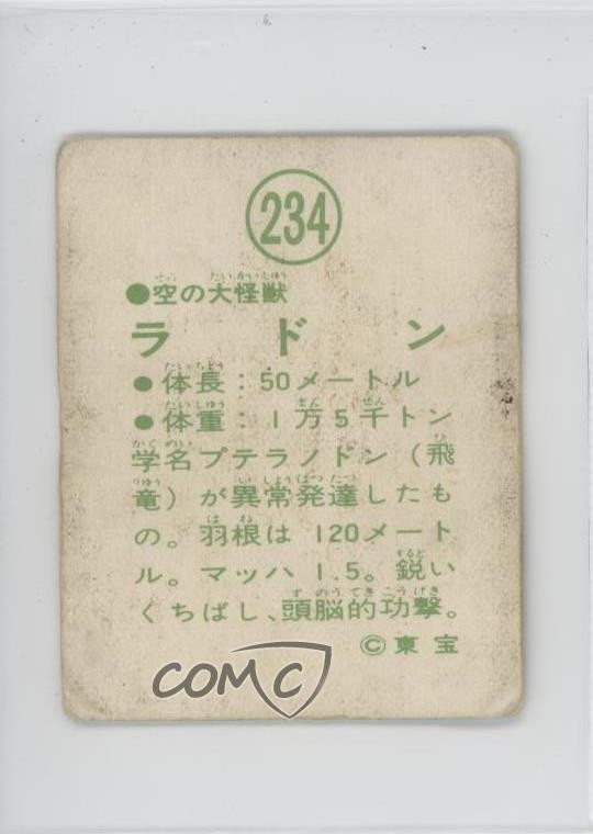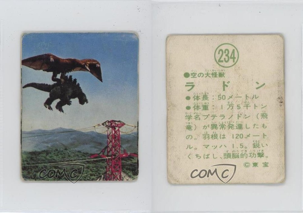 1974 Yamakatsu Godzilla Anthology - [Base] #234 Mothra, Godzilla COMC Item: 248529927 - Non-Sports Card - Featuring Mothra and Godzilla Search for more: 1974 Yamakatsu Godzilla Anthology Search for more: 1974 Yamakatsu Godzilla Anthology - [Base] View all of our Listings Auctions Buy It Now About Us Located in the beautiful Pacific Northwest, COMC (Check Out My Cards) is the world's largest consignment service for trading card singles. More than 10,000 people have used our consignment service to list over 50 million trading cards. Find out how we can help you consign your items on eBay by contacting us through eBay messaging. COMC -- "The Safe & Easy Way to Buy & Sell" Raw Condition for Modern Cards Unless otherwise noted, raw modern cards are listed in Near Mint-Mint condition or better. A NM-MT card appears to be Mint at first glance, but upon closer inspection, may exhibit some of the following: minor print defects (e.g. roller marks, print line, dimple), minor scratches, slight edge wear, and slight corner wear. Centering is clearly visible in the images provided and does not factor into our condition assessment. Raw Condition for Vintage Cards Unless otherwise noted, raw vintage cards are listed in Excellent condition or better. An EX card may exhibit some of the following: minor rounding of corners, surface wear, print defects, light scratches, and slight edge wear/chipping. Centering is clearly visible in the images provided and does not factor into our condition assessment. Domestic Shipping Combined shipping for multiple items is available. To receive combined shipping, please ensure all desired items are in your eBay shopping cart before proceeding to checkout. eBay limits orders to 40 items per order. We automatically combine multiple orders placed on the same day. If you place multiple orders on the same day, please contact us to request a refund of applicable shipping costs. Signature confirmation may be required on invoices over $400. All cards are protected and shipped securely. International Shipping COMC offers eBay's International Shipping (EIS) for international orders under $2,500* (see country exceptions below). All duties and import fees are paid at checkout; in the rare event that there are additional import fees upon delivery, these are borne by the buyer. EIS packages route through a shipping hub in Erlanger, KY before shipping to their final destination. Please note that EIS does not allow for combined shipments. The shipping rates are determined by eBay and cannot be adjusted. *Maximum sale price exceptions: Colombia, Kuwait ($2,000); Taiwan ($1,539); Chile, Costa Rica, Guatemala, Honduras, Trinidad and Tobago ($1,000); Antigua and Barbuda, Aruba, Belize, Dominica, Grenada, Philippines, Saint Kitts and Nevis, Saint Lucia, Montserrat, Turks and Caicos Islands ($500); Dominican Republic, El Salvador ($200). Please request a shipping quote through eBay messaging for orders that exceed the maximum sale price supported by eBay's International Shipping. You will be responsible for all duties and import fees for international orders shipped outside the EIS. All cards are protected and shipped securely. Payment COMC does not accept offers on our cards through our eBay storefront. COMC utilizes eBay’s managed payments system. If you are experiencing difficulties making a payment, please contact eBay for assistance. Return Policy Returns are only accepted on the rare occasion the item is not as described. If you are making a return, please initiate the return process through eBay so a mailing label can be provided for you. Prior to listing, our expert team carefully assessed this item to represent it accurately. Please review the description and high-definition images prior to purchasing to ensure this item meets your satisfaction. We welcome you to contact us if you have further questions about this item. Trust and Integrity COMC carefully assesses each item consigned to us to prevent fraudulent items from entering the marketplace. If you believe an item offered on COMC may be fraudulent, please contact us with details so we can investigate the issue. Items we determine are outside our supported items policy may be removed. Last Modified: 6/12/2025 10:52:06 PM PDT