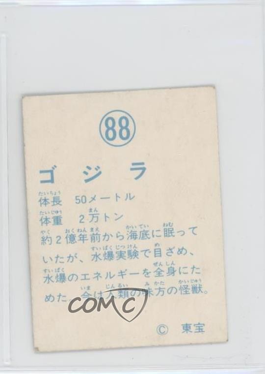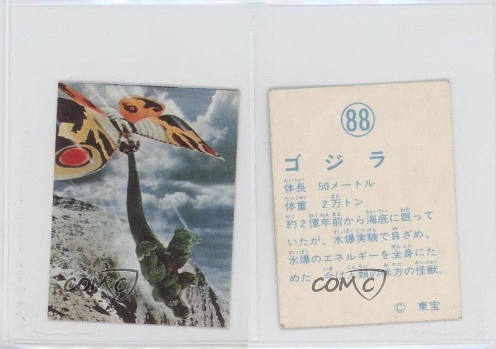 1974 Yamakatsu Godzilla Anthology - [Base] #88 Mothra, Godzilla COMC Item: 212877453 - Non-Sports Card - Featuring Mothra and Godzilla Search for more: 1974 Yamakatsu Godzilla Anthology Search for more: 1974 Yamakatsu Godzilla Anthology - [Base] View all of our Listings Auctions Buy It Now About Us Located in the beautiful Pacific Northwest, COMC (Check Out My Cards) is the world's largest consignment service for trading card singles. More than 10,000 people have used our consignment service to list over 50 million trading cards. Find out how we can help you consign your items on eBay by contacting us through eBay messaging. COMC -- "The Safe & Easy Way to Buy & Sell" Raw Condition for Modern Cards Unless otherwise noted, raw modern cards are listed in Near Mint-Mint condition or better. A NM-MT card appears to be Mint at first glance, but upon closer inspection, may exhibit some of the following: minor print defects (e.g. roller marks, print line, dimple), minor scratches, slight edge wear, and slight corner wear. Centering is clearly visible in the images provided and does not factor into our condition assessment. Raw Condition for Vintage Cards Unless otherwise noted, raw vintage cards are listed in Excellent condition or better. An EX card may exhibit some of the following: minor rounding of corners, surface wear, print defects, light scratches, and slight edge wear/chipping. Centering is clearly visible in the images provided and does not factor into our condition assessment. Domestic Shipping Combined shipping for multiple items is available. To receive combined shipping, please ensure all desired items are in your eBay shopping cart before proceeding to checkout. eBay limits orders to 40 items per order. We automatically combine multiple orders placed on the same day. If you place multiple orders on the same day, please contact us to request a refund of applicable shipping costs. Signature confirmation may be required on invoices over $400. All cards are protected and shipped securely. International Shipping COMC offers eBay's International Shipping (EIS) for international orders under $2,500* (see country exceptions below). All duties and import fees are paid at checkout; in the rare event that there are additional import fees upon delivery, these are borne by the buyer. EIS packages route through a shipping hub in Erlanger, KY before shipping to their final destination. Please note that EIS does not allow for combined shipments. The shipping rates are determined by eBay and cannot be adjusted. *Maximum sale price exceptions: Colombia, Kuwait ($2,000); Taiwan ($1,539); Chile, Costa Rica, Guatemala, Honduras, Trinidad and Tobago ($1,000); Antigua and Barbuda, Aruba, Belize, Dominica, Grenada, Philippines, Saint Kitts and Nevis, Saint Lucia, Montserrat, Turks and Caicos Islands ($500); Dominican Republic, El Salvador ($200). Please request a shipping quote through eBay messaging for orders that exceed the maximum sale price supported by eBay's International Shipping. You will be responsible for all duties and import fees for international orders shipped outside the EIS. All cards are protected and shipped securely. Payment COMC does not accept offers on our cards through our eBay storefront. COMC utilizes eBay’s managed payments system. If you are experiencing difficulties making a payment, please contact eBay for assistance. Return Policy Returns are only accepted on the rare occasion the item is not as described. If you are making a return, please initiate the return process through eBay so a mailing label can be provided for you. Prior to listing, our expert team carefully assessed this item to represent it accurately. Please review the description and high-definition images prior to purchasing to ensure this item meets your satisfaction. We welcome you to contact us if you have further questions about this item. Trust and Integrity COMC carefully assesses each item consigned to us to prevent fraudulent items from entering the marketplace. If you believe an item offered on COMC may be fraudulent, please contact us with details so we can investigate the issue. Items we determine are outside our supported items policy may be removed. Last Modified: 6/7/2025 7:34:55 PM PDT