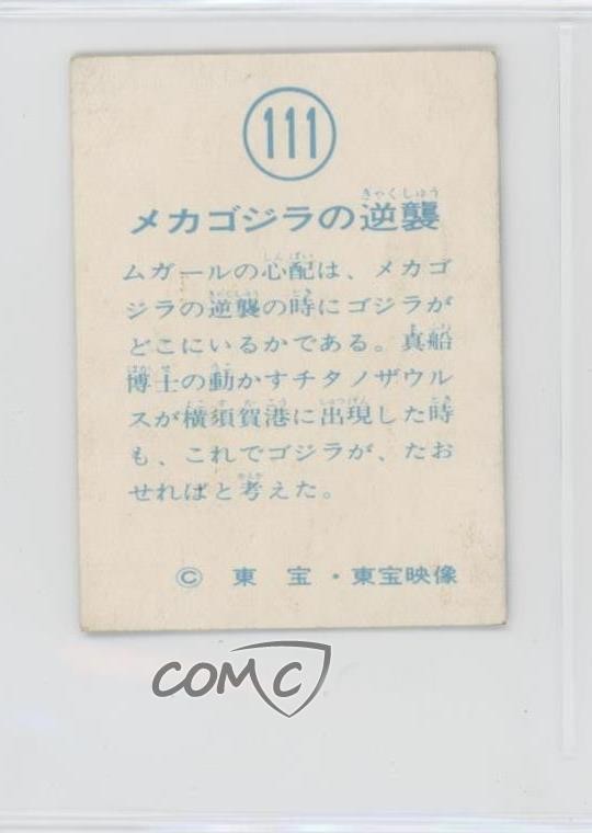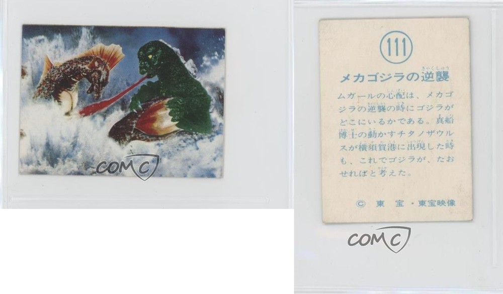 1974 Yamakatsu Godzilla Anthology - [Base] #111 Mechagodzilla's Counter Attack (Terror of Mechagodzilla) COMC Item: 197086807 - Non-Sports Card - Featuring Titanosaurus and Godzilla Search for more: 1974 Yamakatsu Godzilla Anthology Search for more: 1974 Yamakatsu Godzilla Anthology - [Base] View all of our Listings Auctions Buy It Now About Us Located in the beautiful Pacific Northwest, COMC (Check Out My Cards) is the world's largest consignment service for trading card singles. More than 10,000 people have used our consignment service to list over 50 million trading cards. Find out how we can help you consign your items on eBay by contacting us through eBay messaging. COMC -- "The Safe & Easy Way to Buy & Sell" Raw Condition for Modern Cards Unless otherwise noted, raw modern cards are listed in Near Mint-Mint condition or better. A NM-MT card appears to be Mint at first glance, but upon closer inspection, may exhibit some of the following: minor print defects (e.g. roller marks, print line, dimple), minor scratches, slight edge wear, and slight corner wear. Centering is clearly visible in the images provided and does not factor into our condition assessment. Raw Condition for Vintage Cards Unless otherwise noted, raw vintage cards are listed in Excellent condition or better. An EX card may exhibit some of the following: minor rounding of corners, surface wear, print defects, light scratches, and slight edge wear/chipping. Centering is clearly visible in the images provided and does not factor into our condition assessment. Domestic Shipping Combined shipping for multiple items is available. To receive combined shipping, please ensure all desired items are in your eBay shopping cart before proceeding to checkout. eBay limits orders to 40 items per order. We automatically combine multiple orders placed on the same day. If you place multiple orders on the same day, please contact us to request a refund of applicable shipping costs. Signature confirmation may be required on invoices over $400. All cards are protected and shipped securely. International Shipping COMC offers eBay's International Shipping (EIS) for international orders under $2,500* (see country exceptions below). All duties and import fees are paid at checkout; in the rare event that there are additional import fees upon delivery, these are borne by the buyer. EIS packages route through a shipping hub in Erlanger, KY before shipping to their final destination. Please note that EIS does not allow for combined shipments. The shipping rates are determined by eBay and cannot be adjusted. *Maximum sale price exceptions: Colombia, Kuwait ($2,000); Taiwan ($1,539); Chile, Costa Rica, Guatemala, Honduras, Trinidad and Tobago ($1,000); Antigua and Barbuda, Aruba, Belize, Dominica, Grenada, Philippines, Saint Kitts and Nevis, Saint Lucia, Montserrat, Turks and Caicos Islands ($500); Dominican Republic, El Salvador ($200). Please request a shipping quote through eBay messaging for orders that exceed the maximum sale price supported by eBay's International Shipping. You will be responsible for all duties and import fees for international orders shipped outside the EIS. All cards are protected and shipped securely. Payment COMC does not accept offers on our cards through our eBay storefront. COMC utilizes eBay’s managed payments system. If you are experiencing difficulties making a payment, please contact eBay for assistance. Return Policy Returns are only accepted on the rare occasion the item is not as described. If you are making a return, please initiate the return process through eBay so a mailing label can be provided for you. Prior to listing, our expert team carefully assessed this item to represent it accurately. Please review the description and high-definition images prior to purchasing to ensure this item meets your satisfaction. We welcome you to contact us if you have further questions about this item. Trust and Integrity COMC carefully assesses each item consigned to us to prevent fraudulent items from entering the marketplace. If you believe an item offered on COMC may be fraudulent, please contact us with details so we can investigate the issue. Items we determine are outside our supported items policy may be removed. Last Modified: 6/23/2025 8:42:59 AM PDT