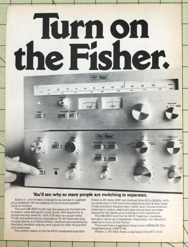 Rare 1975 Fisher FM-2300 CA-2300 Stereo 1-Page Magazine Ad. Condition is used. This is in very good condition suitable for framing. There may be a few flaws caused by age and use so please examine the photos carefully. This is the one you will receive. Ships USPS Ground Advantage in a rigid photo mailer. Dark streak in left corner is a light shadow not a defect. Page size is approx 8 x 11 inches.
