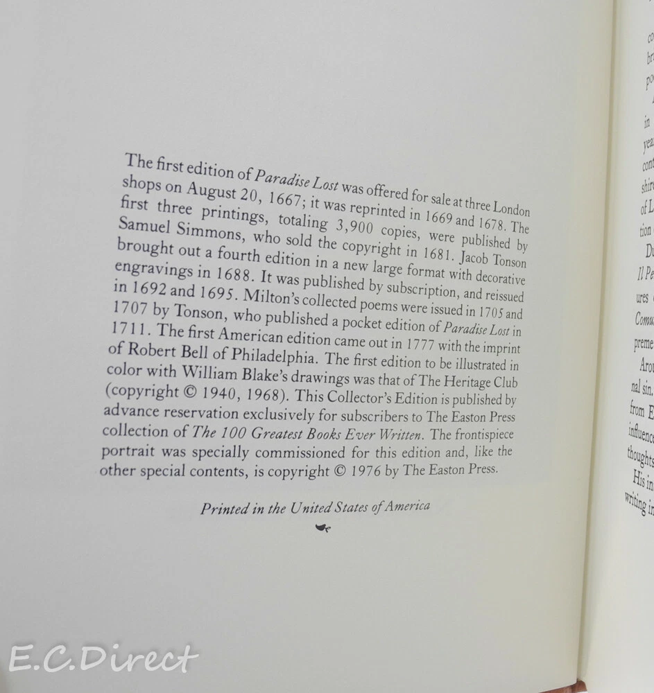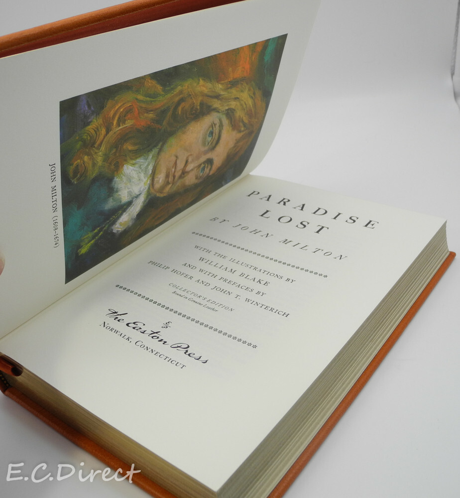 Paradise Lost ~ John Milton Easton Press Published by Easton Press, it is a beautiful, leather bound hardcover edition produced as part of Easton Press' "100 Greatest Books Ever Written". The spine is ribbed and the page edges have a gold gilt. The spine, boards, and page edges are decorated with 22k gold gilt. The book is printed on archival quality paper, has Smyth-sewn pages (so the book will lay open on a table) and comes with a satin page ribbon/marker. See pictures to see actual condition. Most books in this collection of presidential books has a end plate owners sticker, they also mostly have the Collectors notes from Easton. Again, please reference the pictures for these details. Also check the link below for many more Franklin Library, Folio Society and Easton Press. View Other listings or eBay store Store home Leather Books Toys and Games Cast Iron Vintage Postcards Art Glass Other Thank you, E C Direct. Please ask questions before bidding.
