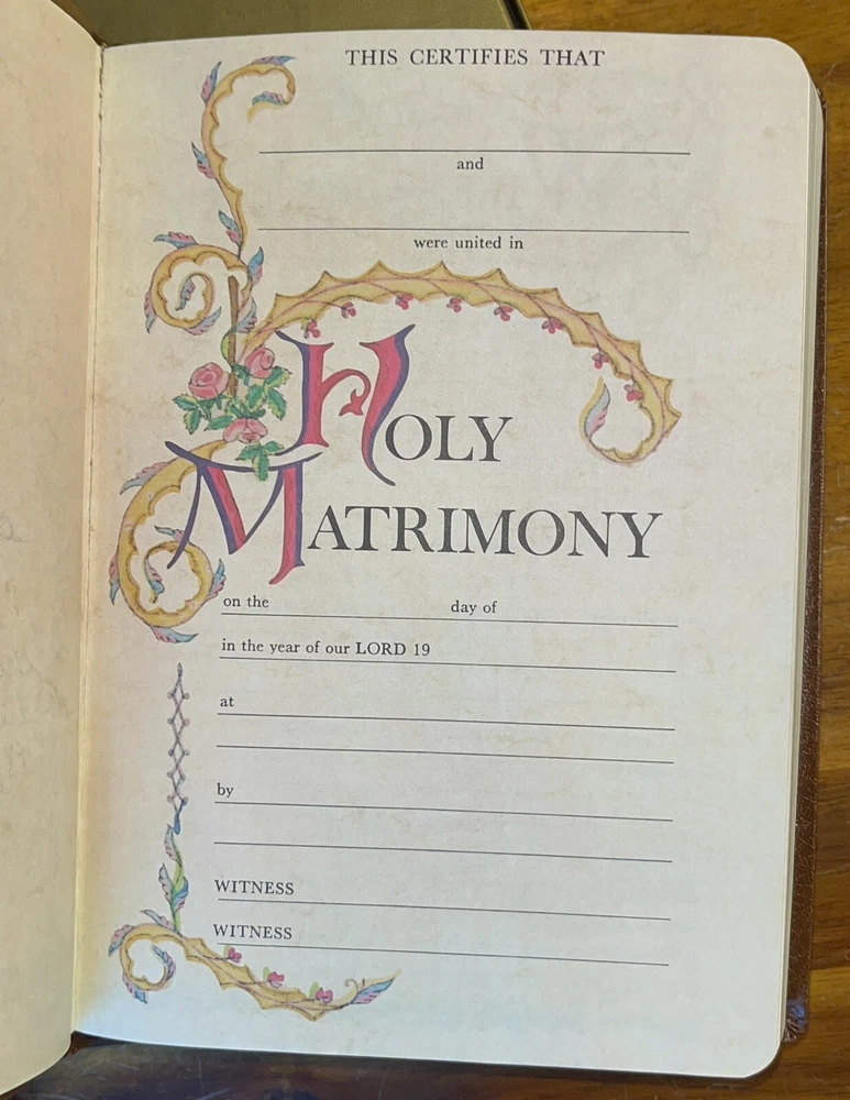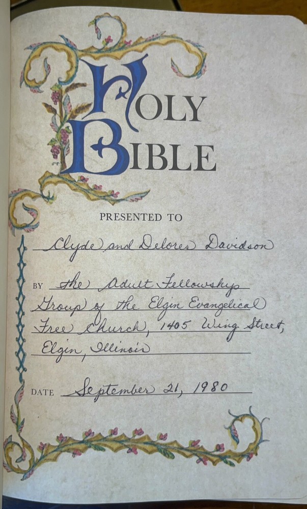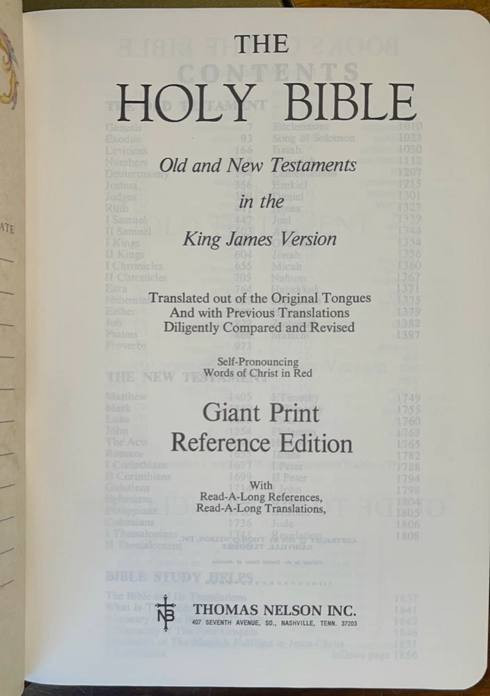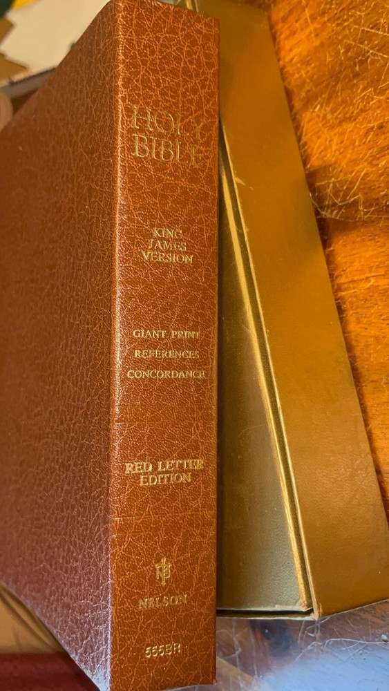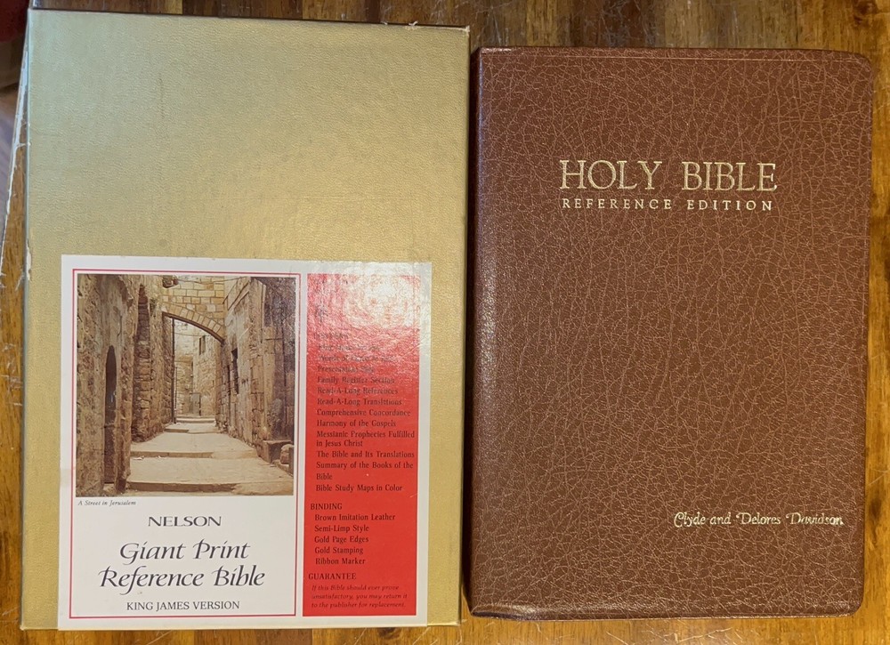 Vintage 1976 Nelson giant print reference Bible, King James Version. Red letter edition with gold edge pages and brown imitation leather binding. Comes in original cardboard box. Previous owners’ names embossed on cover and a dedication is written on the presented to field, signed 1980. See pics for more details.