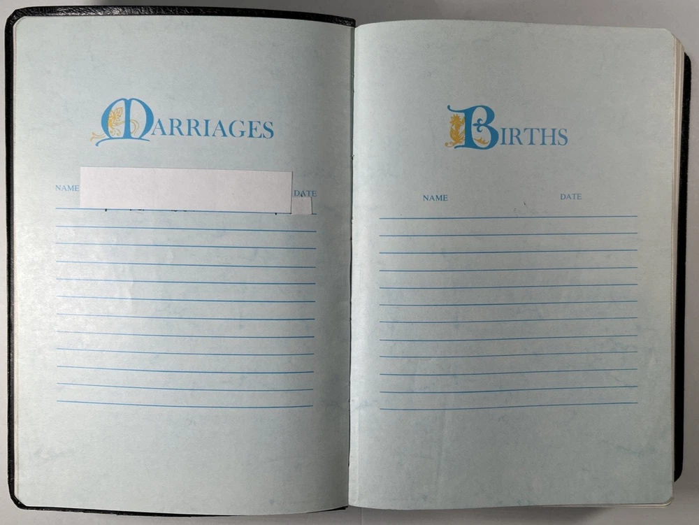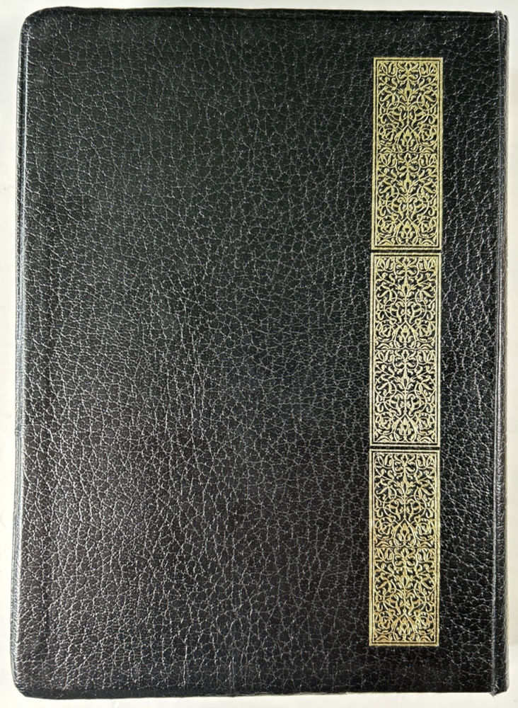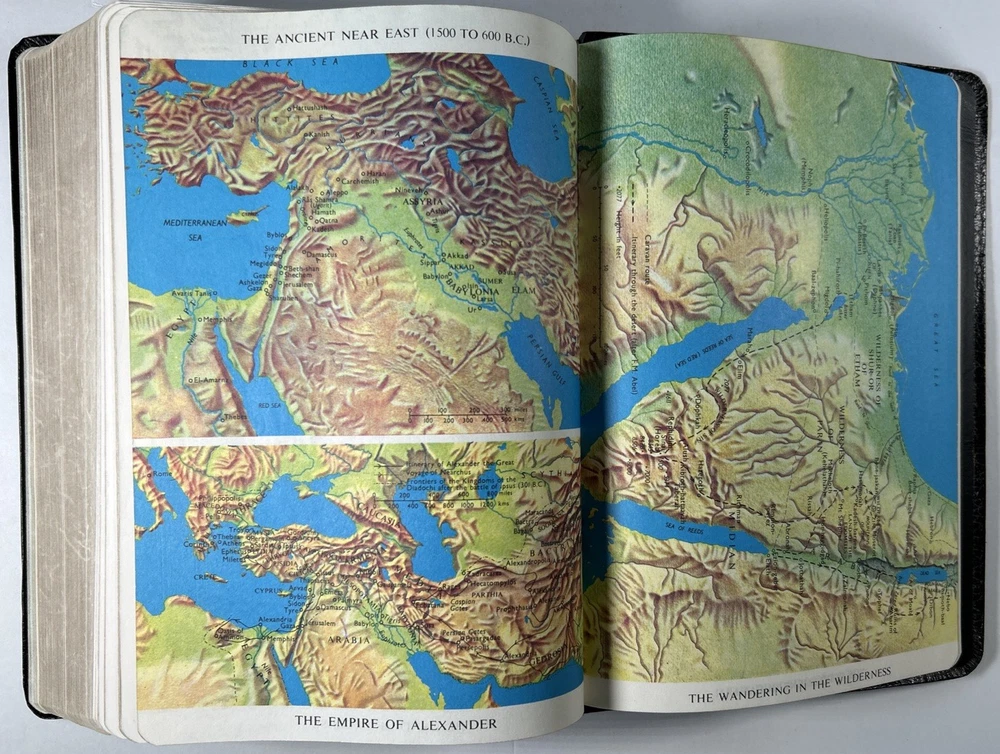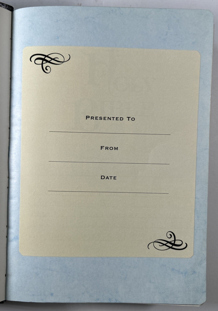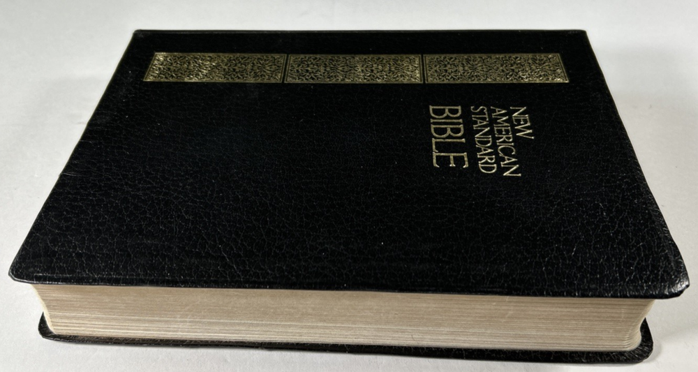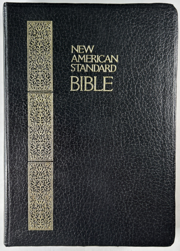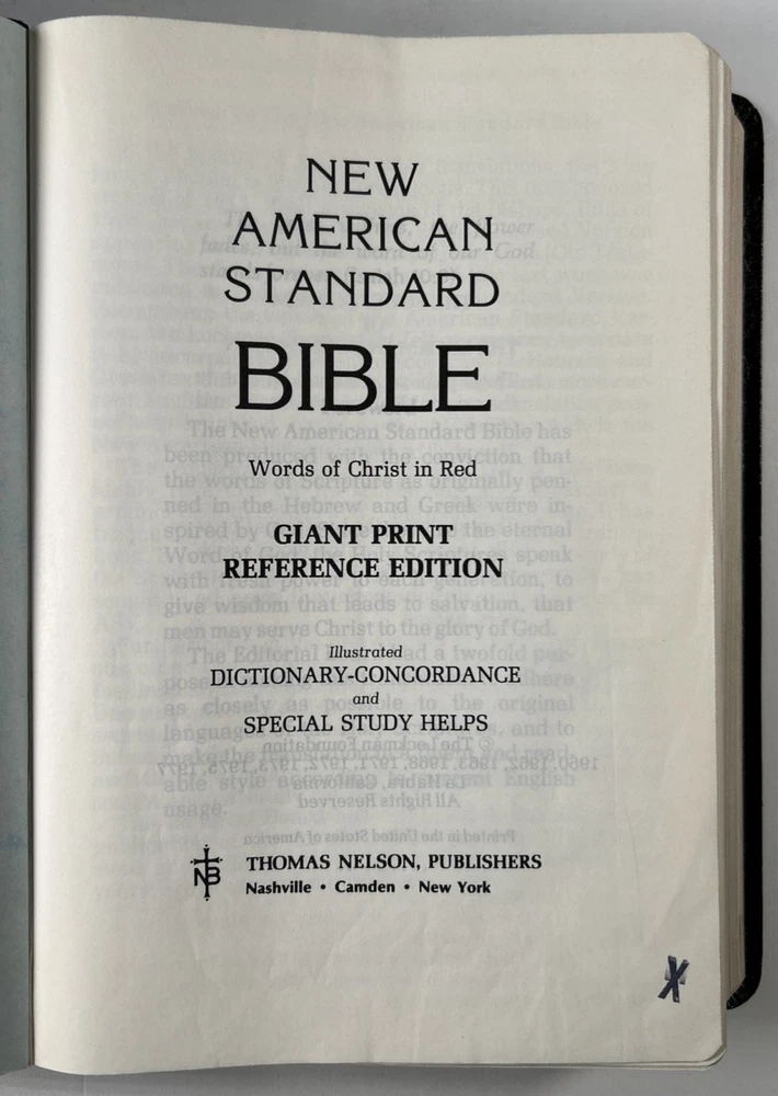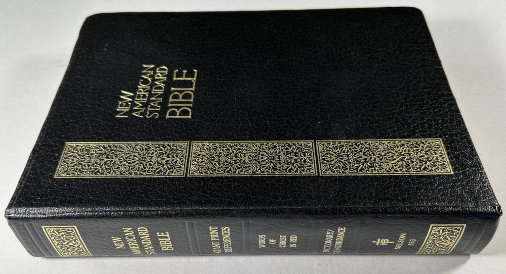 1977 NASB Giant Print Reference Bible Black Imitation Leather Nelson 533. Here are details on this Bible: 1. The print size is a 14 point type. 2. The cover size is 6 3/4" x 9 1/2" x 1 1/2". 3. Here are some of the features of this Bible: *End of verse references. *Ribbon marker. *Words of Christ in red. *Dictionary / Concordance. *Color maps. Listed as "Acceptable", here are details on the condition: The cover and gilding show light wear. The presentation page was filled out and has been covered with an exclusive Presentation page label, see picture five. The marriage page had a name on it which has been covered with an Avery Trueblock label, see picture six. There is underlining spread through the Bible but with the giant print it is still very usable.