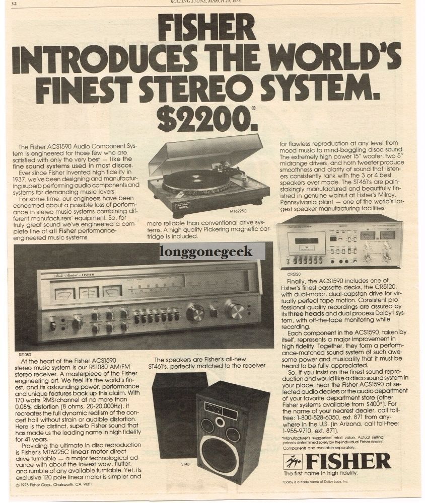 ADVERTISEMENT : 1978 Fisher ACS1590 Audio Component System Stereo Hi-Fi Vtg Print Ad ThSIZE APPROXIMATELY: 12.5" x 10" CONDITION : Excellent...no tears, stains, creases Please note: This sale is for the vintage paper advertisement shown and not the item in the advertisement. It is not a copy, reprint or repro of any kind. Why not purchase one (or more) now! These old advertisements are ideal for: Collectors Historians Museums An intriguing gift Home and Business decor Don't just think of these as old pieces of paper. These are pieces of history. They show the changing fashions, architecture, furniture, design aesthetics and much more over the course of time. Many old ads have detailed info about the product they are advertising and can help with research. They also make a fine substitute for expensive artwork. Many old ads are very beautiful, or have bold graphics; many are drawn and signed by famous artists and illustrators. You could decorate your business, whole house or apartment, man or woman cave with vintage advertisements for the same price as one piece of fine art. Like this item? Why not purchase it now! About The Advertisements All advertisements are carefully removed from the source (magazines, newspapers, books, etc.) and are completely original. No copies, reprints or reproductions of any kind . Most vintage ads were printed on very thin paper and so some of the printing or advertisement from the reverse side may be visible. Ads are shipped flat and are packaged using archival acid-free backing boards and acid-free, clear plastic sleeves. Payment, Shipping and Returns I accept Paypal. Combined Shipping: I only charge shipping for one ad and/or print, no matter how many are purchased, if all items are paid for with a single payment. Items paid for separately will be shipped separately and do not qualify for discounts. If you are having trouble making a combined payment for all your items, please contact me BEFORE making your payment. I may be able to help out and save you some money. 30 day return policy for any reason Thanks for looking!